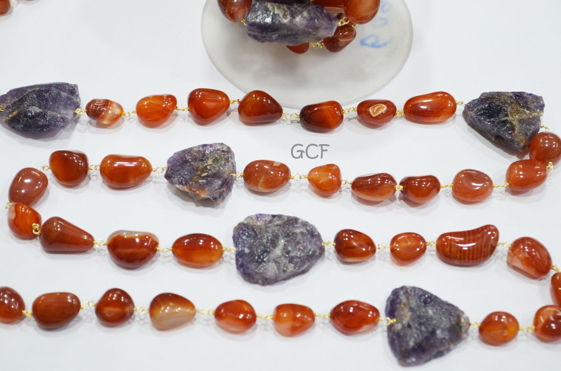 Carnelian Smooth Nuggets Shape Rosary Beaded Chain , Amethyst Raw Nuggets Shape Wire Wrapped Chain , 12x13 - 14x19 mm , RB-7078