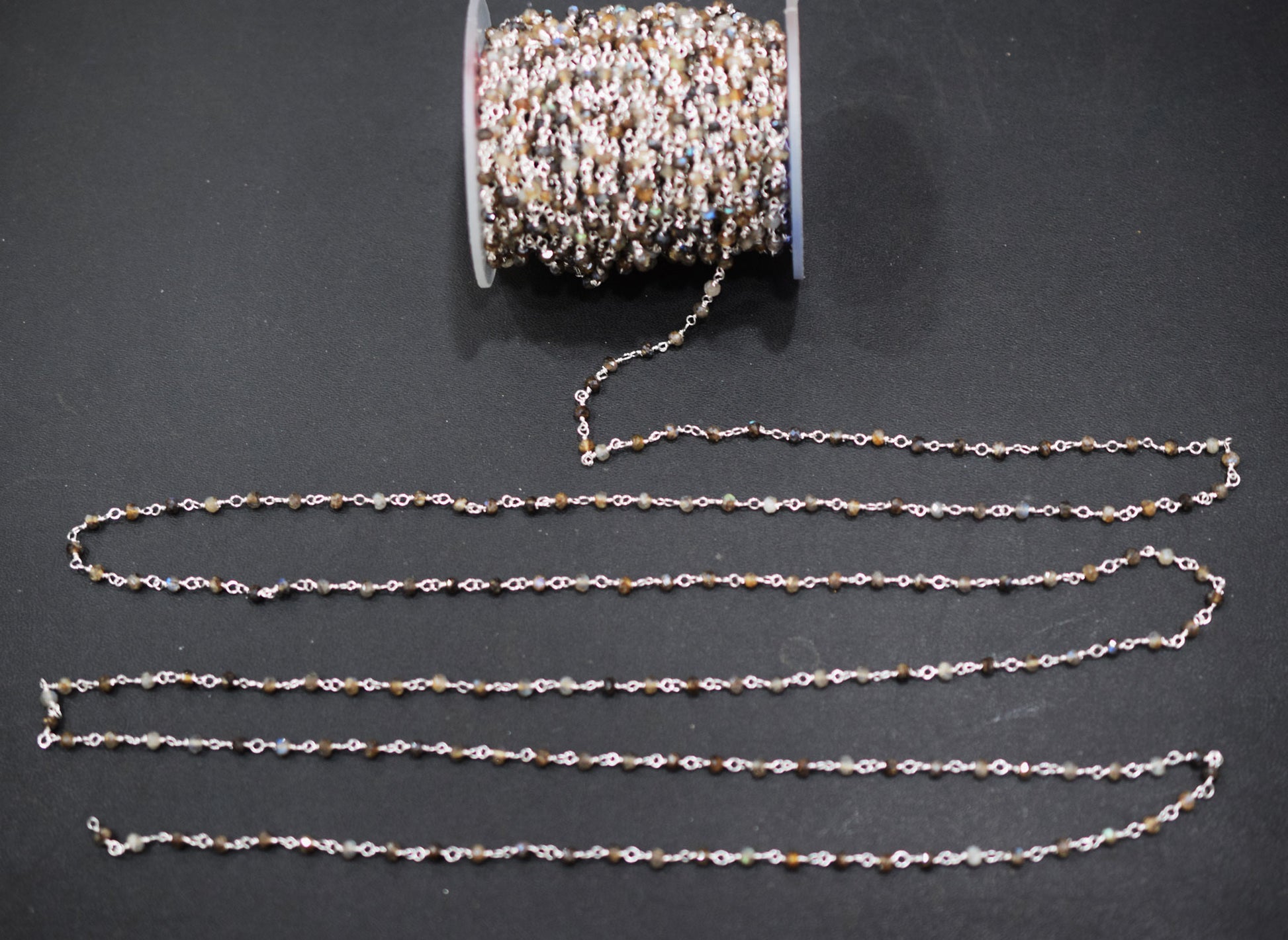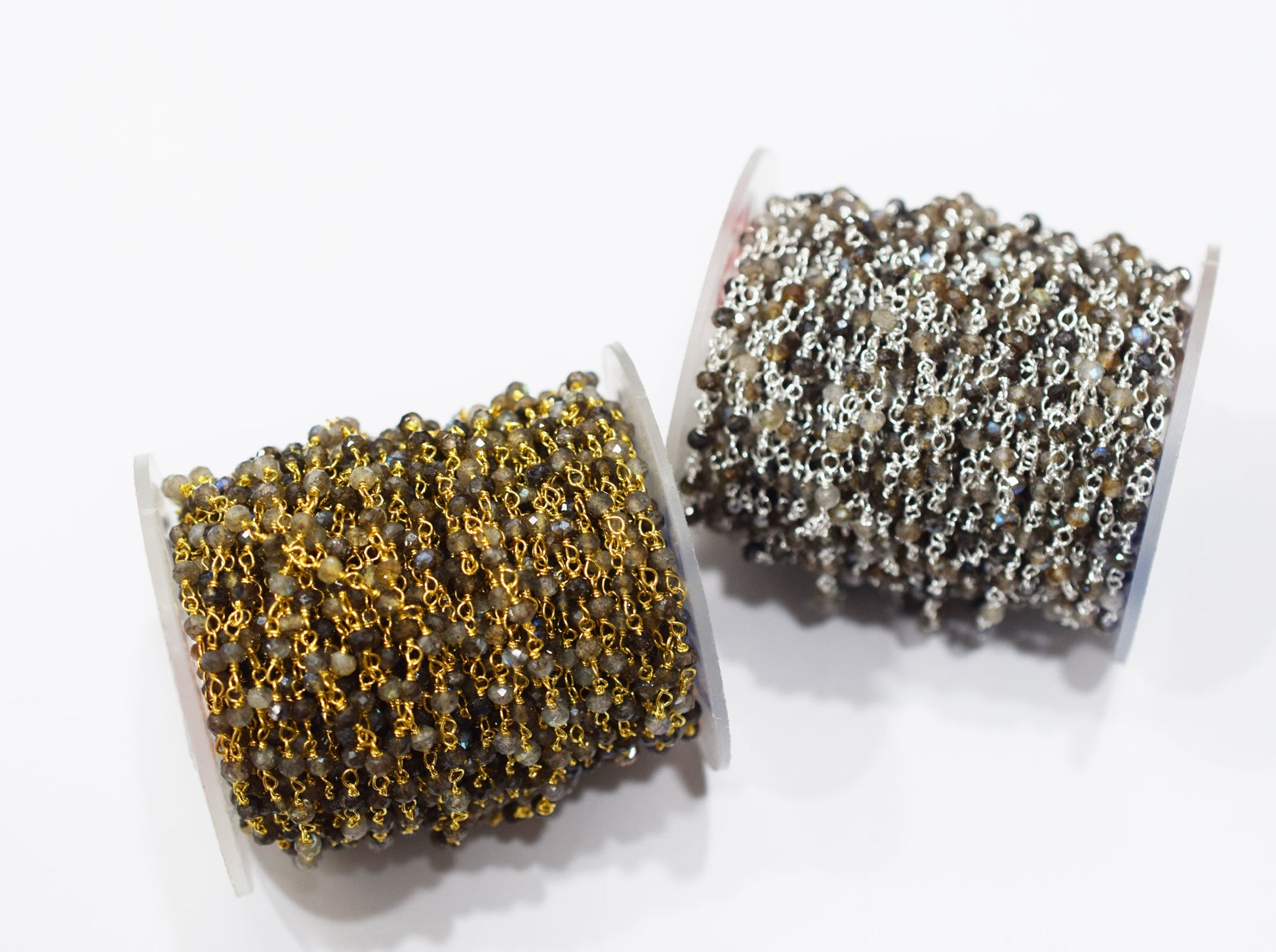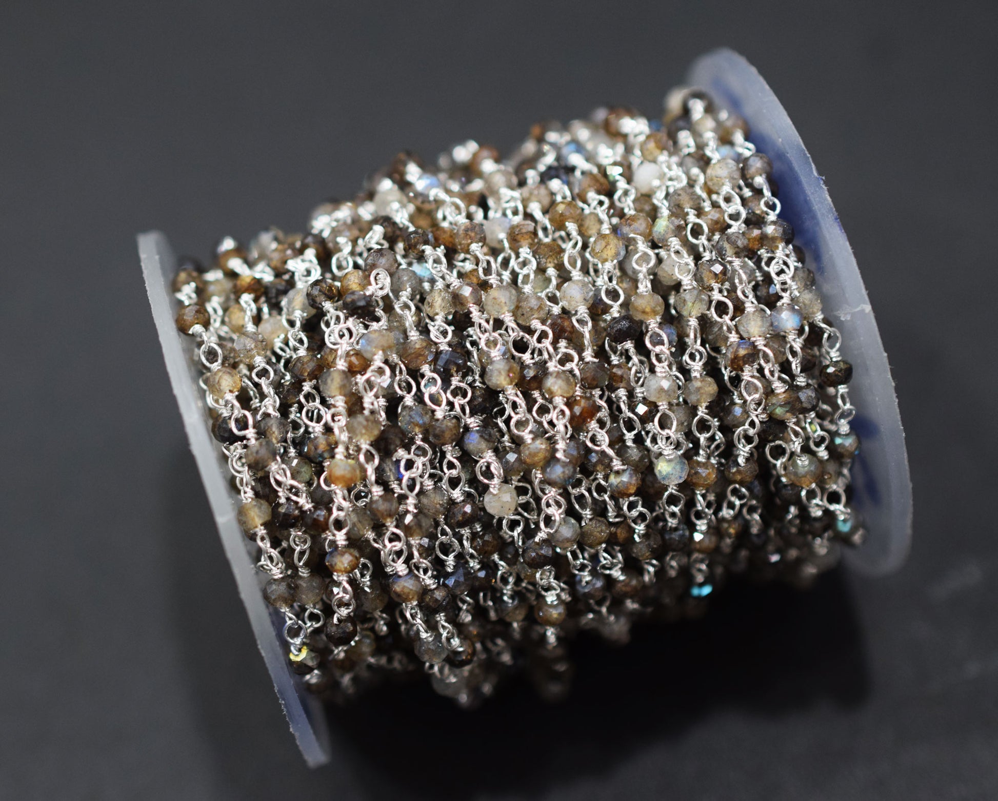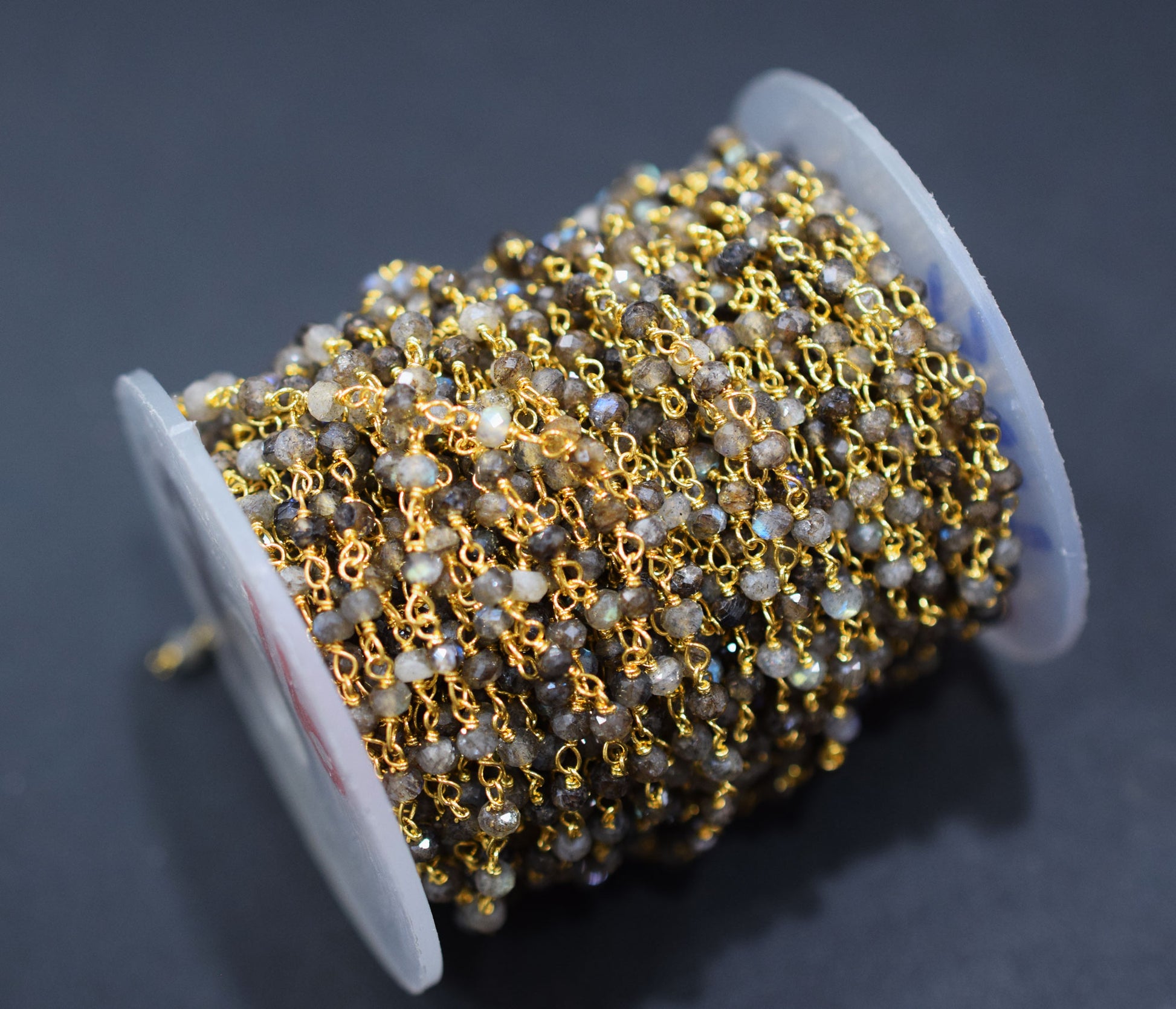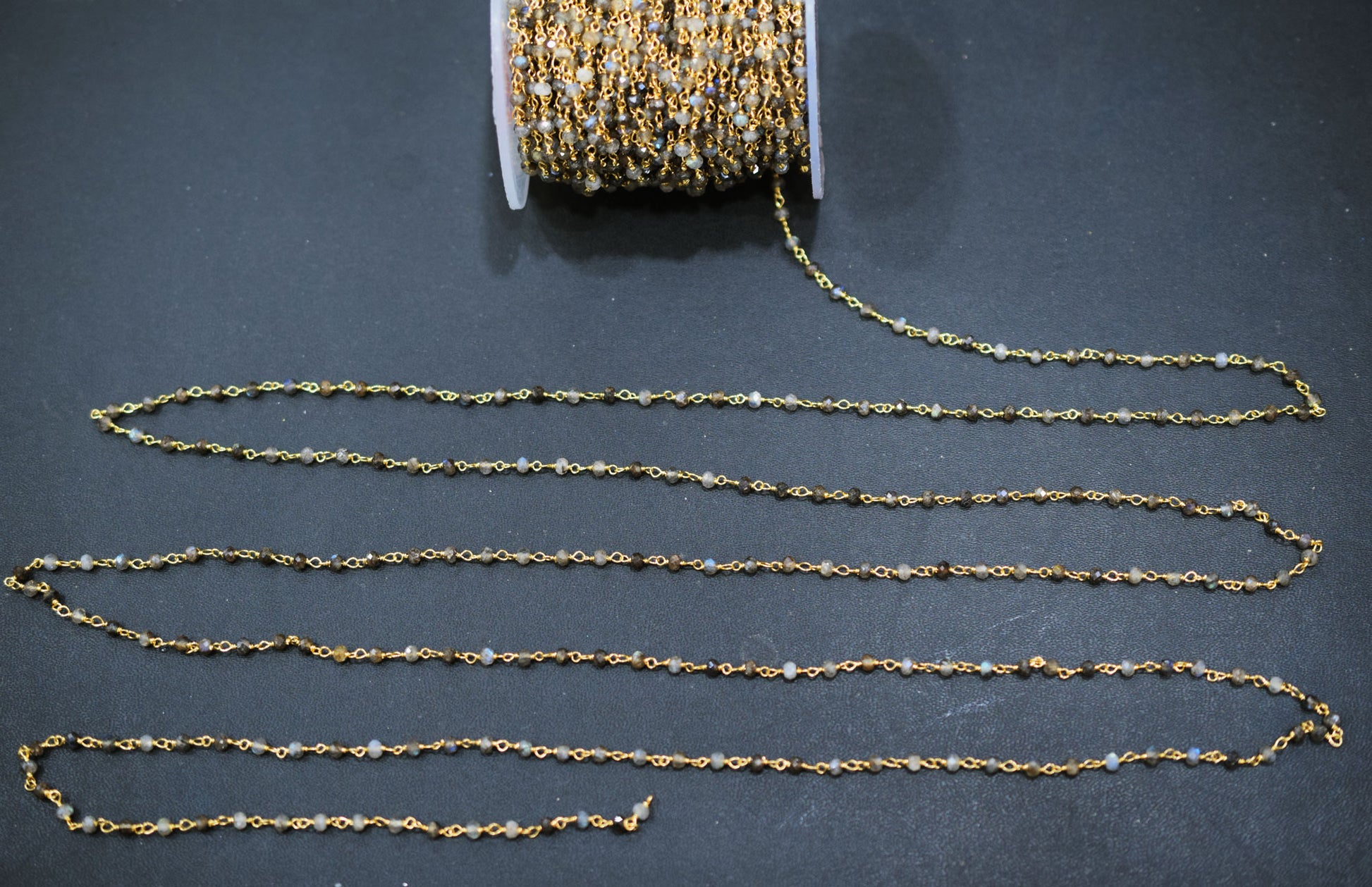Chocolate Labradorite Faceted Rondelle Shape Rosary Beaded Chain , Chocolate Labradorite Wire Wrapped Chain , 3 mm , RB-6684