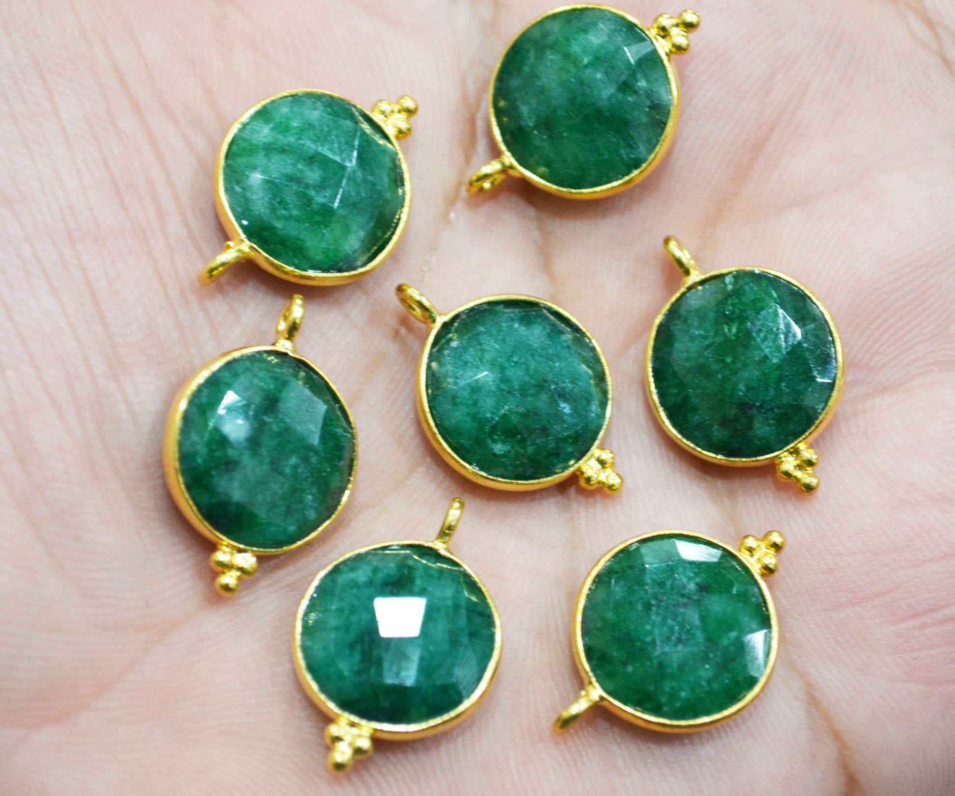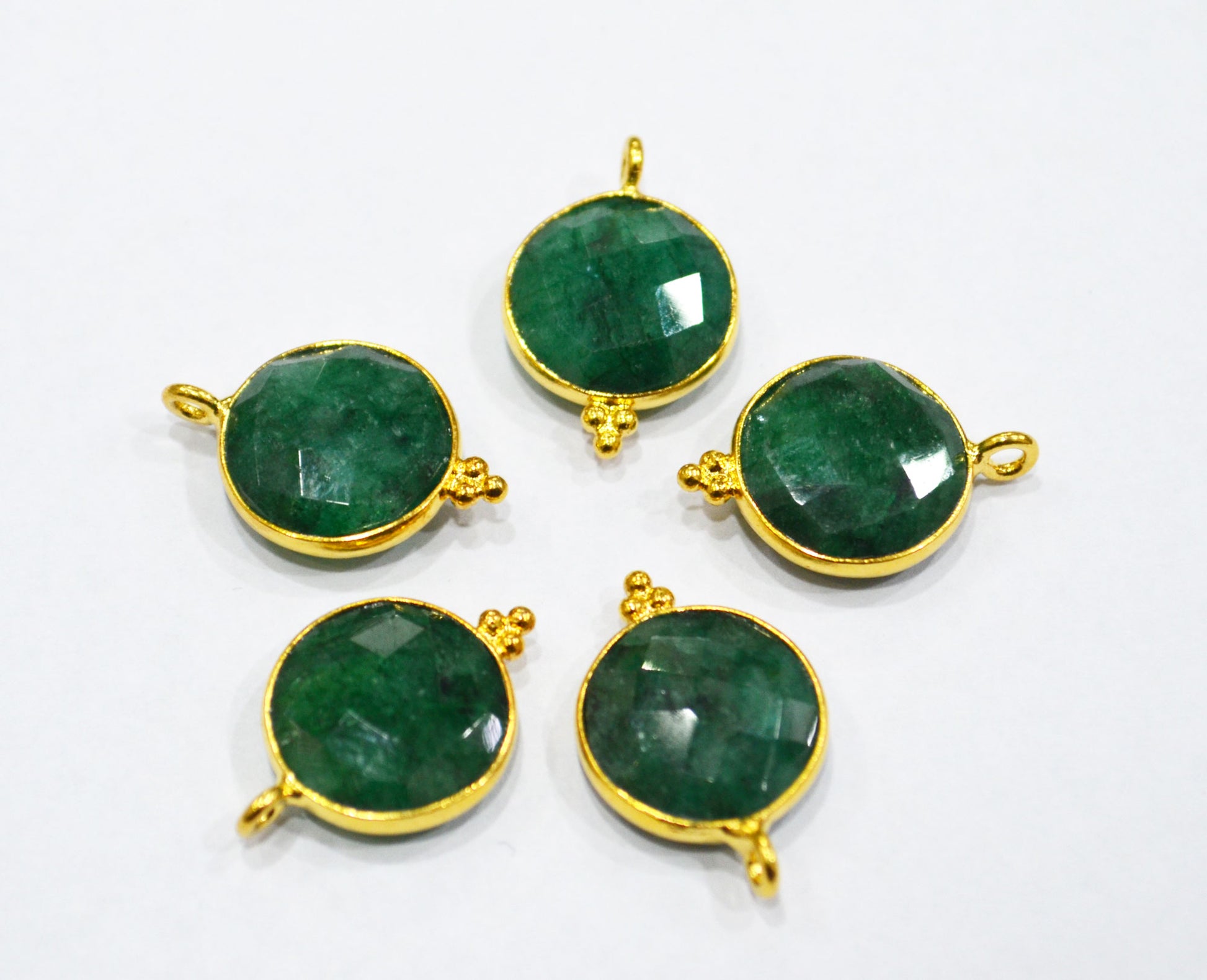 Corundum Emerald Faceted Coin Shape Single Bail Connector With 1 Gm Gold Plating Charm , Sold By Piece , 14 mm , RB-6801