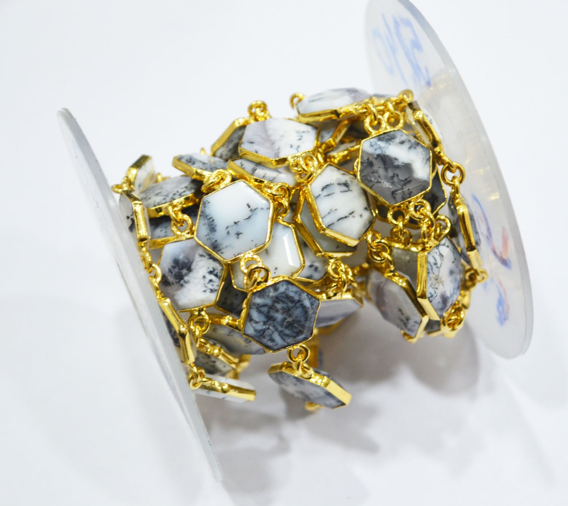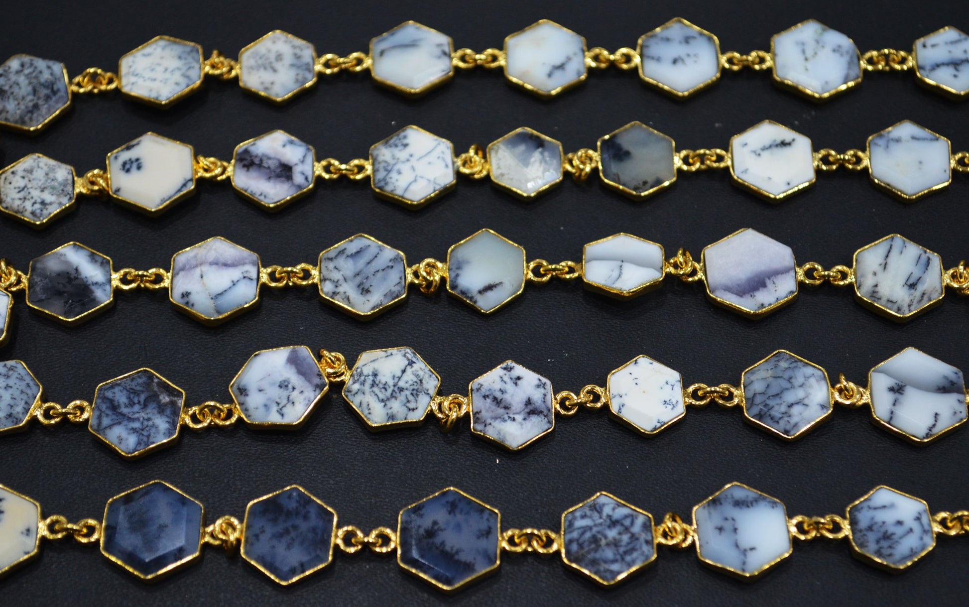 Dendrite Opal Crown Cut Hexagon Shape Connector Chain , 10 - 14 mm , RB-6724
