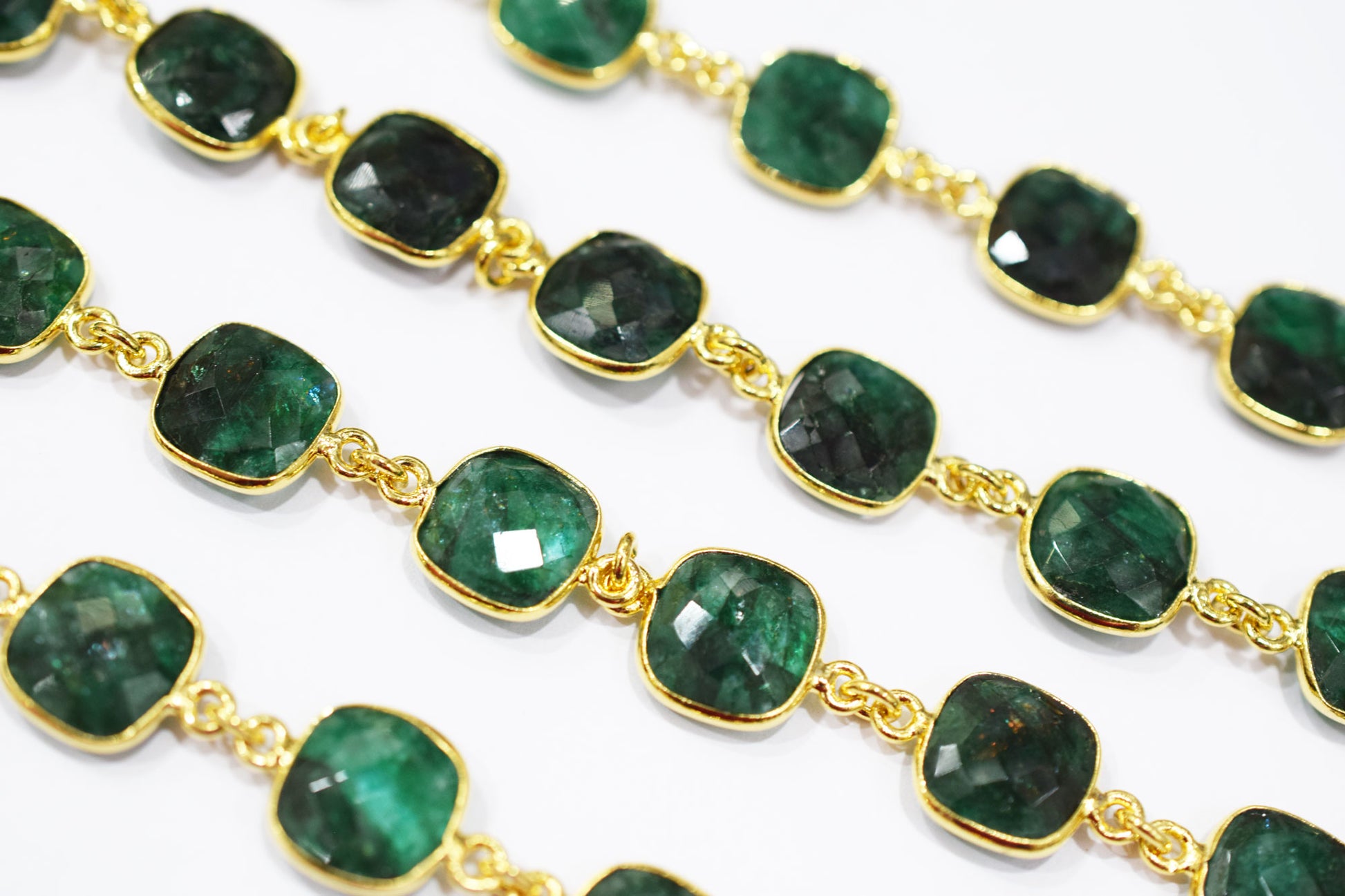 Dyed Emerald Faceted Cushion Shape Connector Chain Β , Dyed Emerald Bezel Link Chain , 12x12 mm , RB-6542