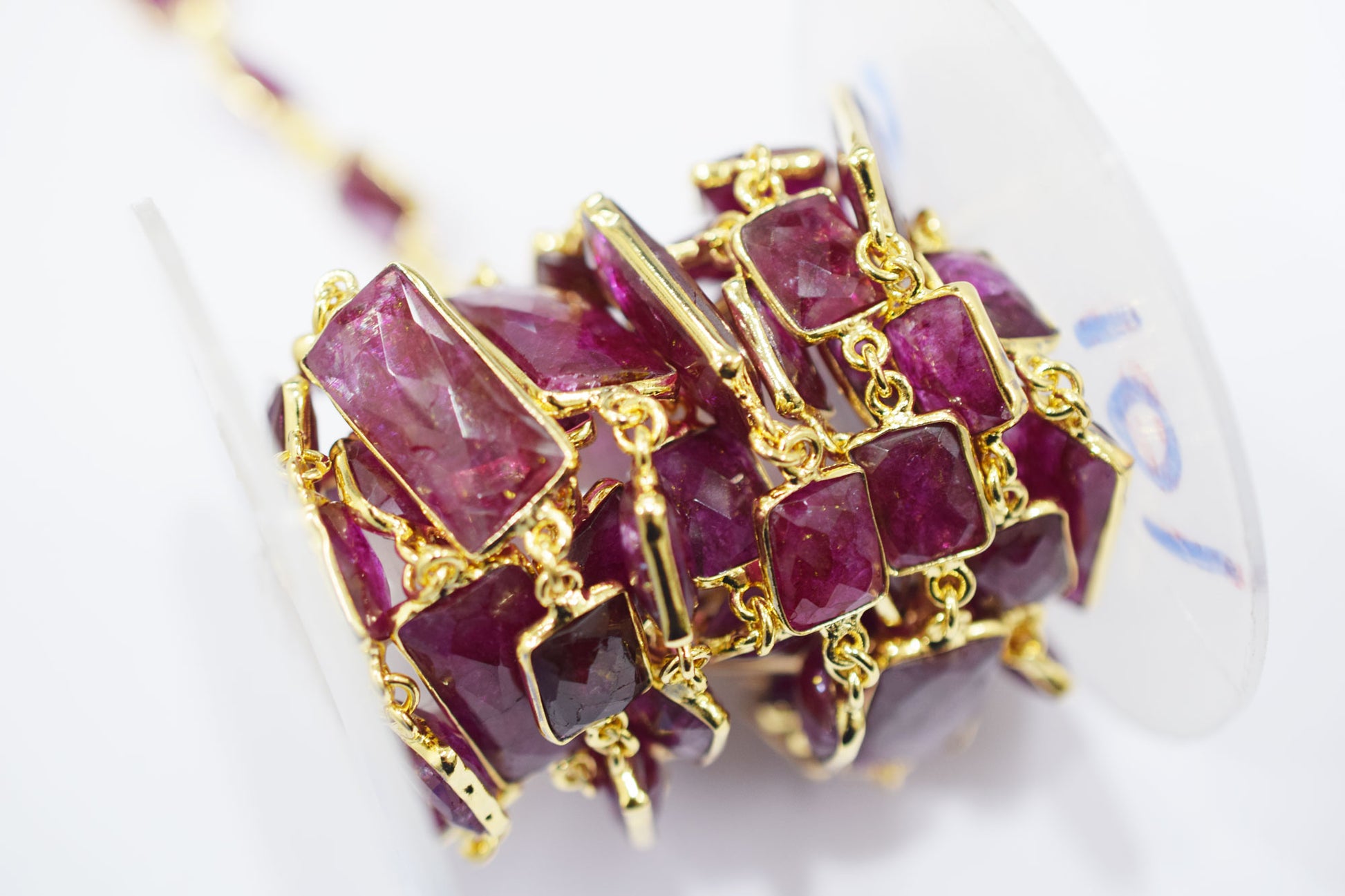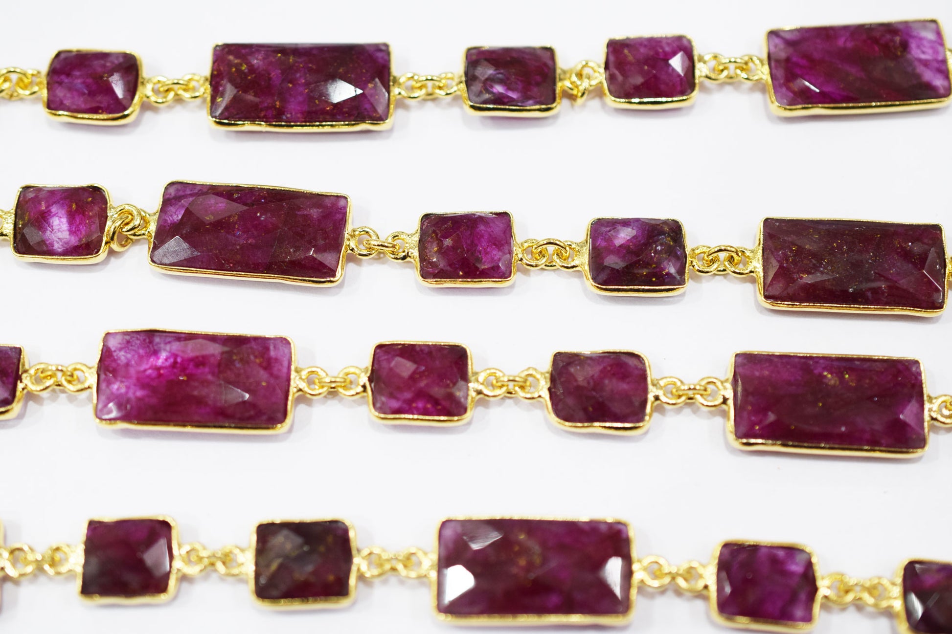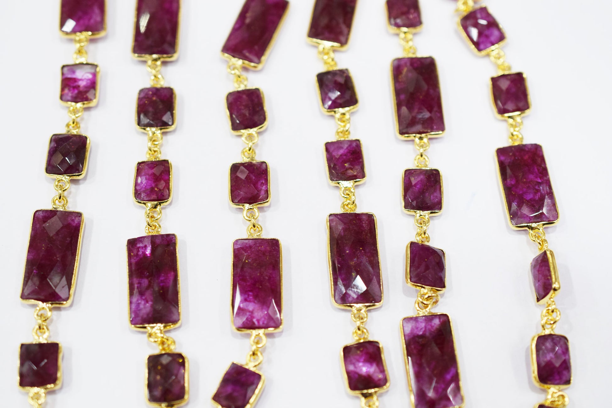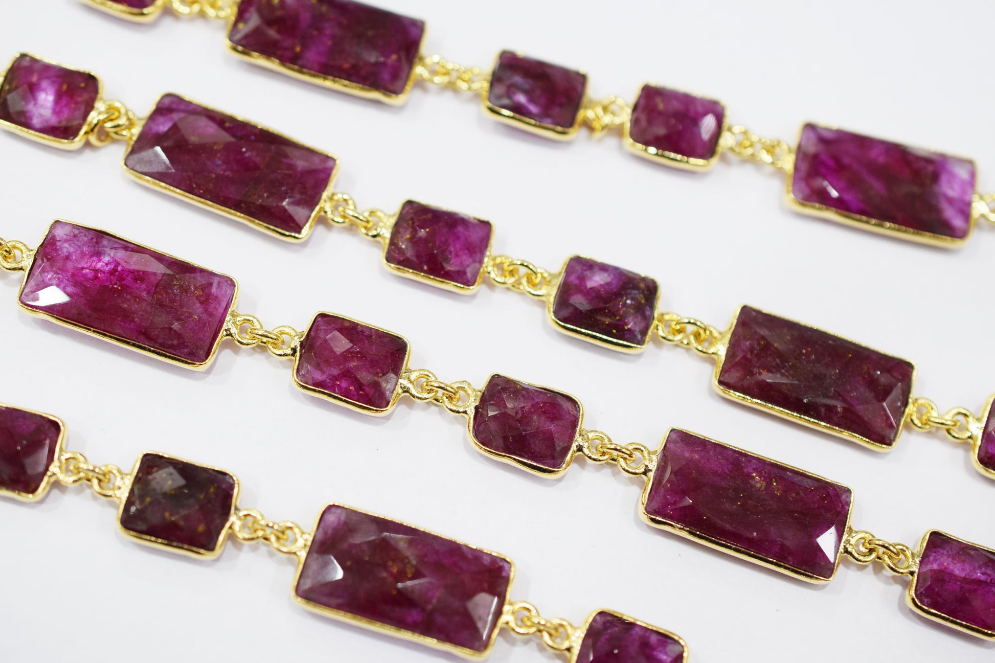 Dyed Ruby Beryl Faceted Baguette Shape Alternate Connector Chain , Dyed Ruby Beryl Bezel Link Chain , 11 - 22 mm , RB-6526
