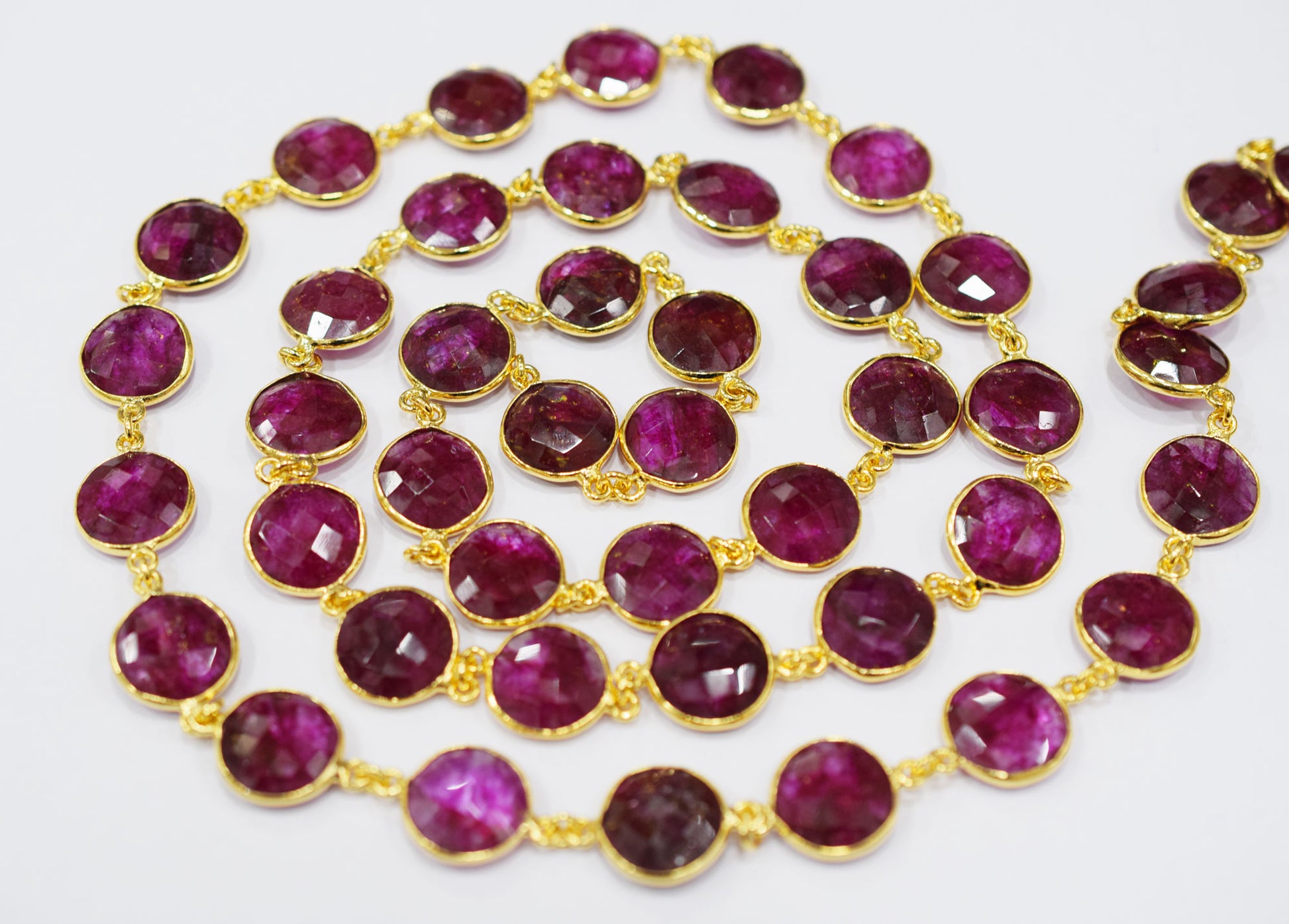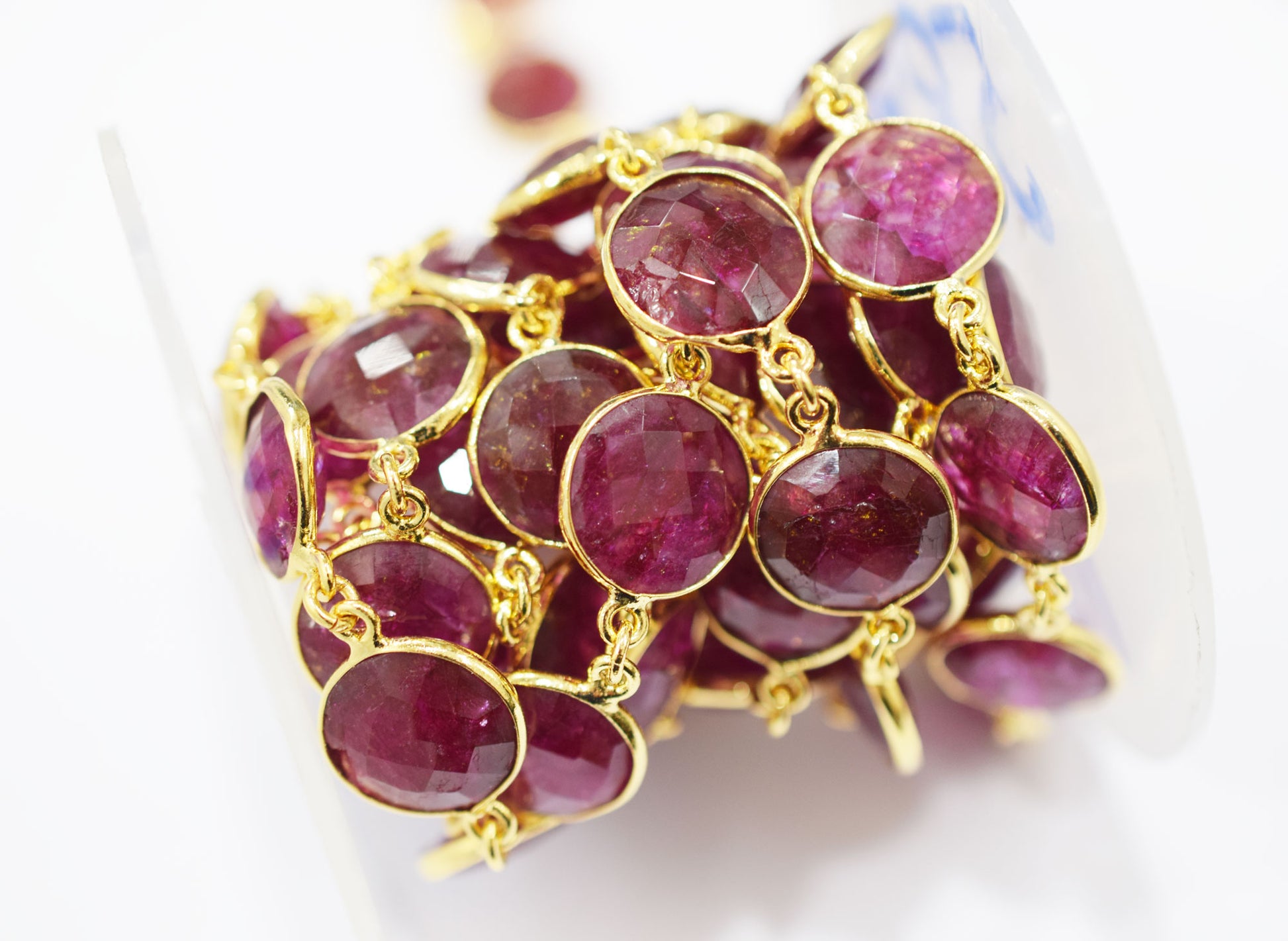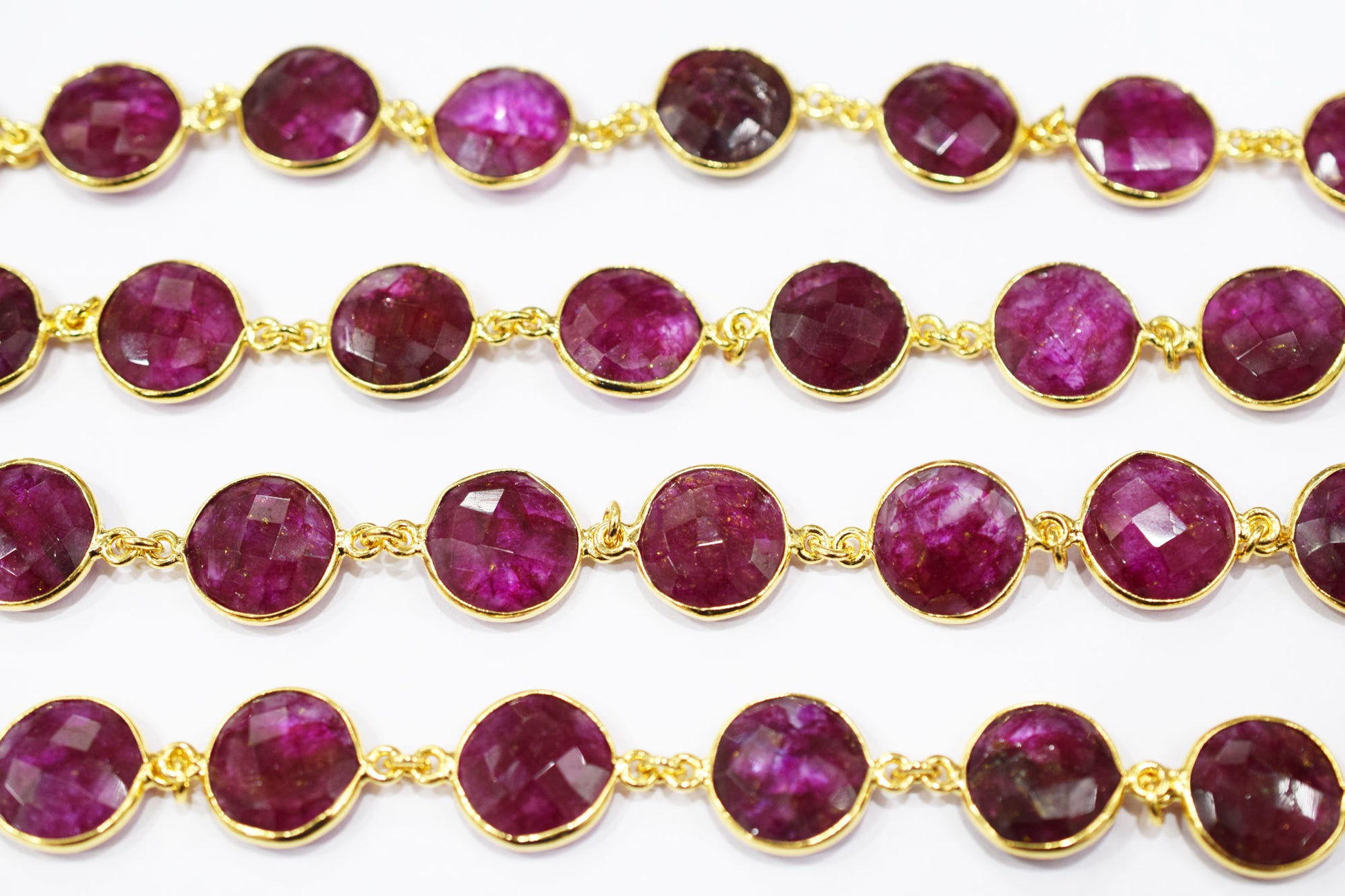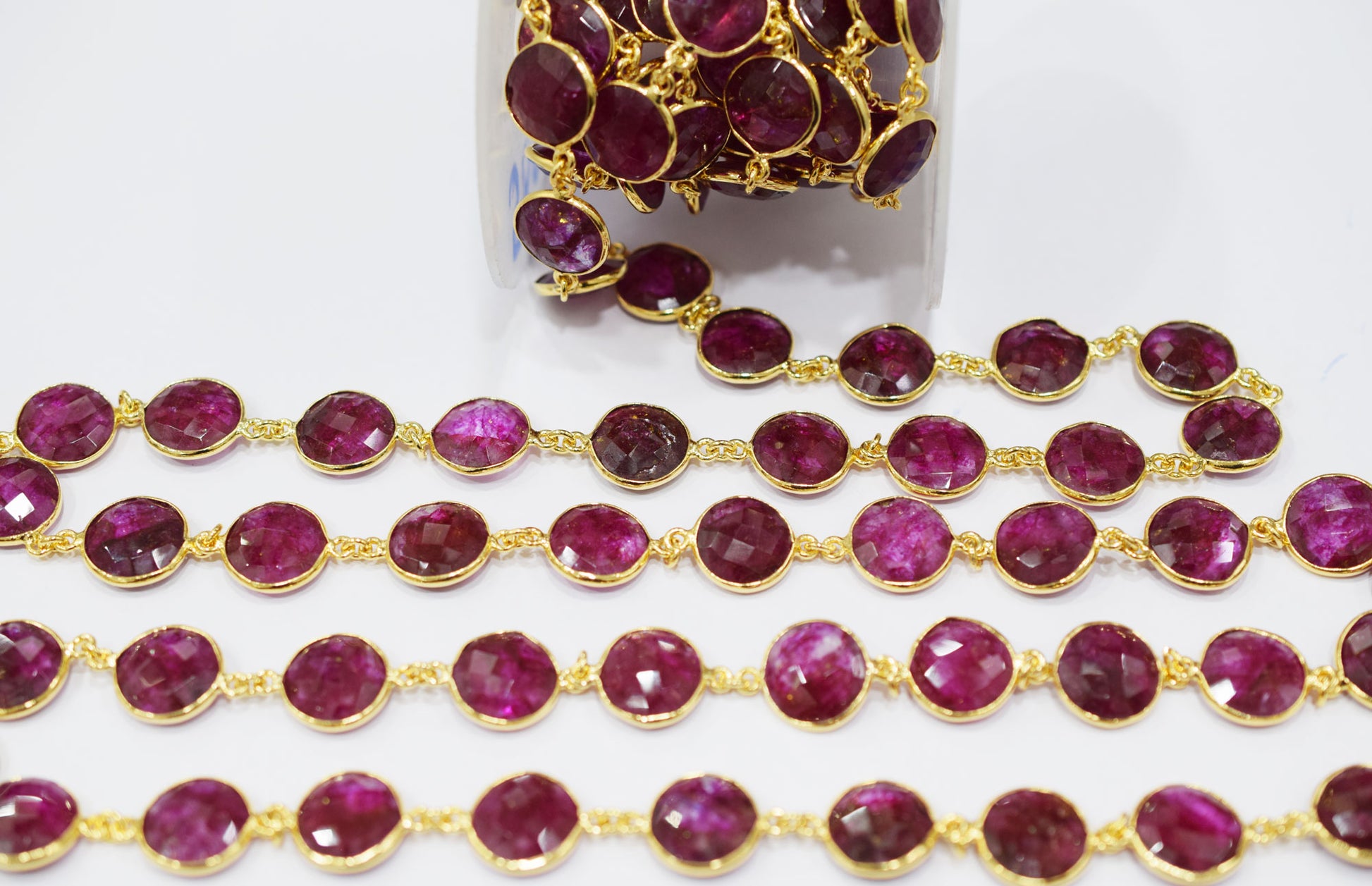 Dyed Ruby Beryl Faceted Coin Shape Connector Chain , Dyed Ruby Beryl Coin Shape Bezel Link Chain , 14 mm , RB-6525