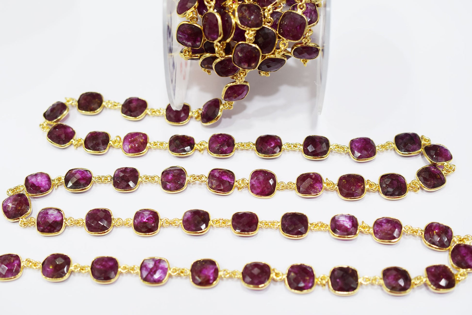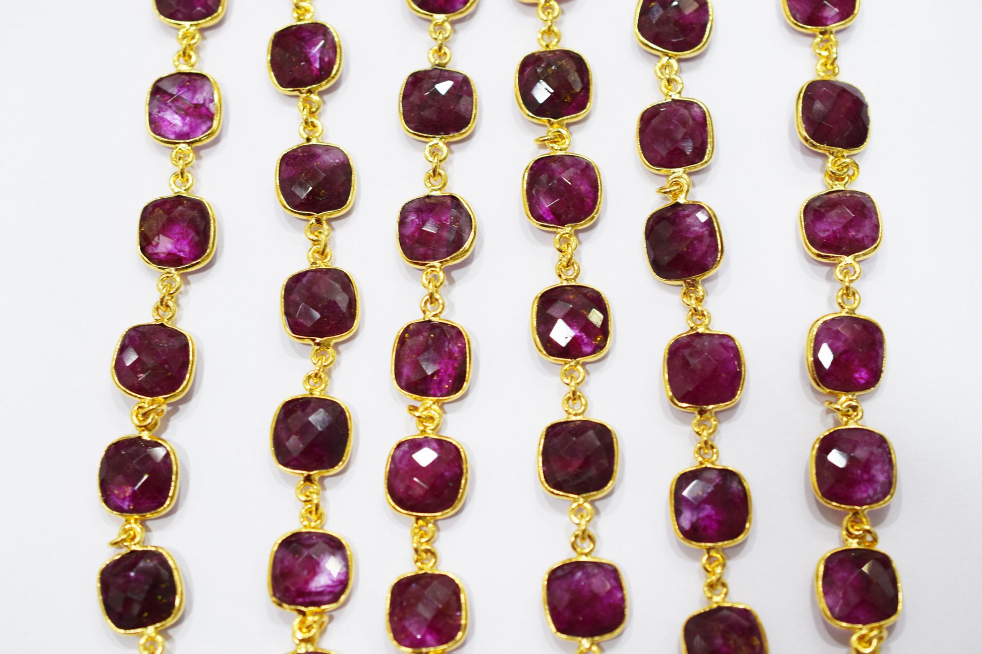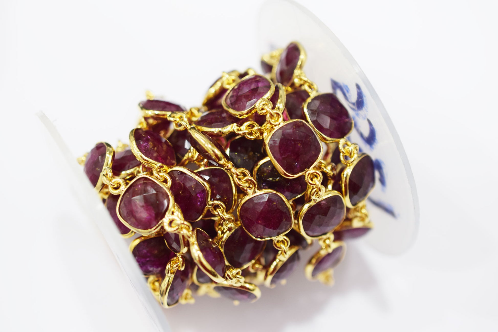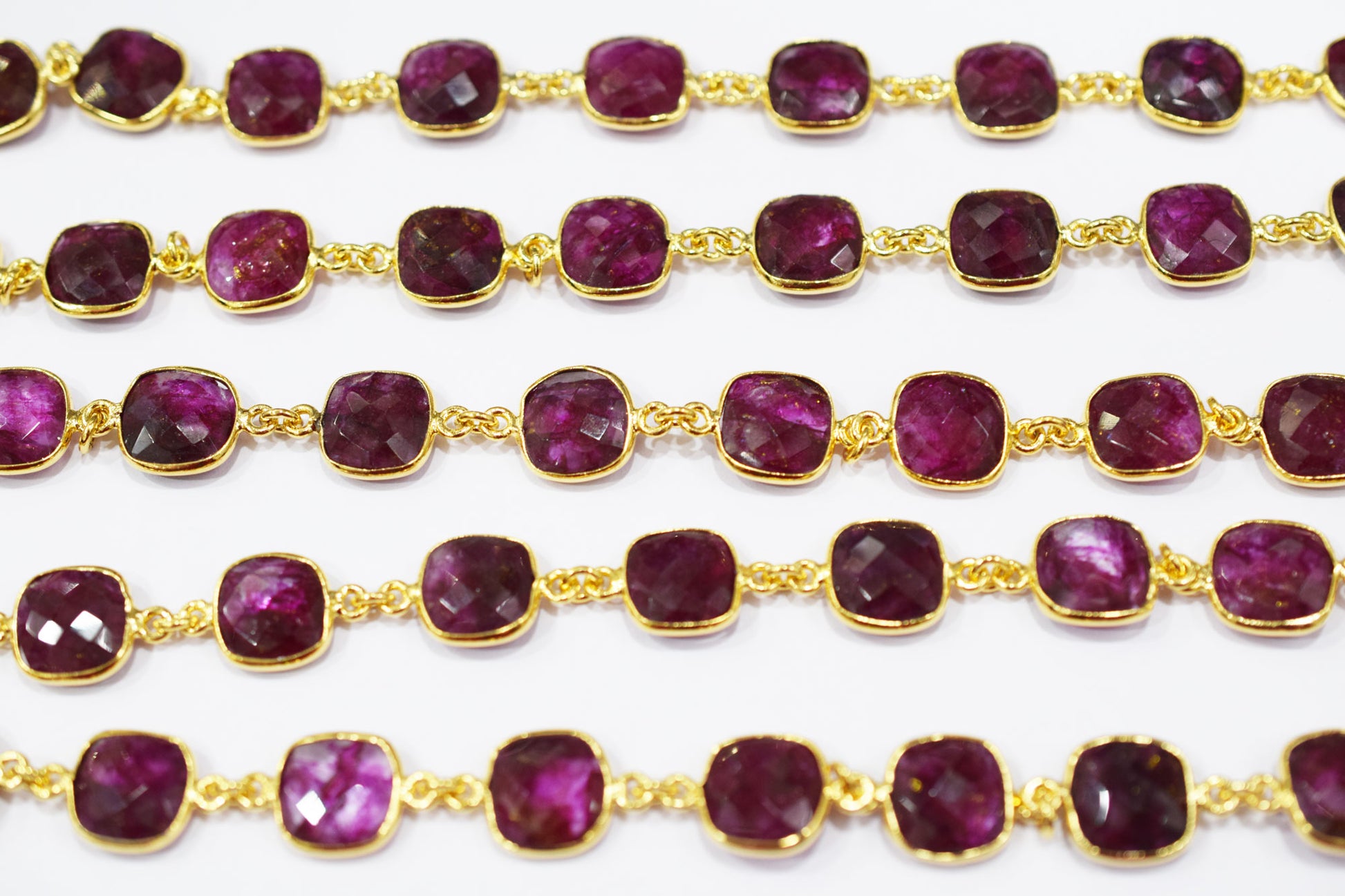 Dyed Ruby Beryl Faceted Cushion Shape Connector Chain , Dyed Ruby Beryl Cushion Shape Bezel Link Chain , 12 mm , RB-6541