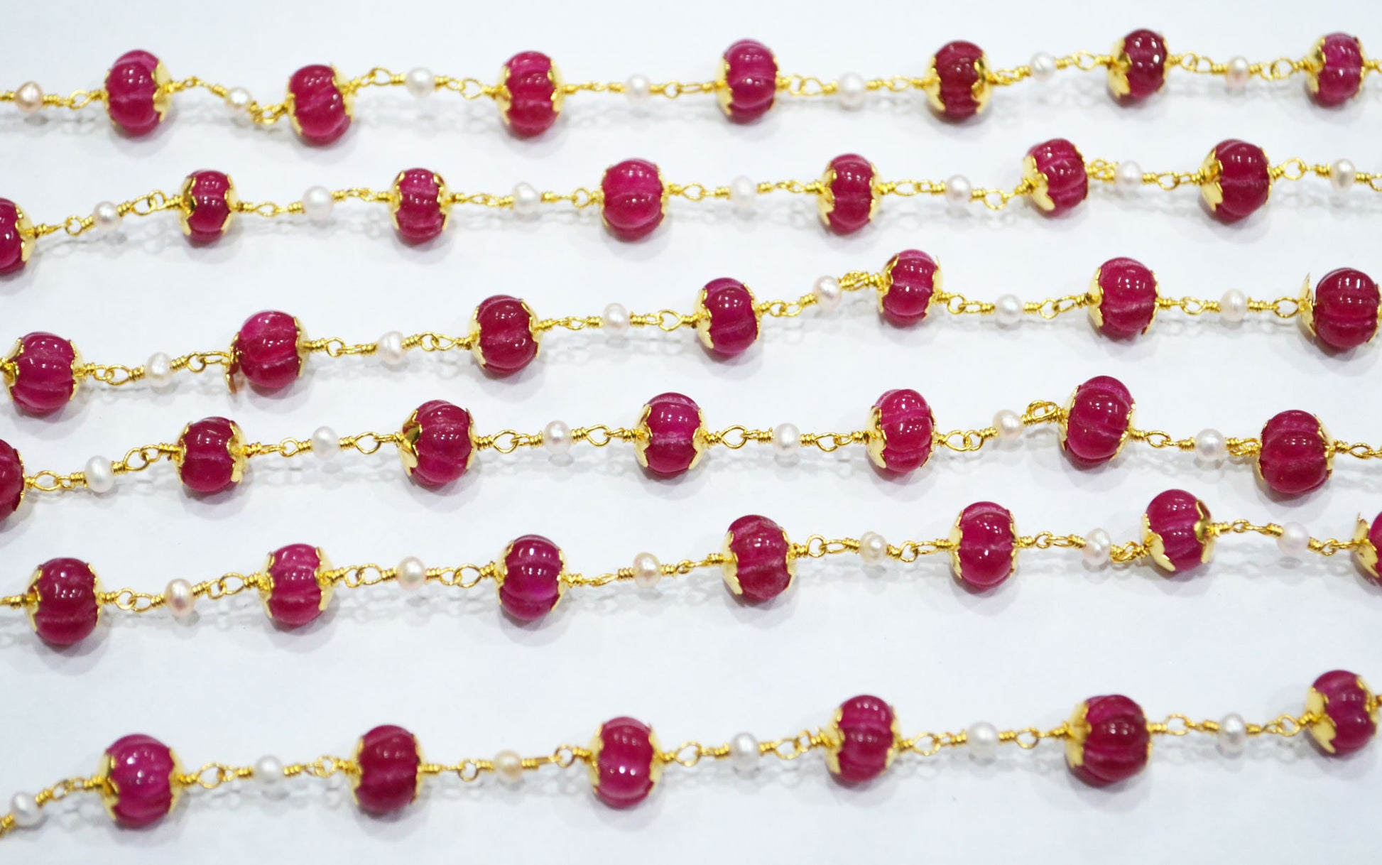 Dyed Ruby Natural Quartz Carved Melons With Natural Pearl Smooth Rondelle Rosary Beaded Chain , 3 - 9 mm , 6709