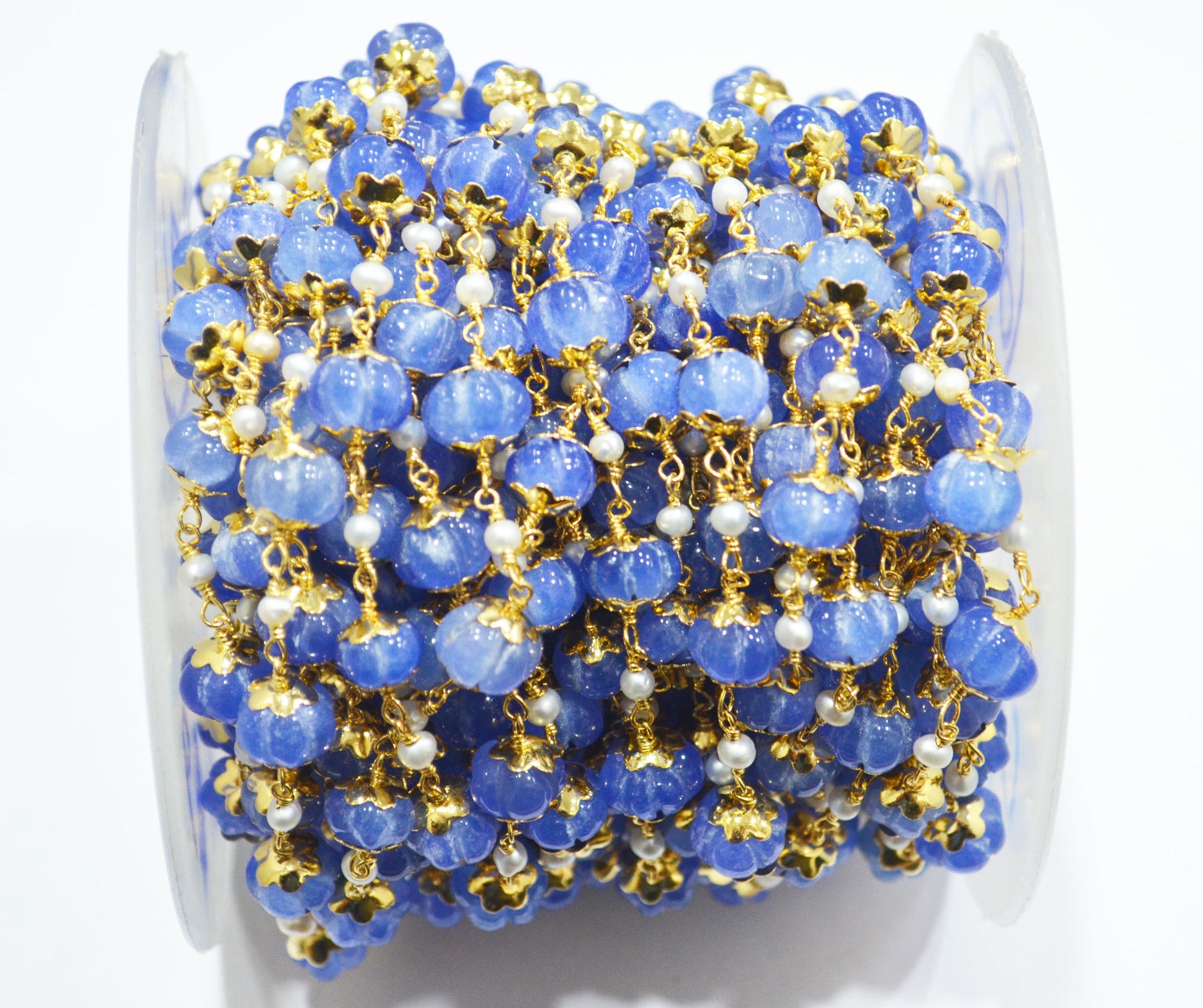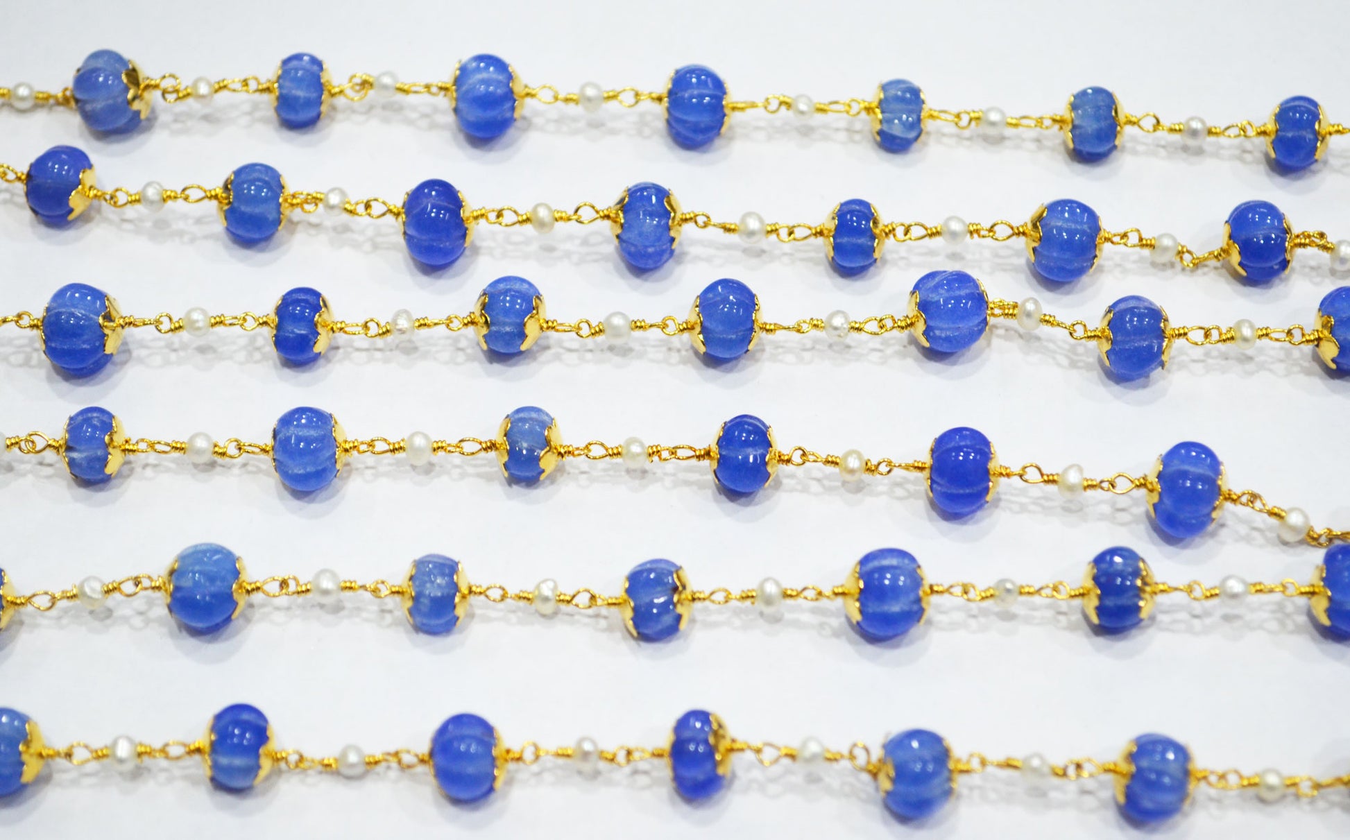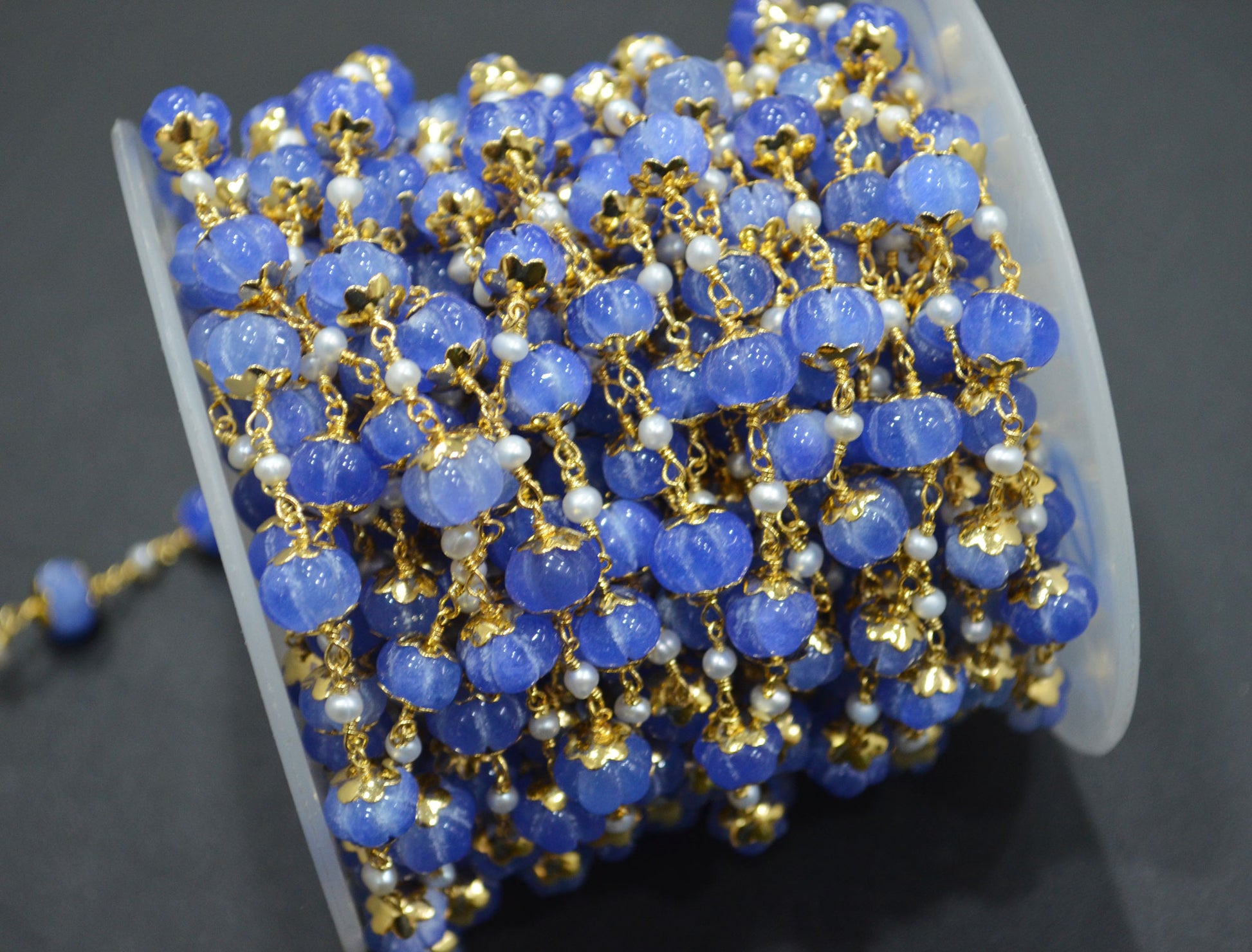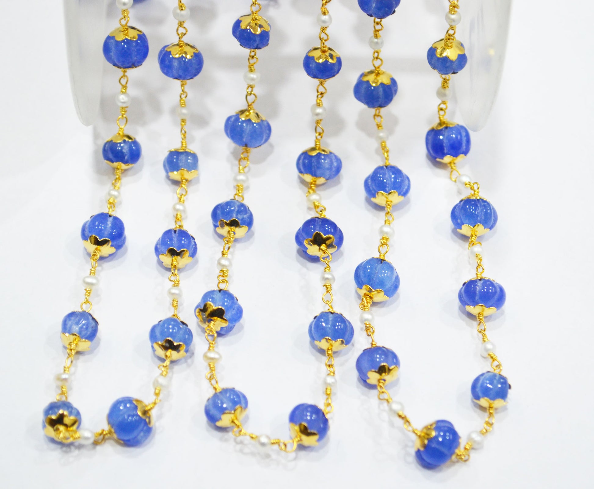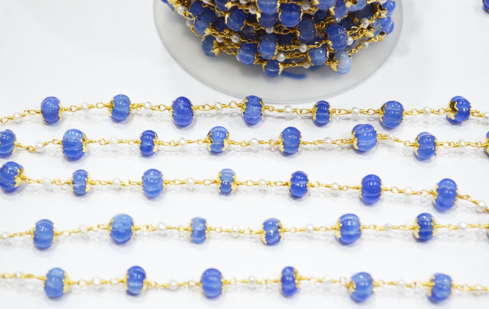Dyed Tanzanite Natural Quartz Carved Melons With Natural Pearl Smooth Rondelle Rosary Beaded Chain , 3 - 9 mm , 6710