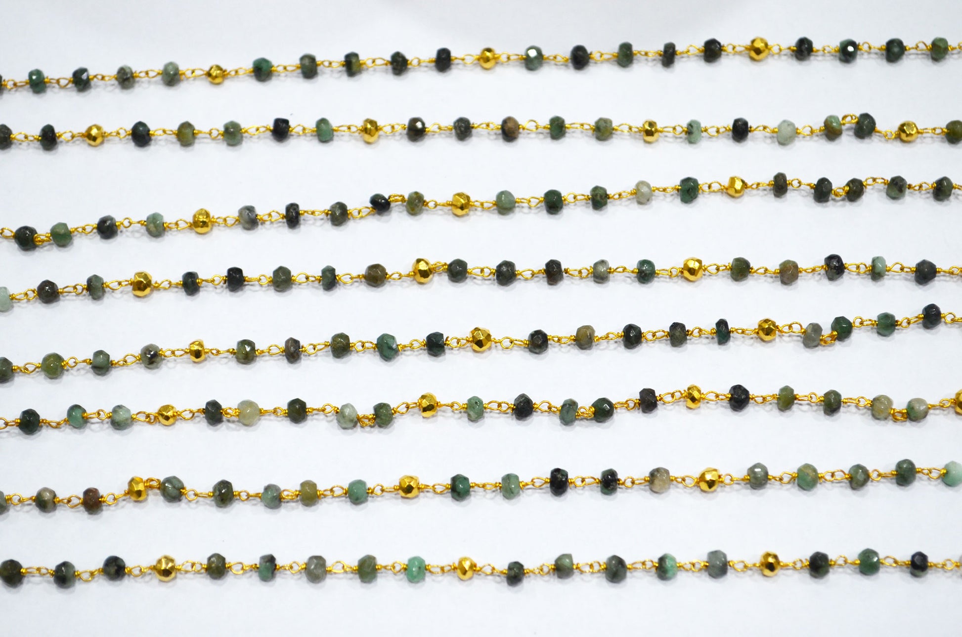 Emerald Faceted Rondelle Shape Rosary Beaded Chain , Emerald With Gold Pyrite Rondelle Shape Wire Wrapped Chain , 3.50 - 4 mm ,RB-5891