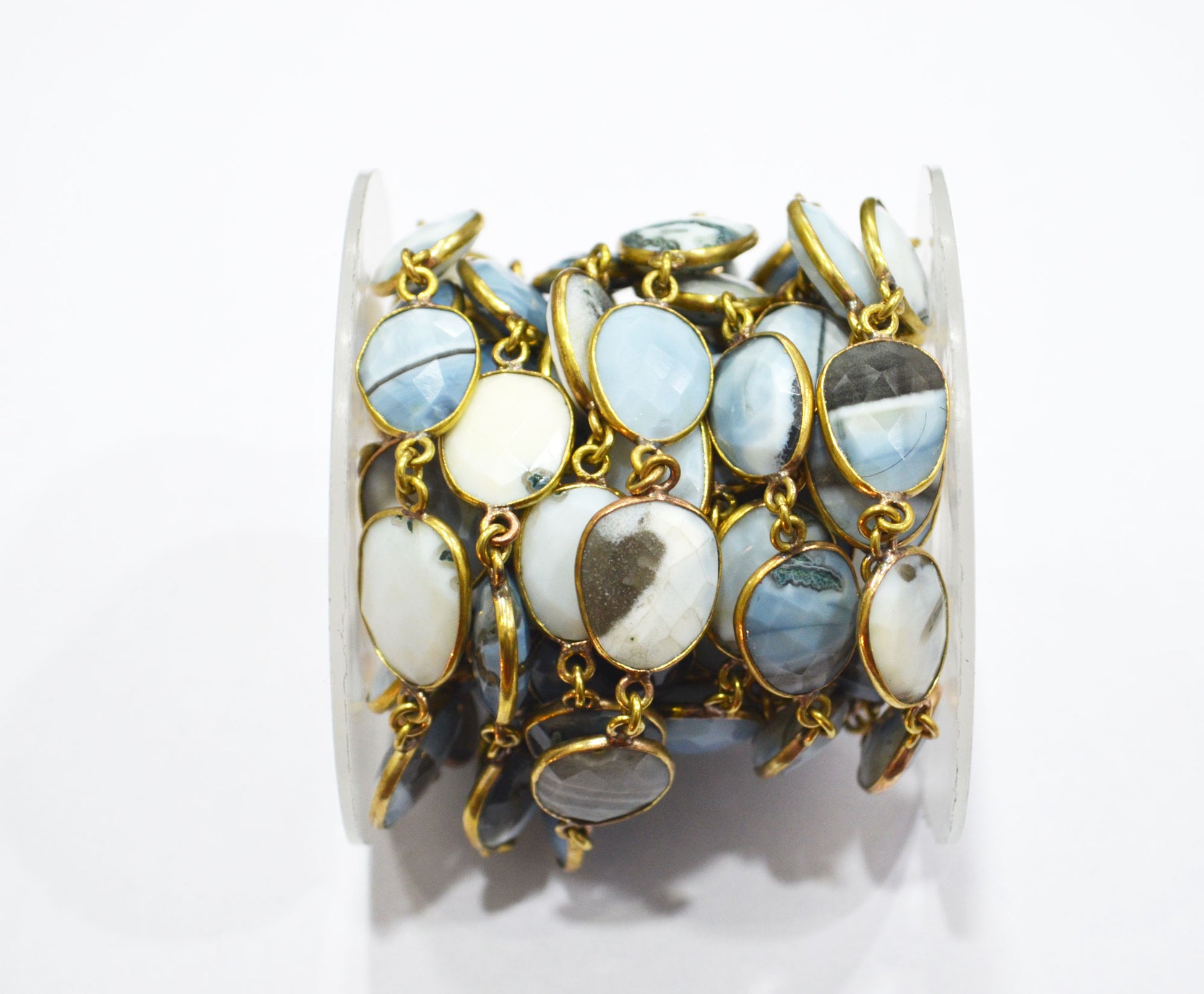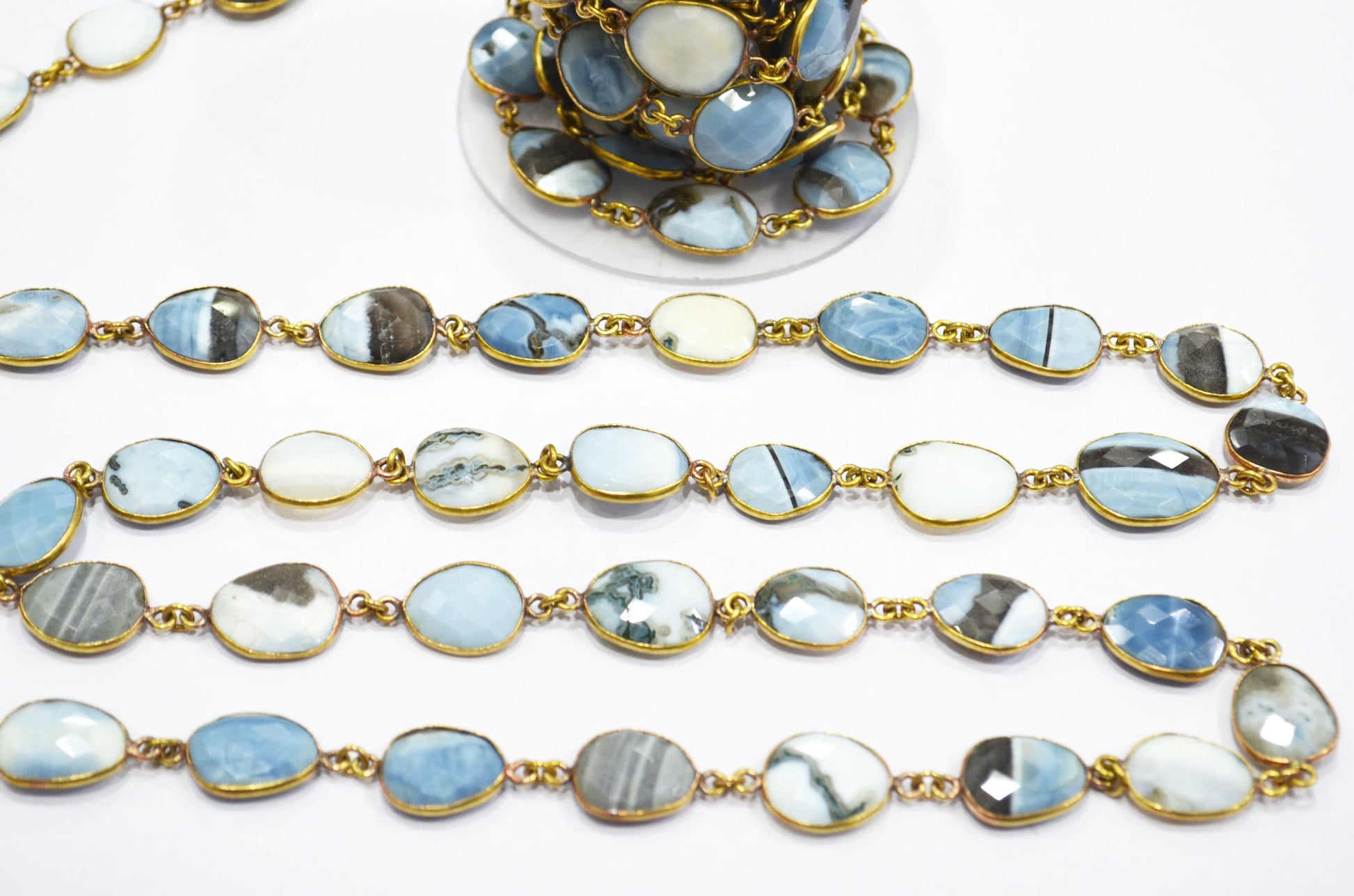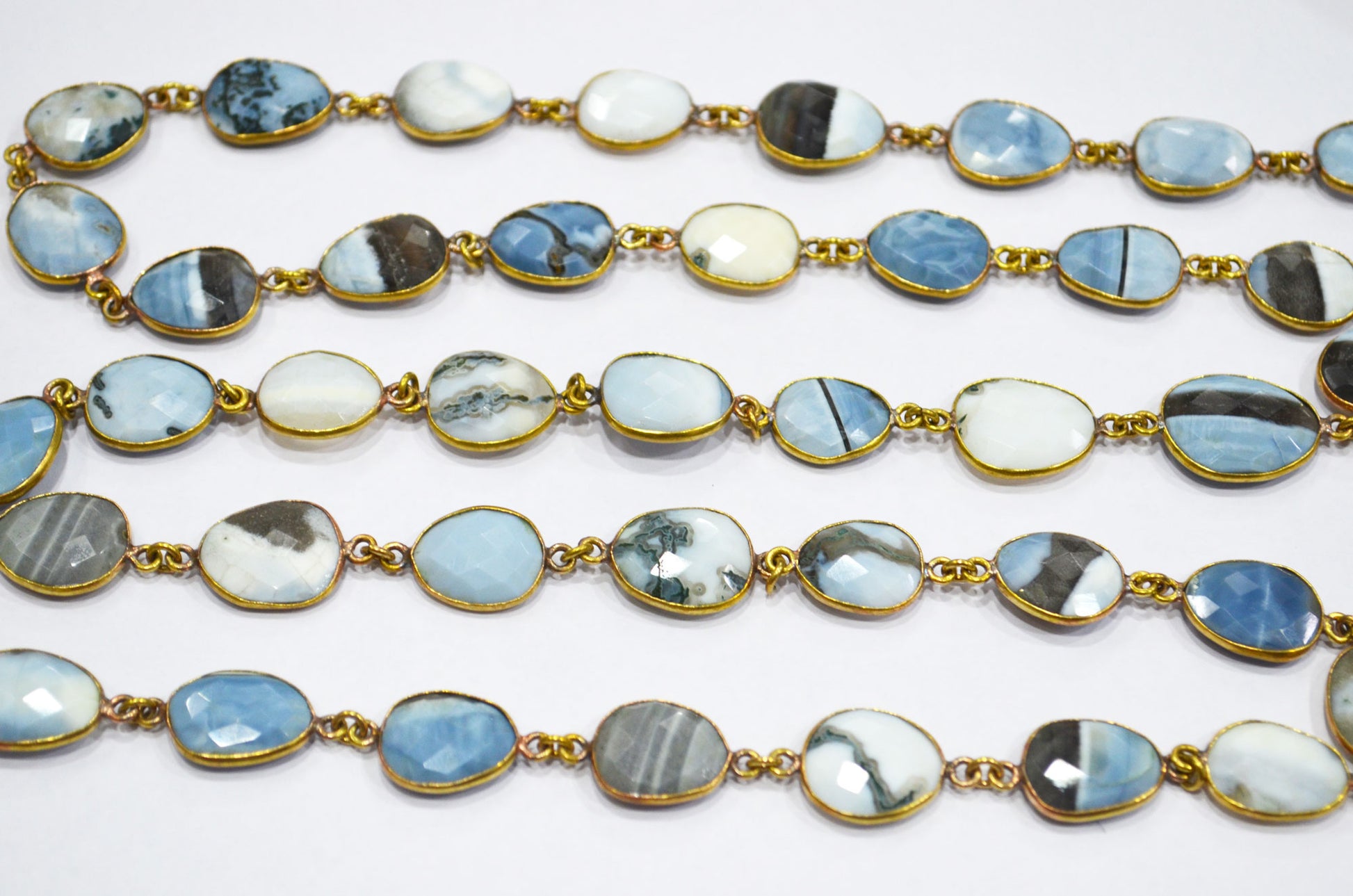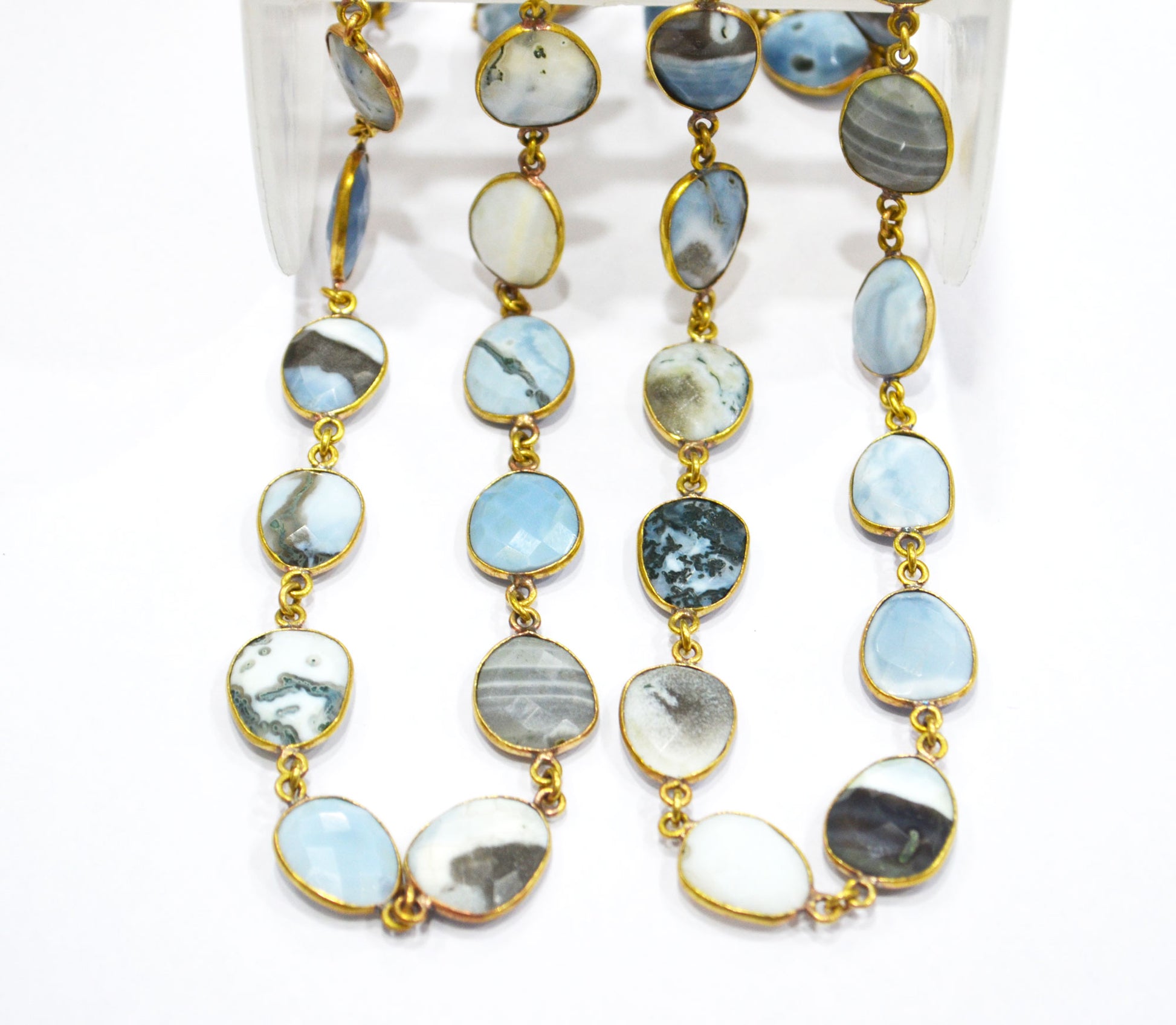 Fossil Blue Banded Opal Slice Shape Connector Chain , Fossil Blue Banded Opal Faceted Free Form Shape Bezel Link Chain , 15 - 20 mm , RB-6324