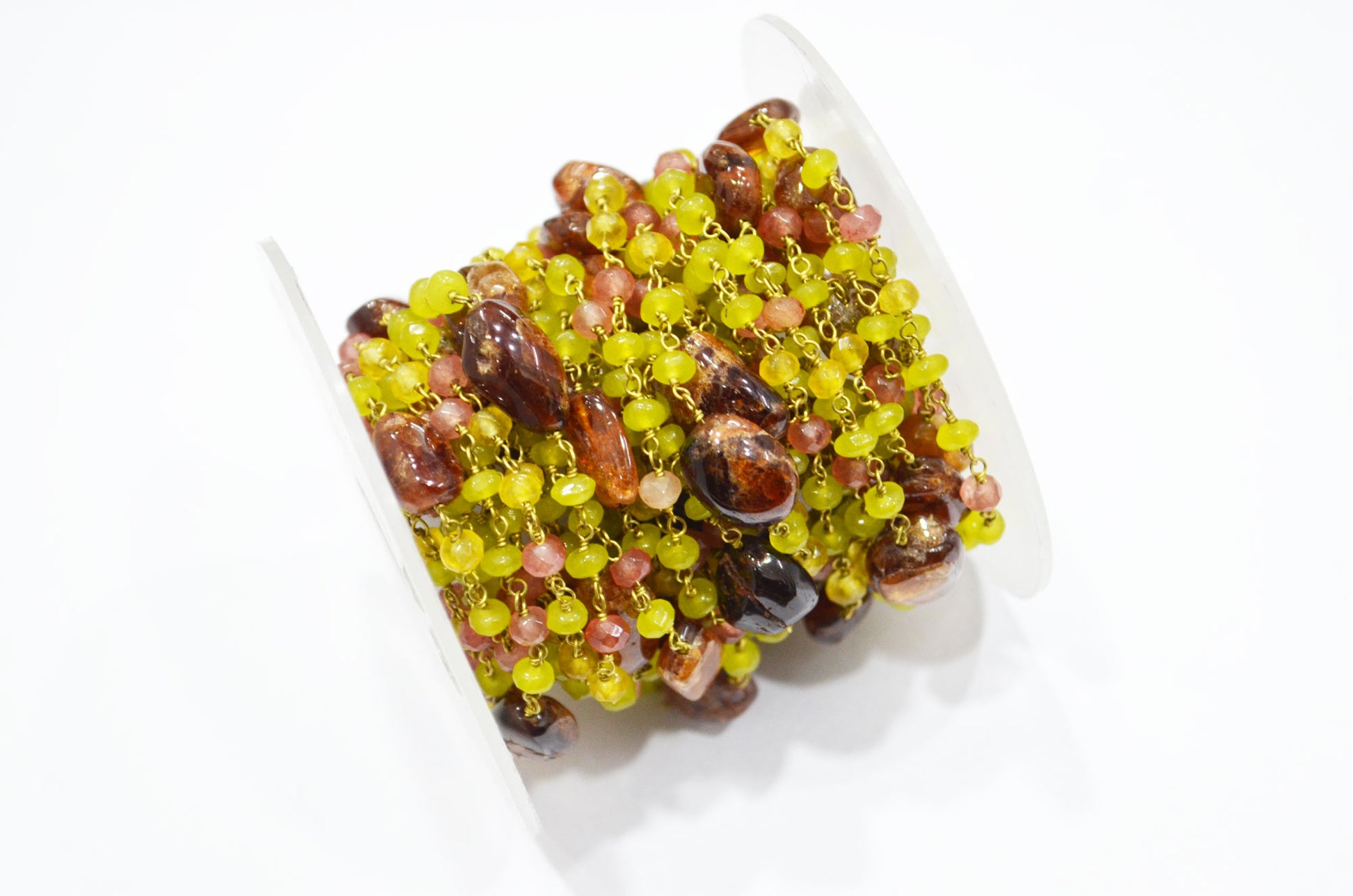 Frangipani Jade Faceted Rondelle Shape Rosary Beaded Chain , Hessonite Smooth Nuggets Wire Wrapped Chain , 4 mm , RB-6013