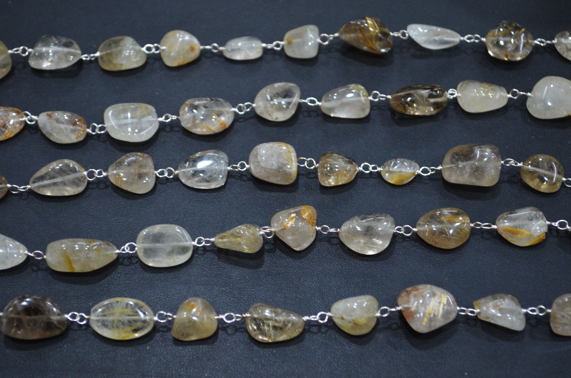 Golden Rutile Smooth Rosary Beaded Chain , Golden Rutile Tumble Shape Wire Wrapped Chain , 8 - 14 mm , RB-6008