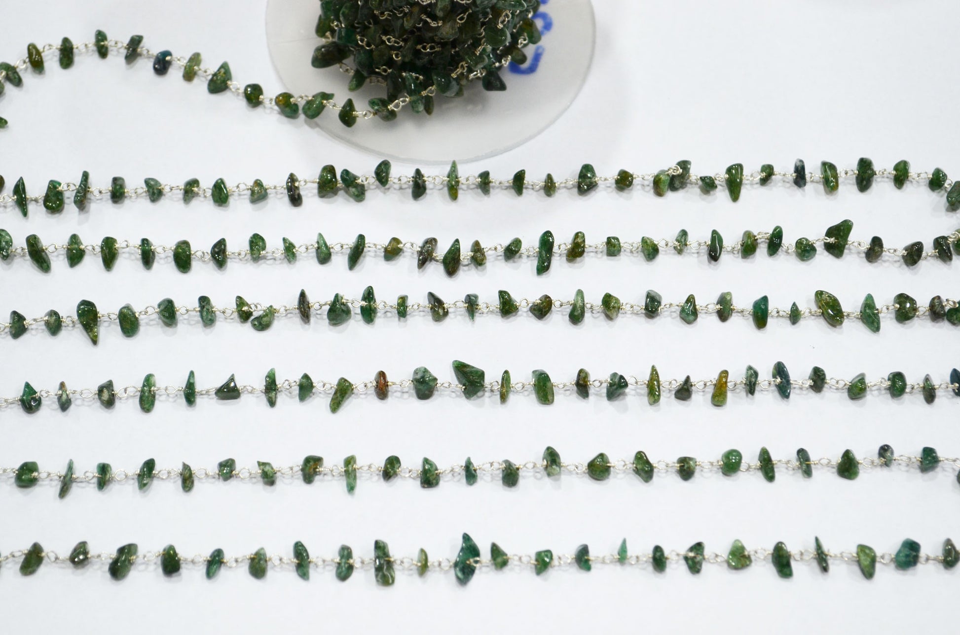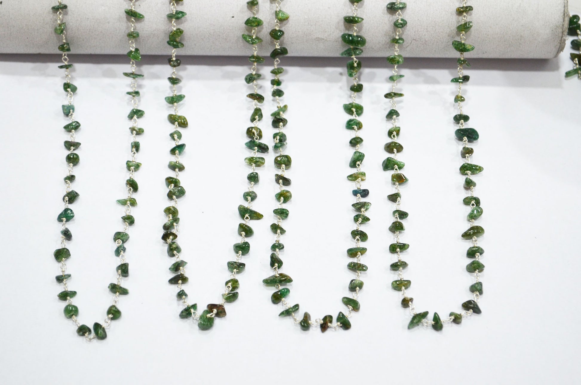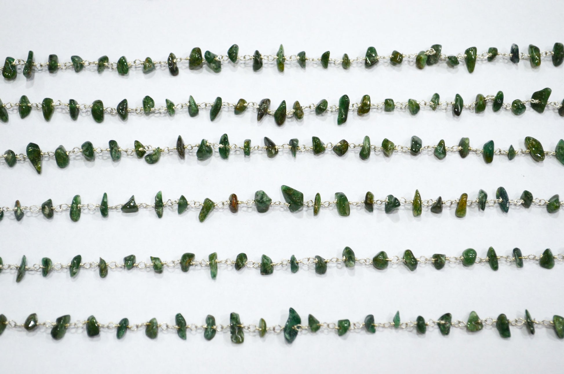 Green Aventurine Smooth Irregular Flat Chips Shape Rosary Beaded Chain , Green Aventurine Rough Nuggets Wire Wrapped Chain , 3 - 5 mm , RB-5877