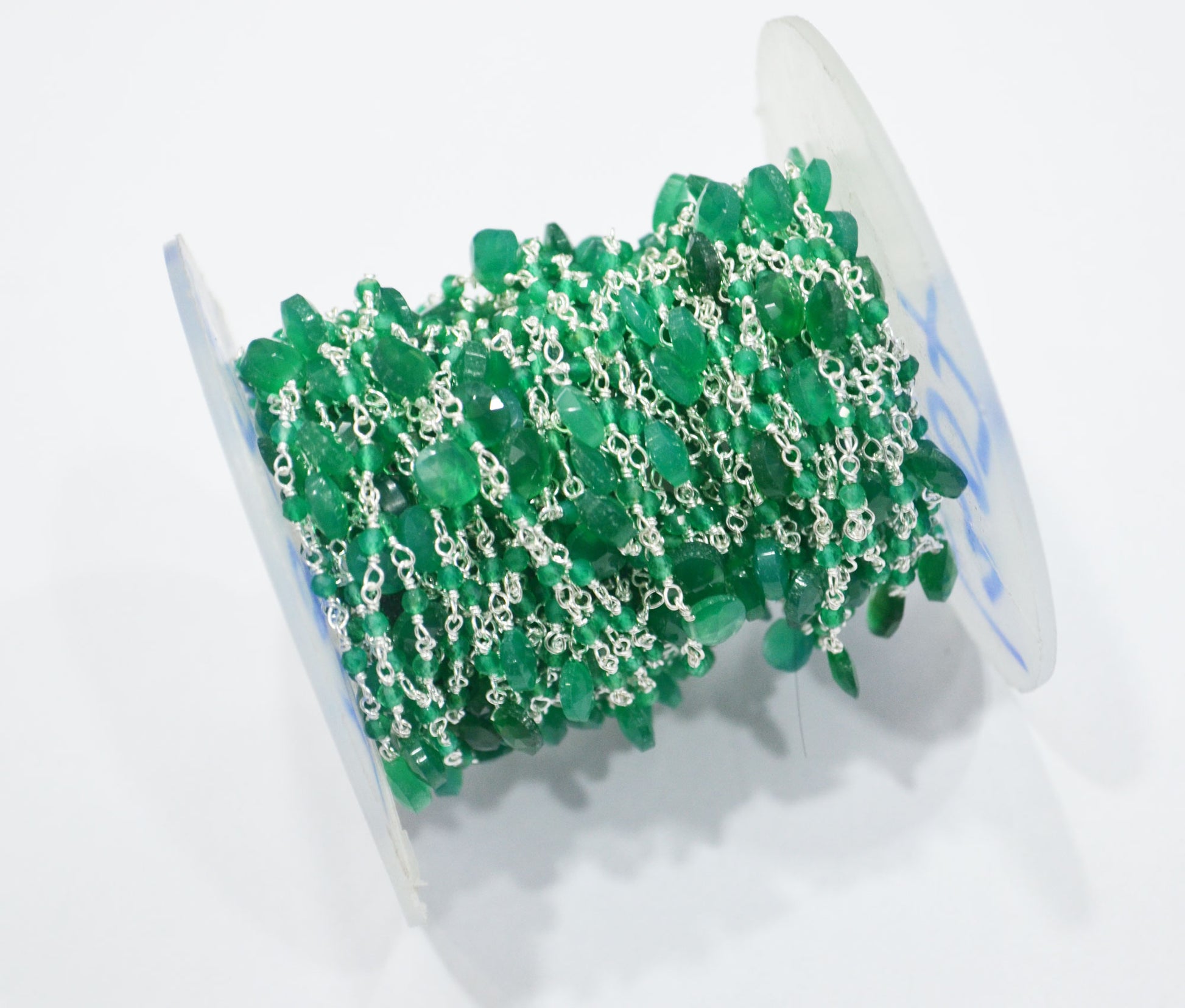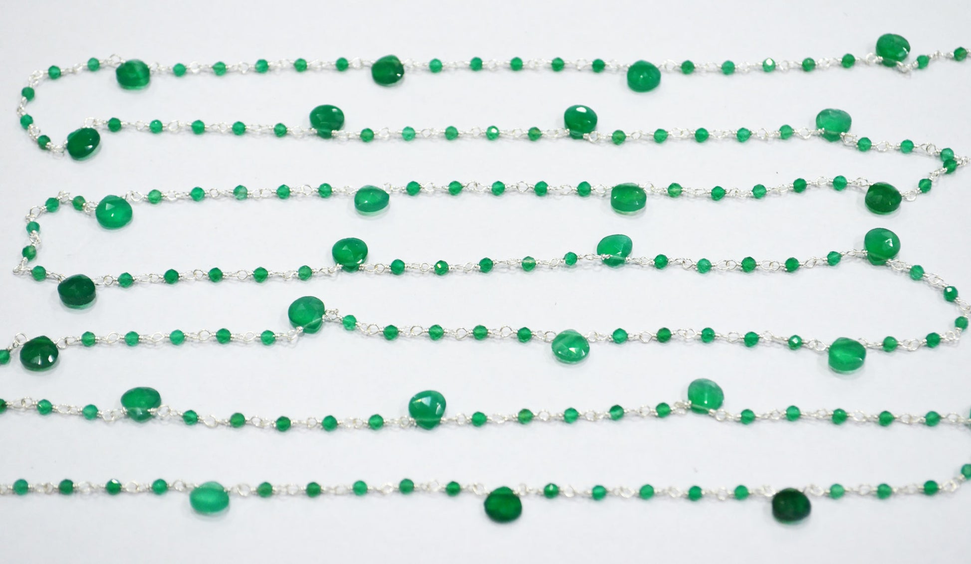 Green Onyx Faceted Round Shape Rosary Beaded Chain , Green Onyx Heart Shape Wire Wrapped Chain , Sold By Foot , 2 - 6 mm , RB-6307