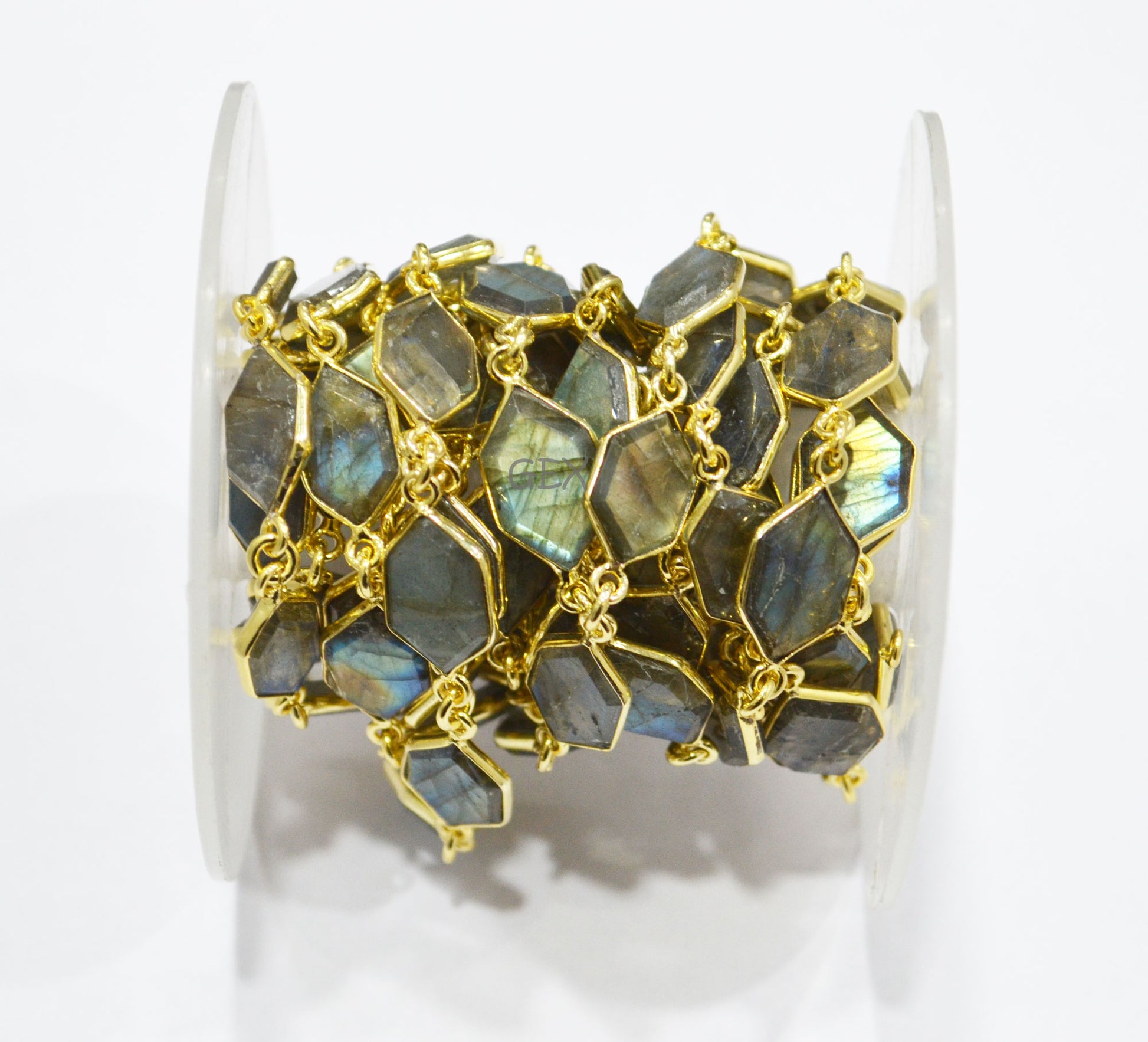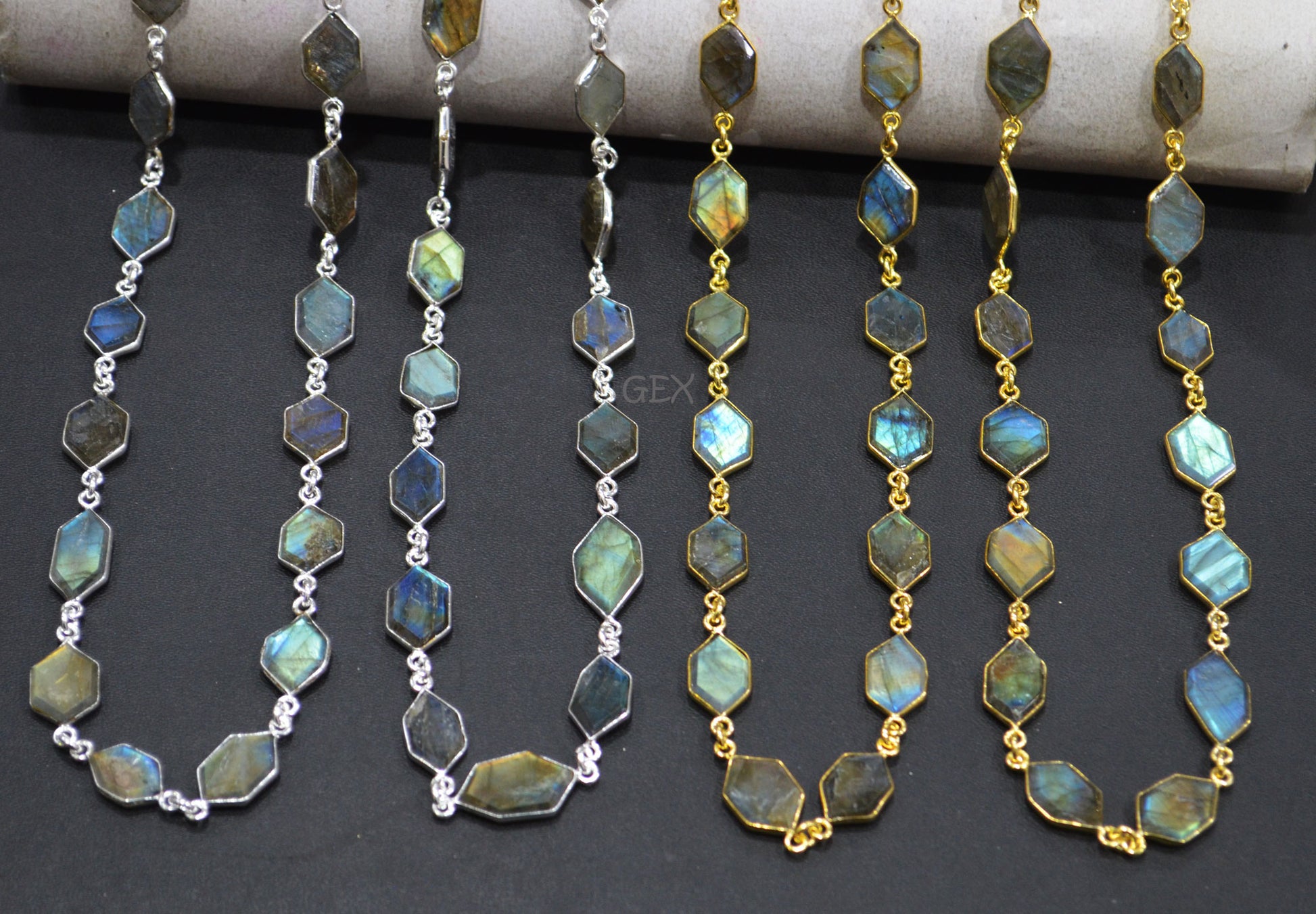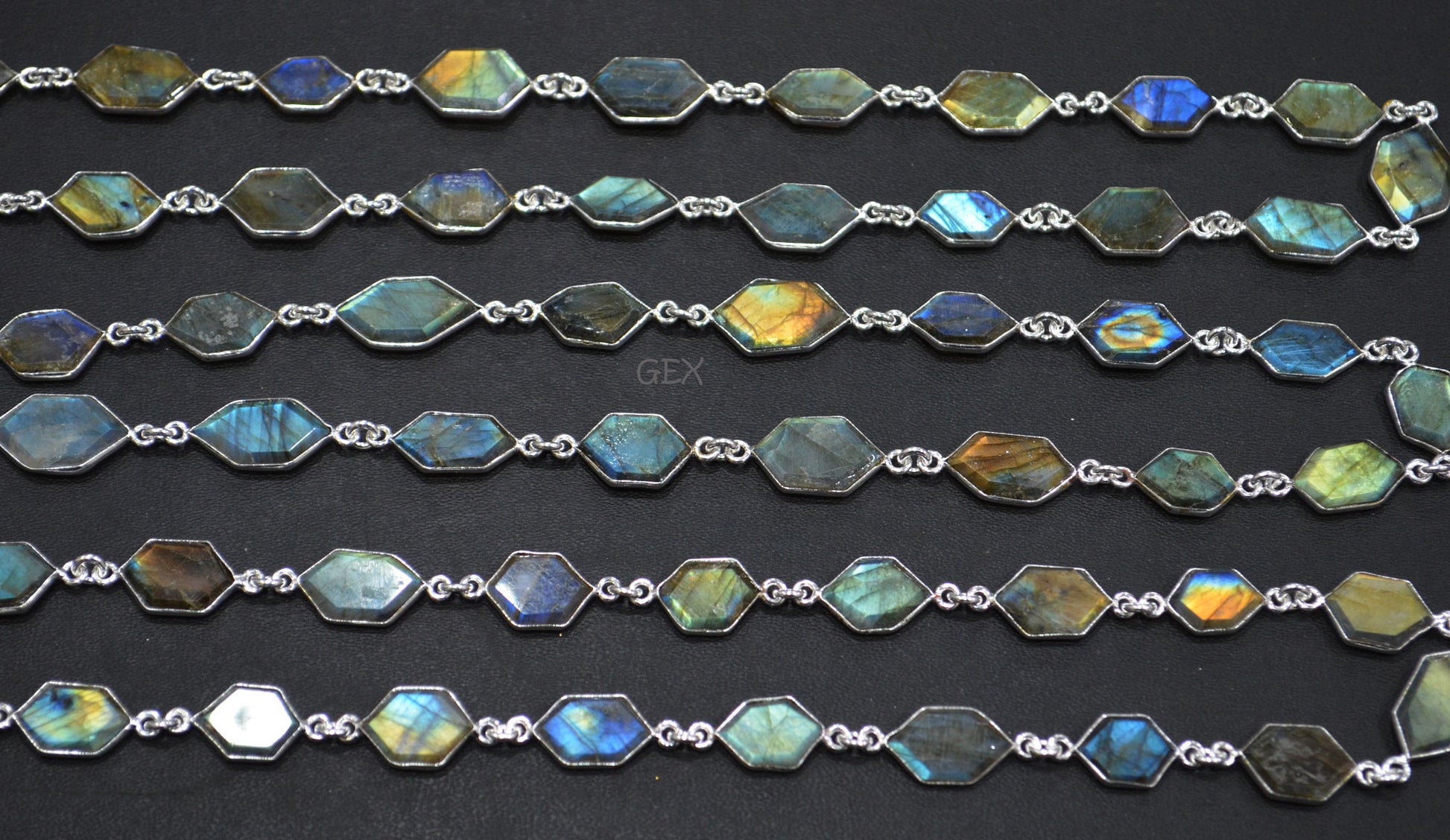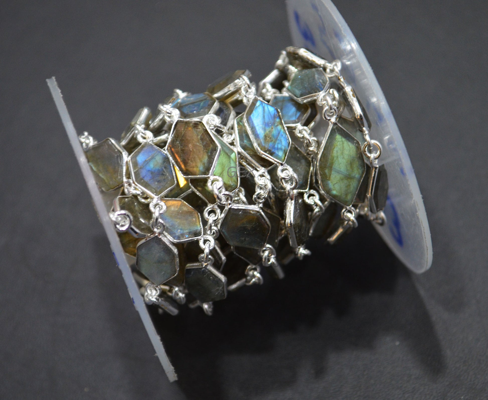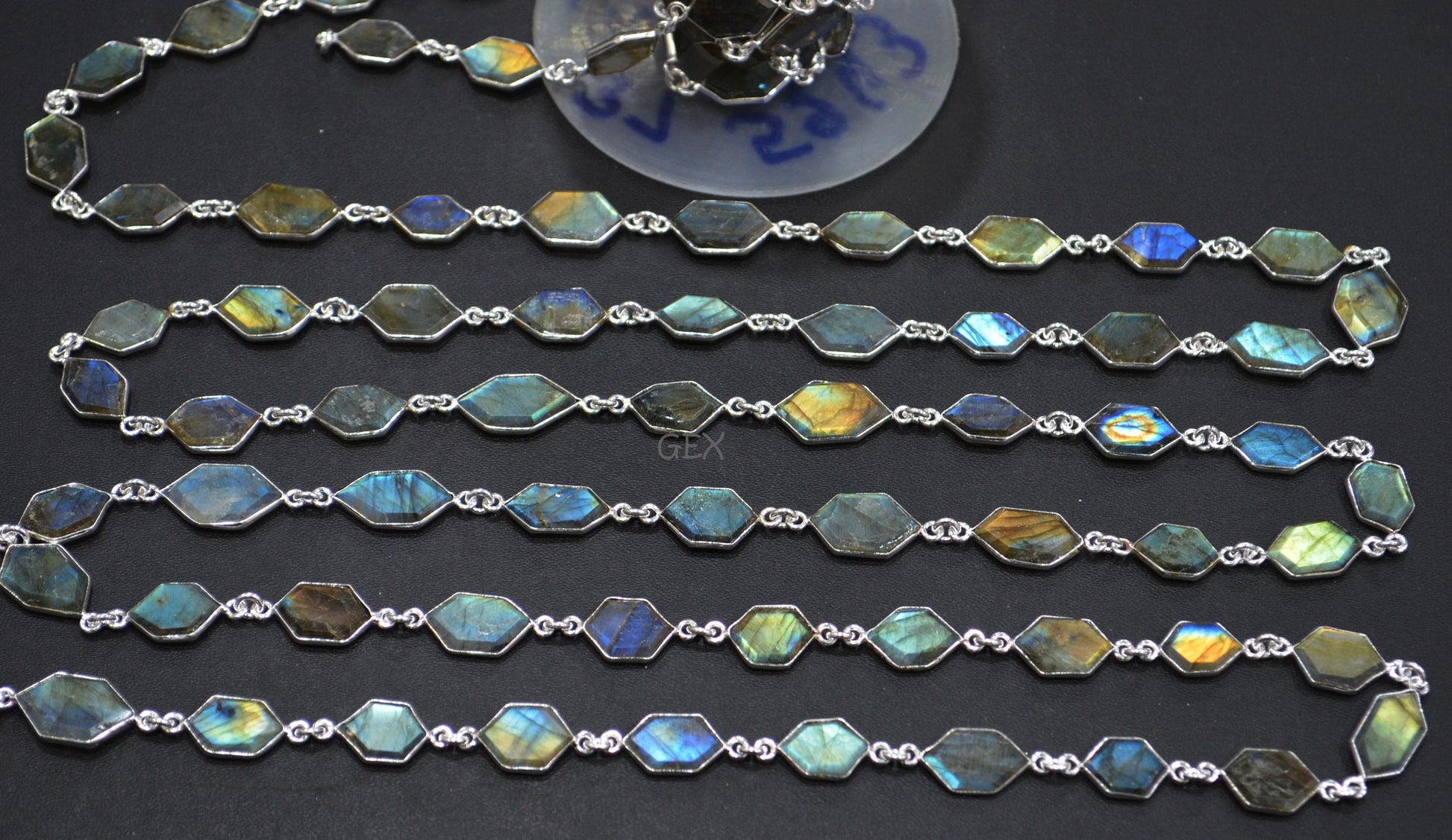 Labradorite Faceted Fancy Cut Tablets Shape Connector Chain , Labradorite Bezel Link Chain , 8x11 - 12x15 mm , RB-7162