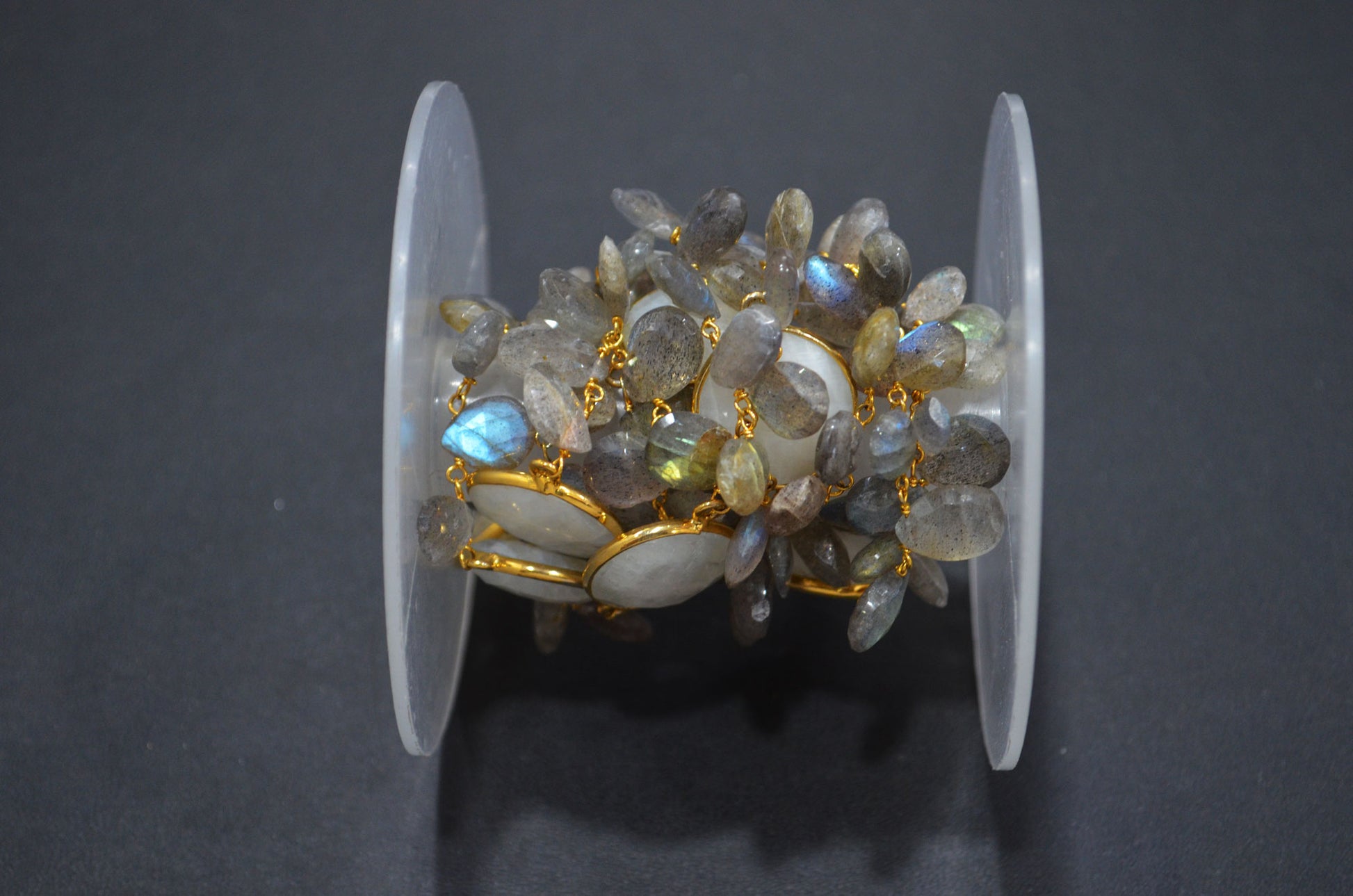 Labradorite Faceted Pear Shape Rosary Beaded Chain , Rainbow Moonstone Faceted Coin Shape Connector Wire Wrapped Chain , 5 - 15 mm , RB-5801