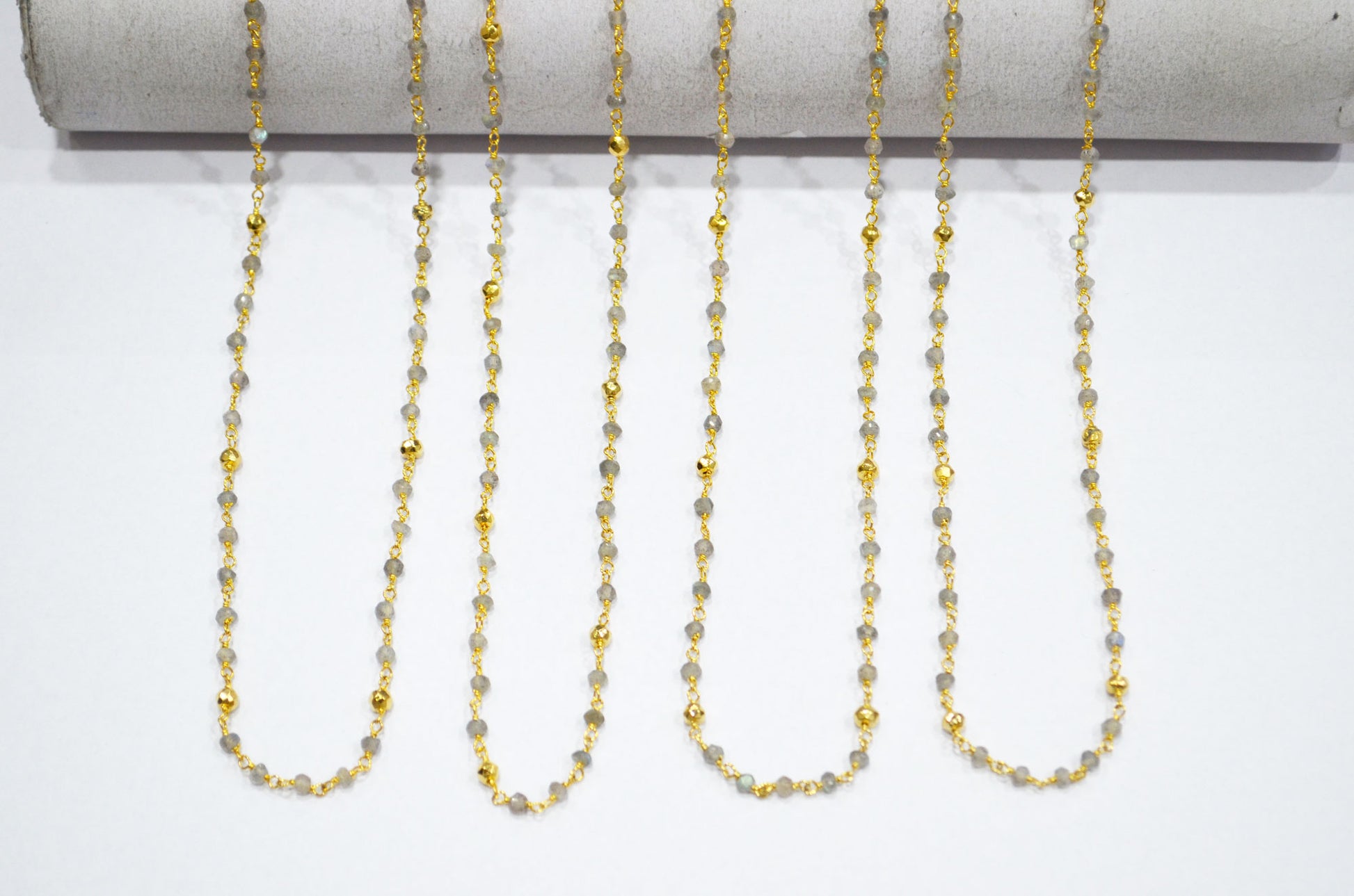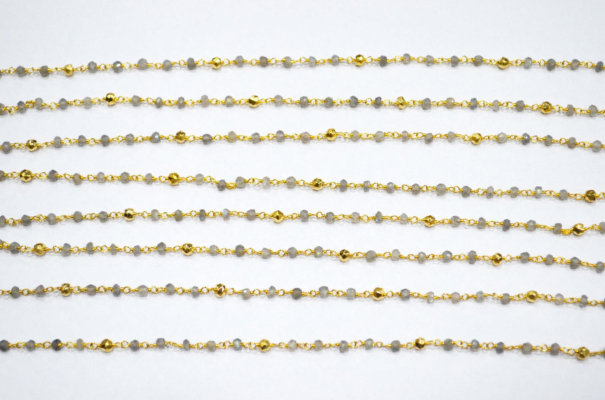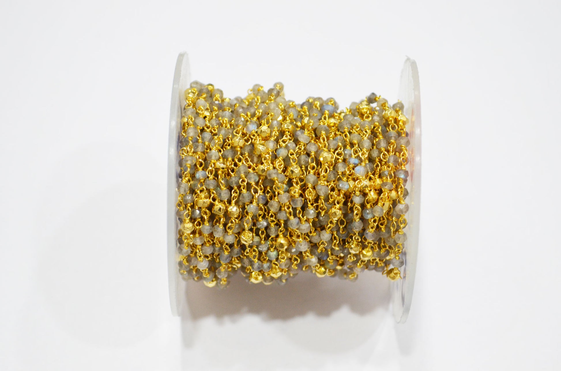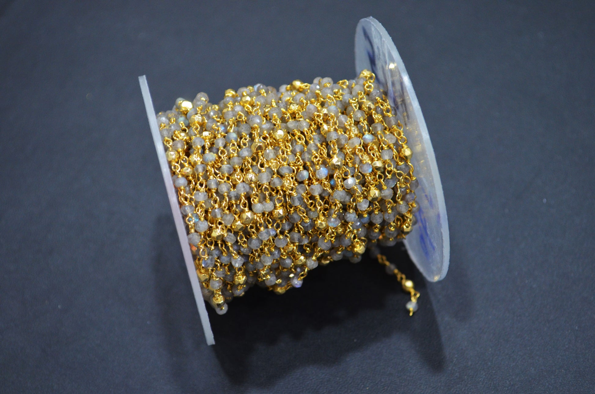 Labradorite Faceted Rondelle Shape Rosary Beaded Chain , Labradorite With Gold Pyrite Rondelle Wire Wrapped Chain , 3 - 3.25 mm , RB-5734