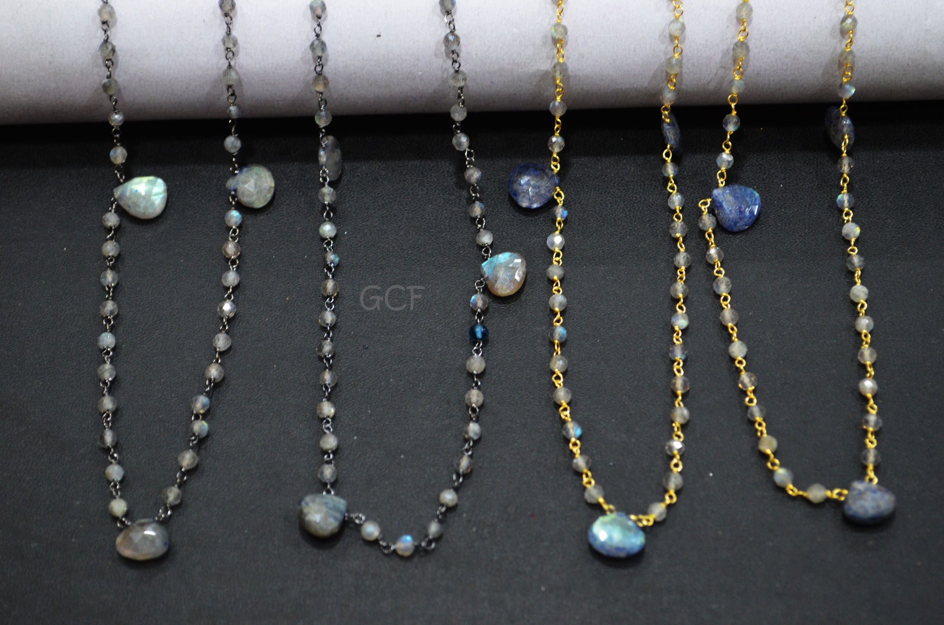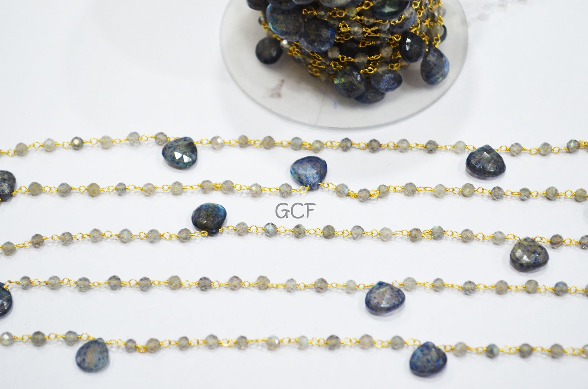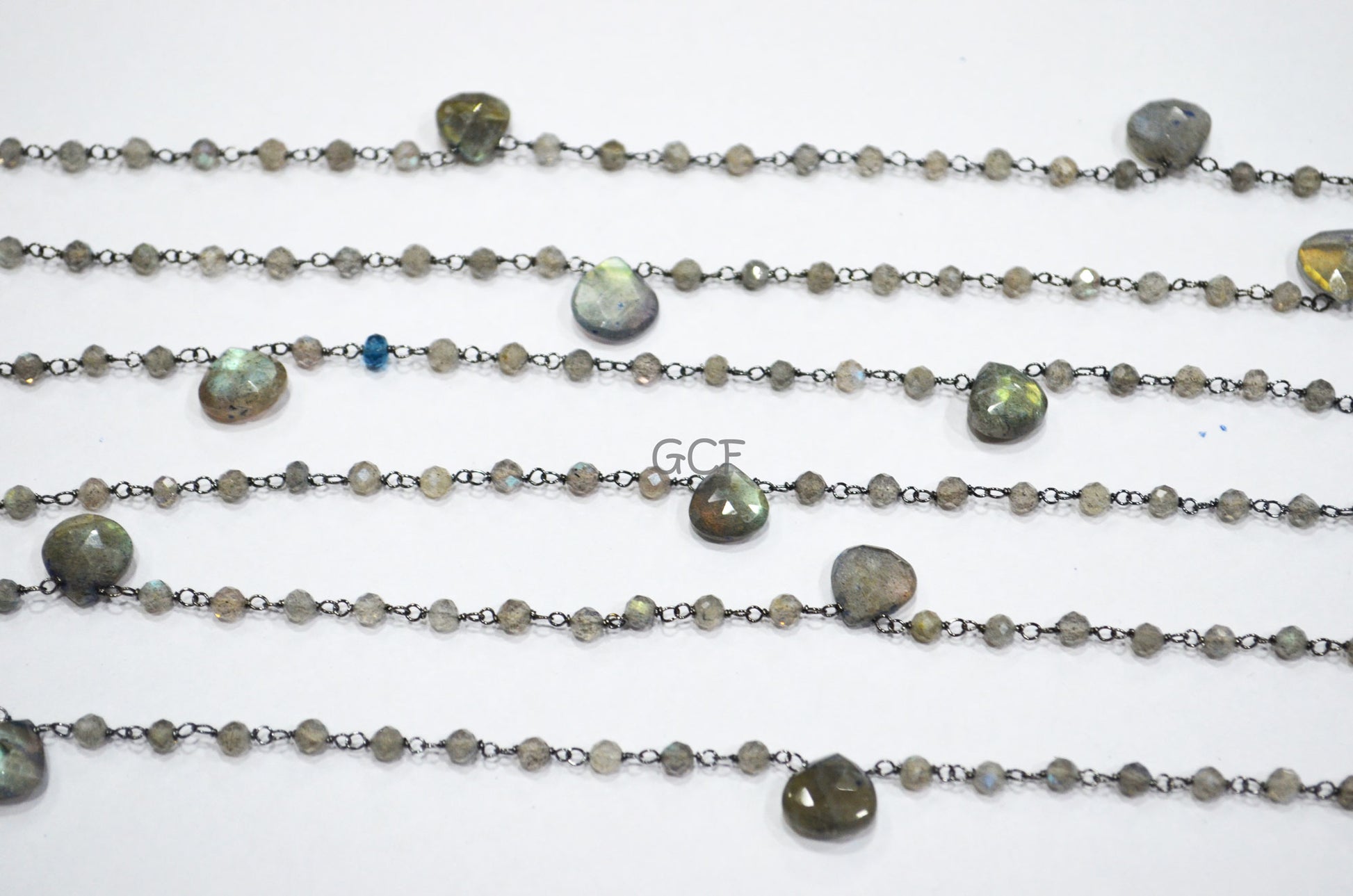 Labradorite Faceted Round Shape Rosary Beaded Chain , Labradorite Faceted Heart Shape Wire Wrapped Chain , 3 mm , 7002