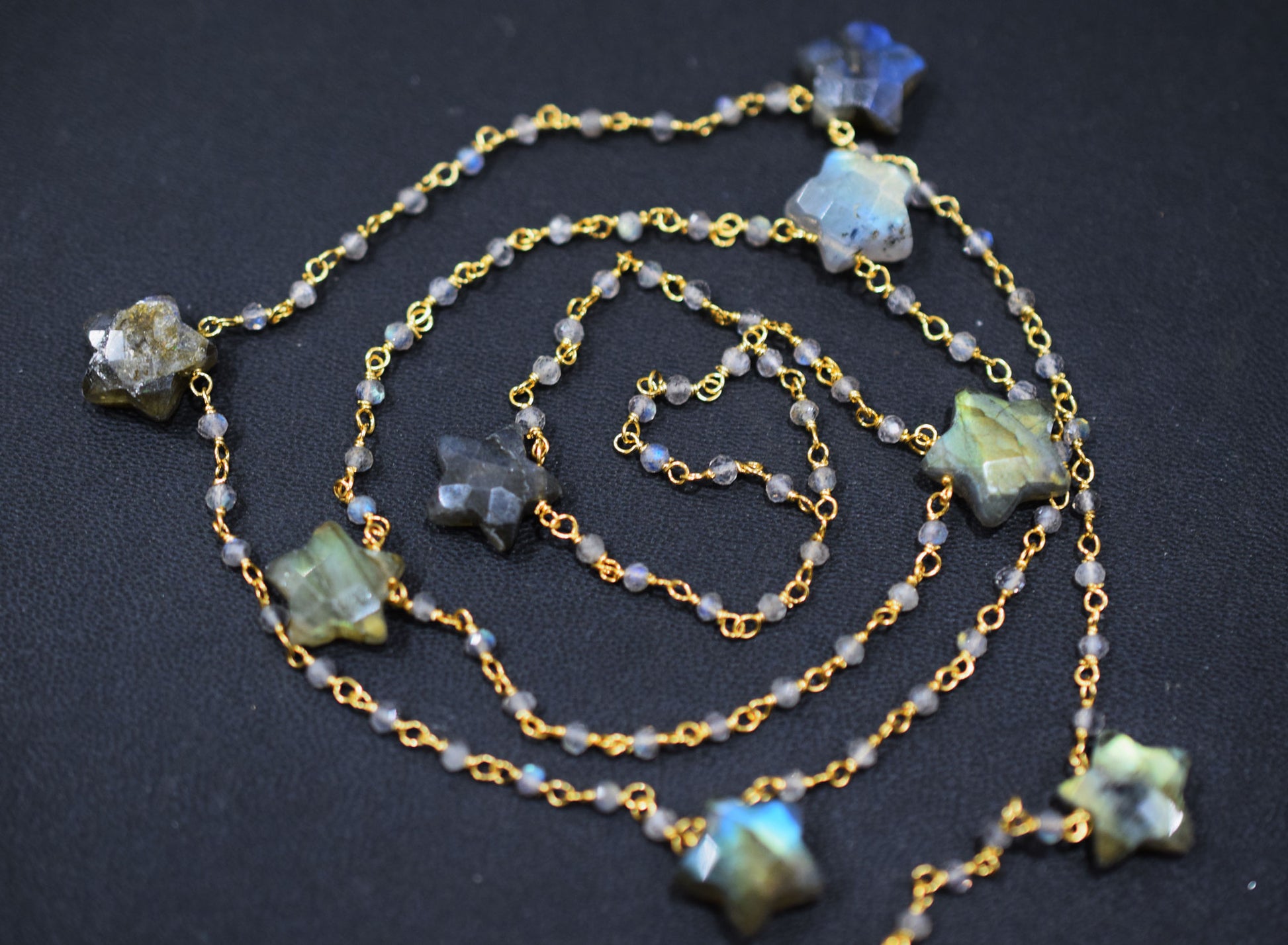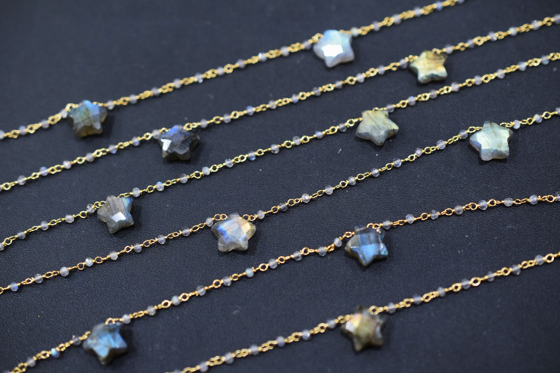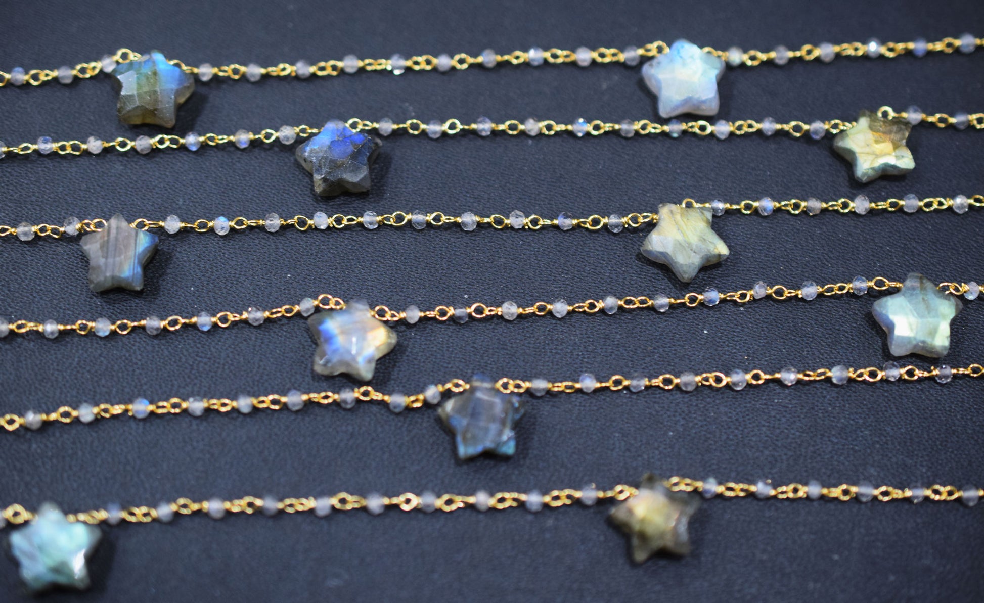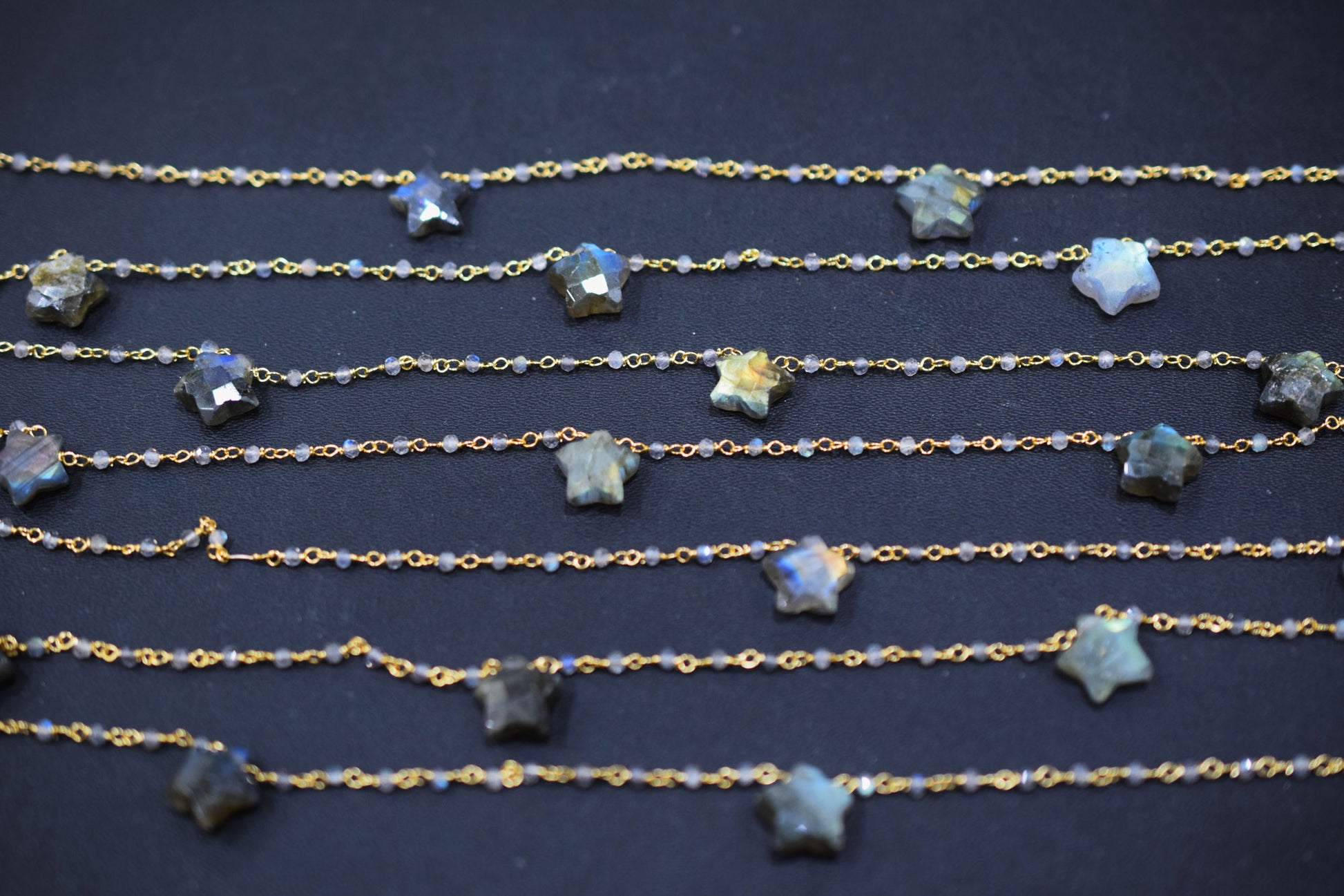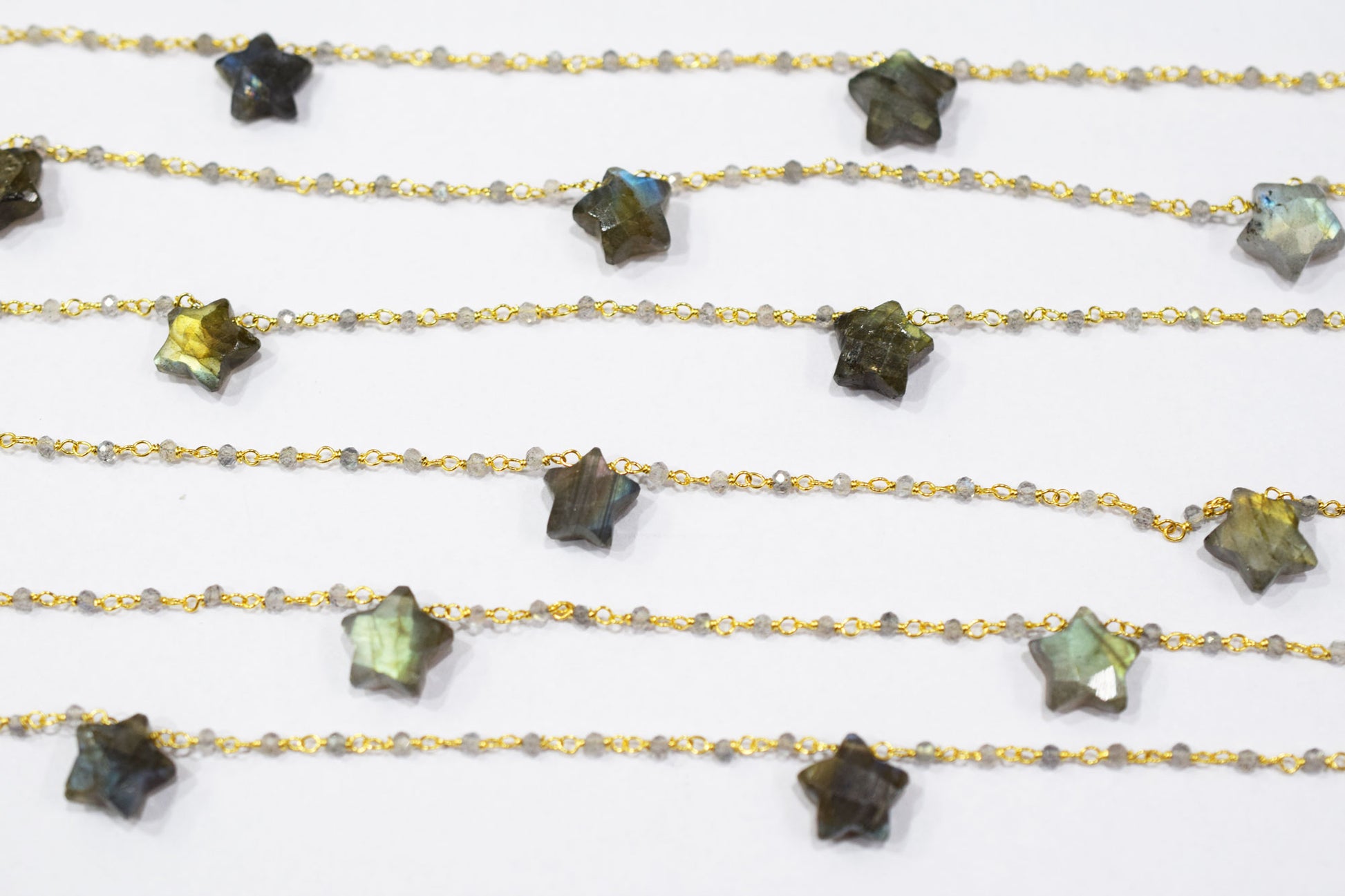 Labradorite Faceted Round Shape Rosary Beaded Chain , Labradorite Faceted Star Shape Wire Wrapped Chain , 2 - 9 mm , RB-6514A