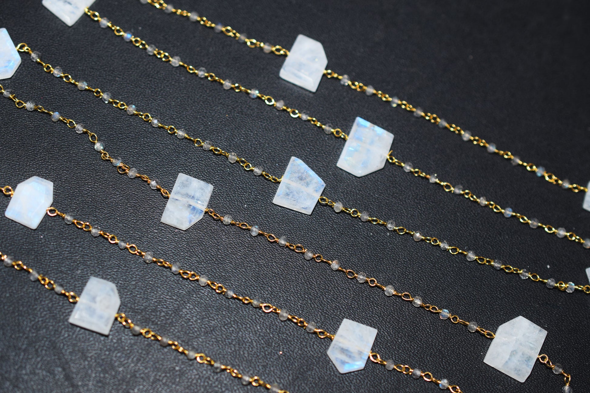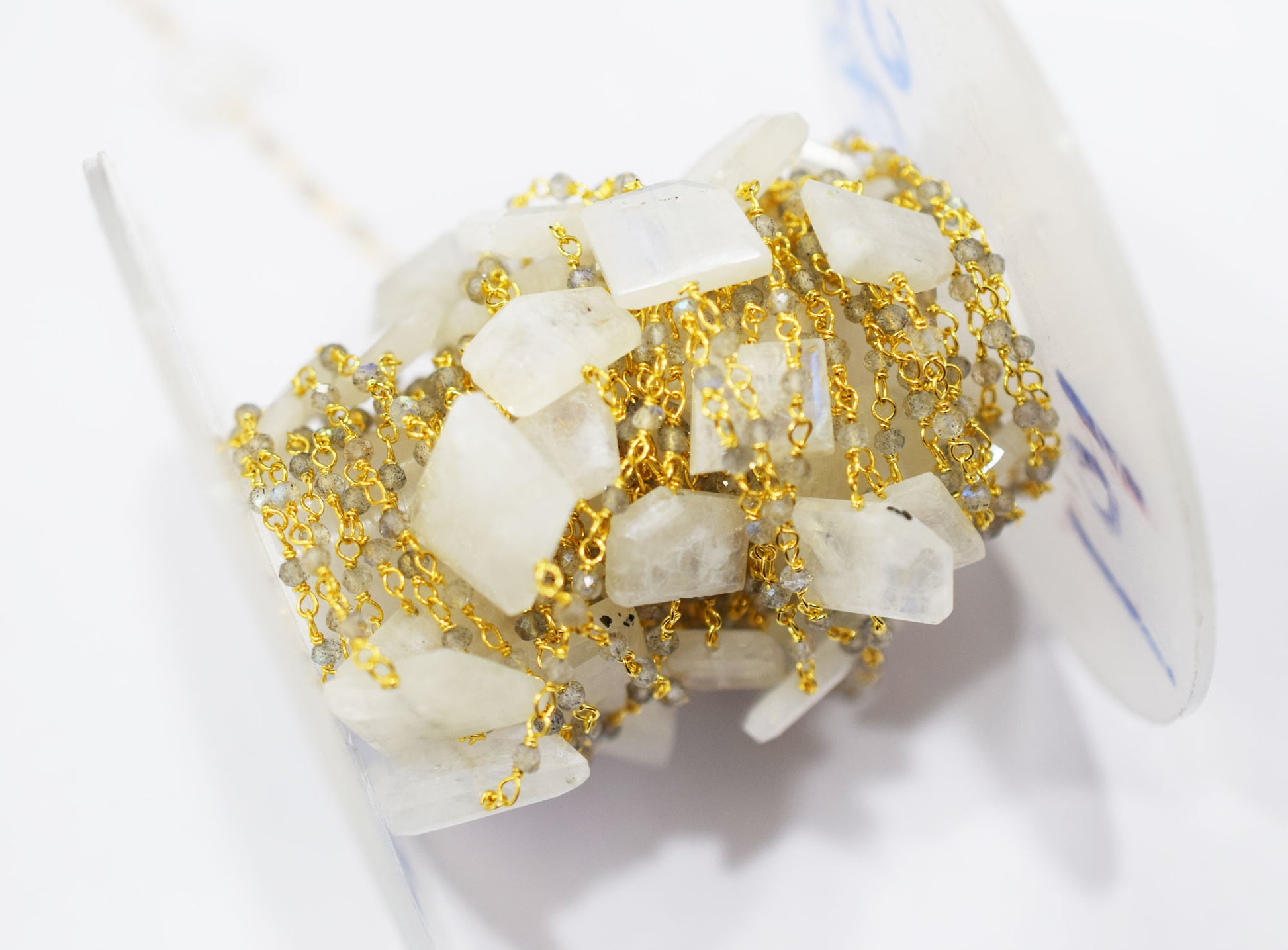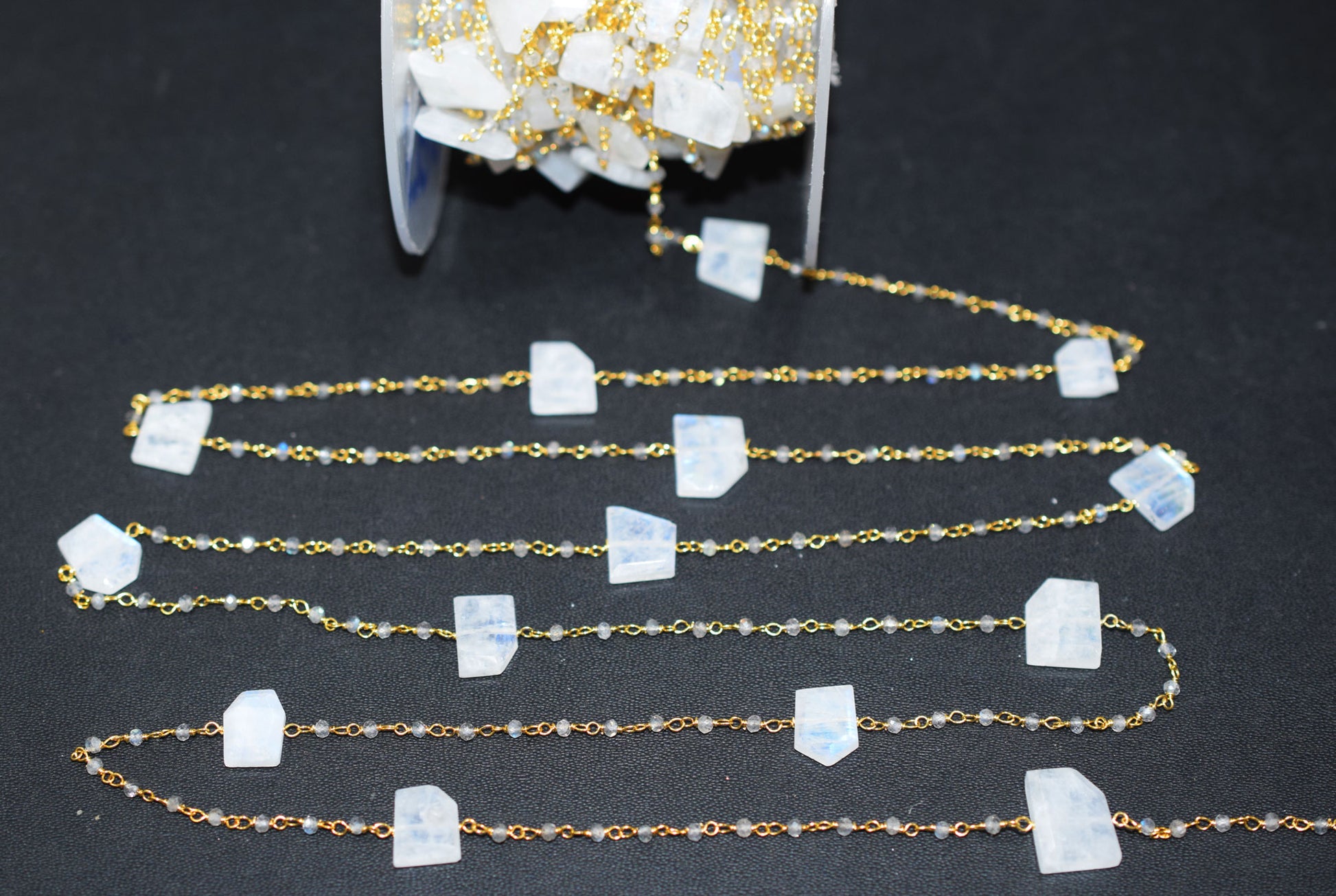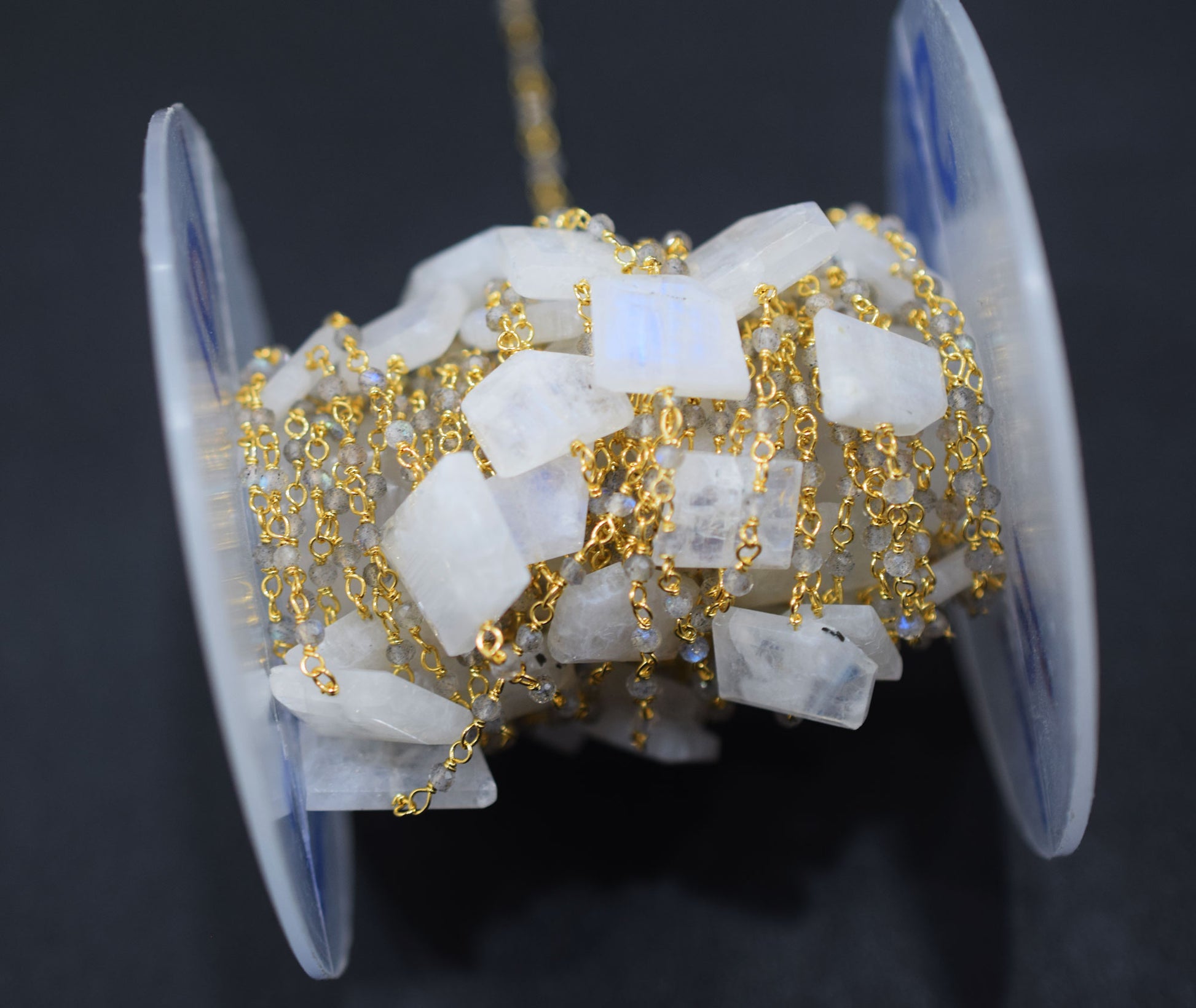 Labradorite Faceted Round Shape Rosary Beaded Chain , Rainbow Moonstone Crown Cut Nuggets Shape Wire Wrapped Chain , Sold By Foot , 2 mm , RB-6553