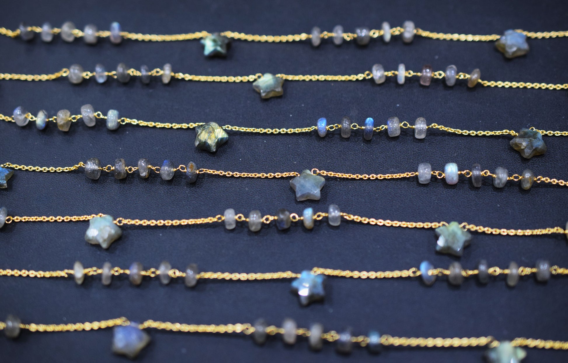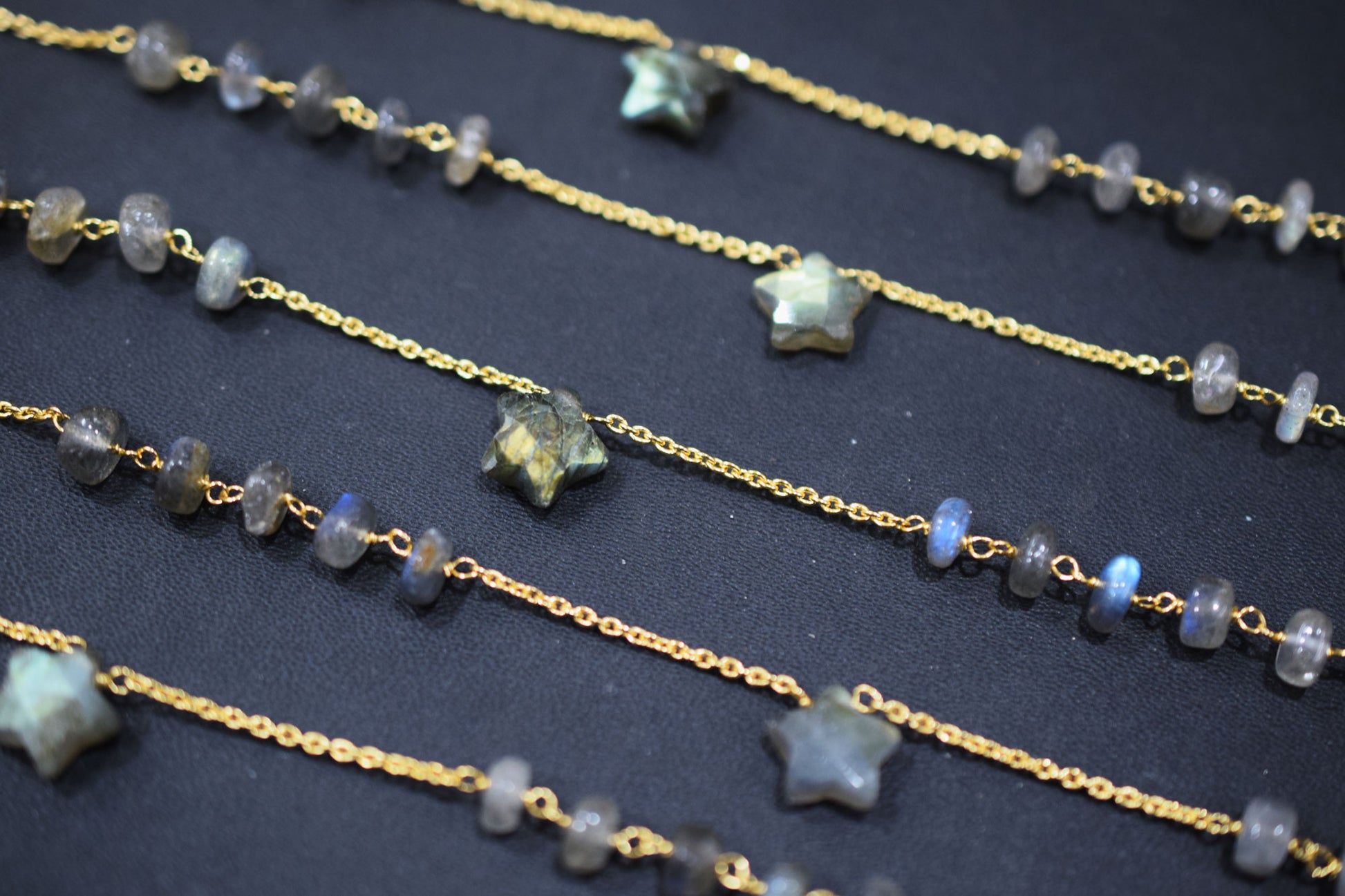 Labradorite Smooth Rondelle Shape Rosary Beaded Chain , Labradorite Faceted Star Shape Wire Wrapped Chain , 7 - 9 mm , RB-6514B