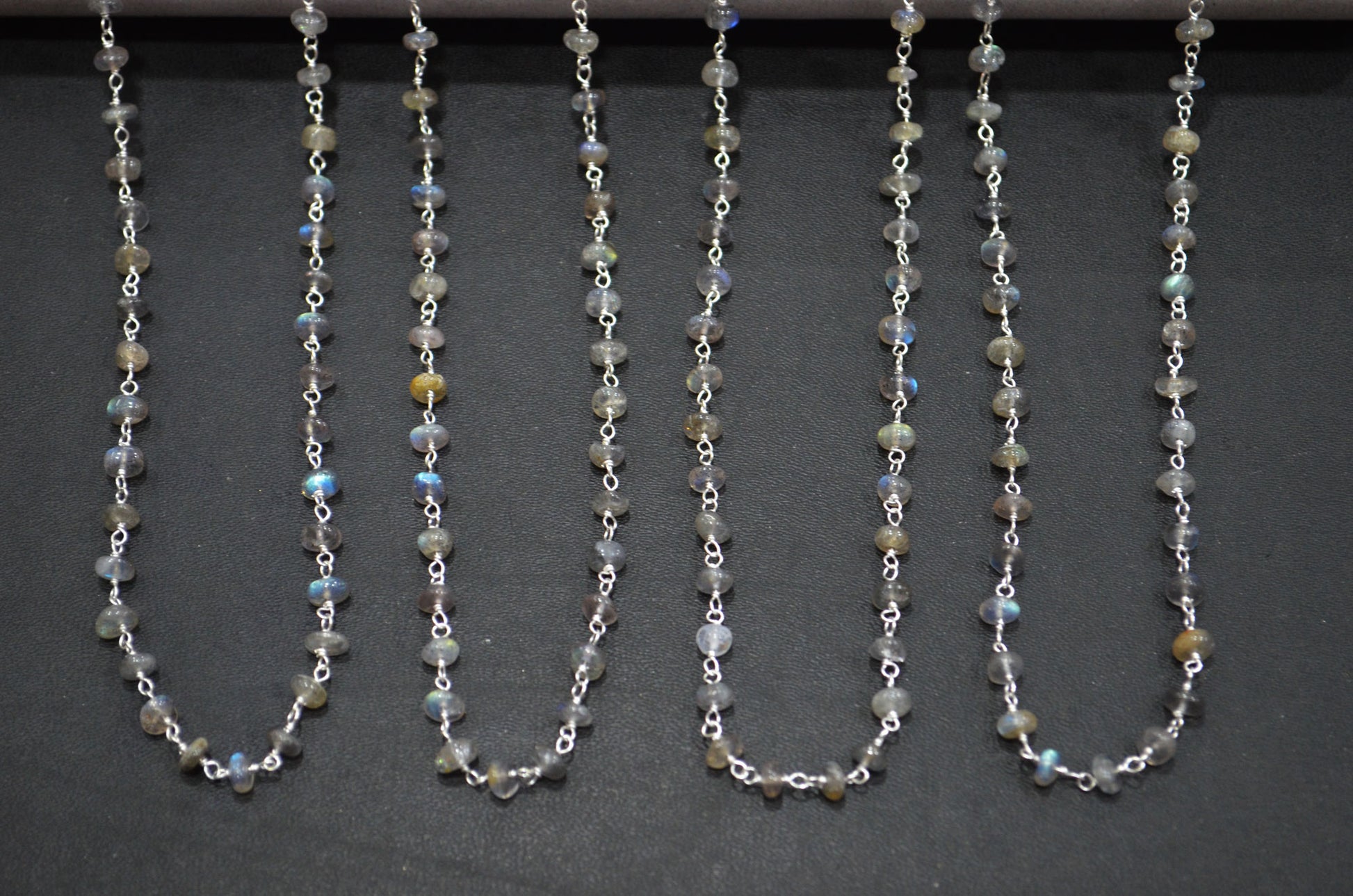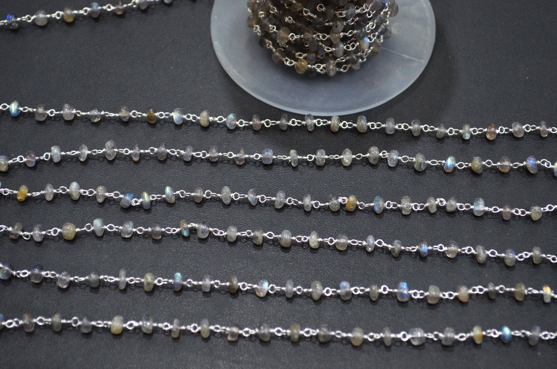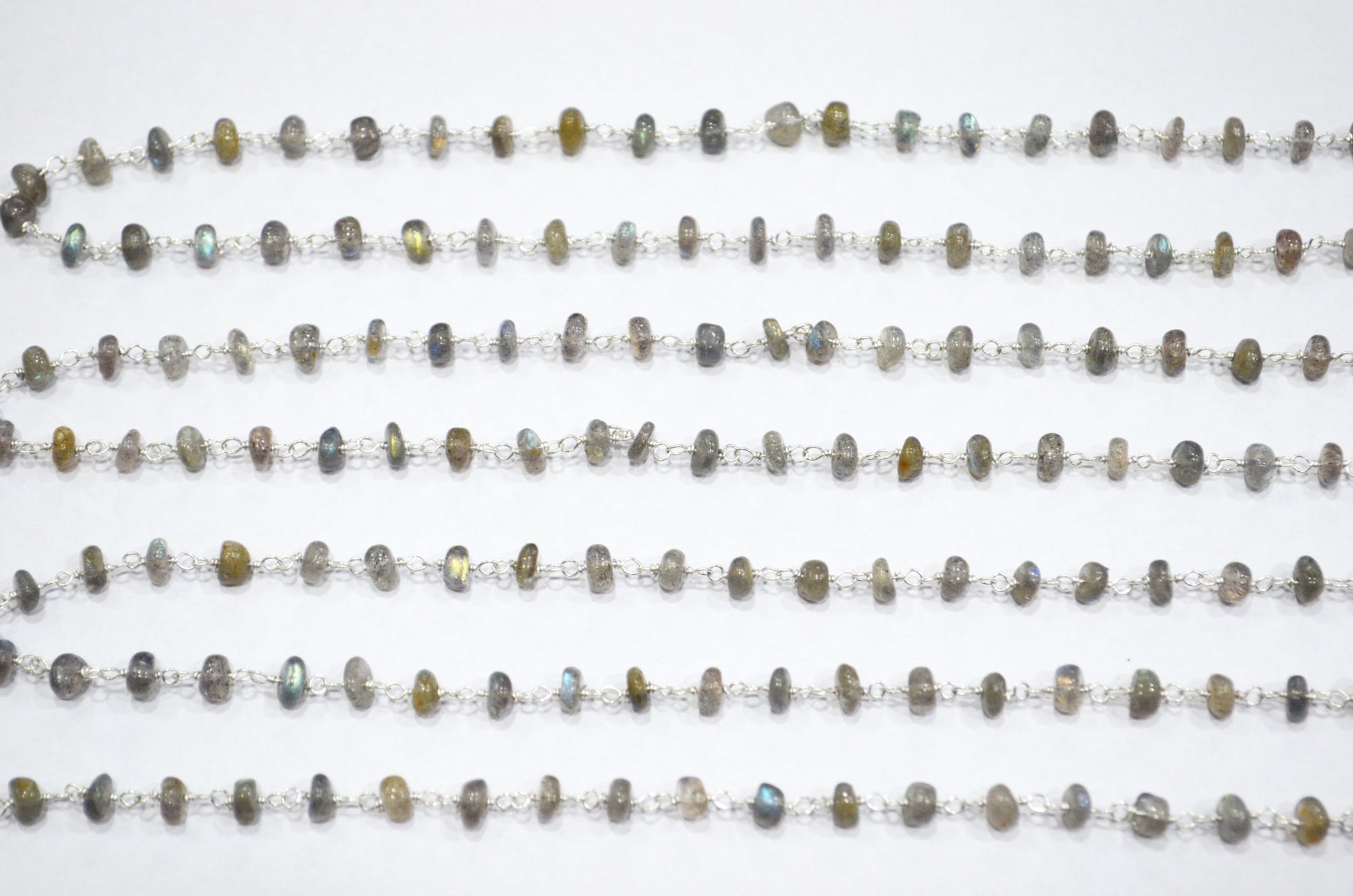 Labradorite Uneven Rondelle Shape Rosary Beaded Chain , Labradorite Smooth Wire Wrapped Chain , Sold By Foot , 4 - 5 mm , RB-5917