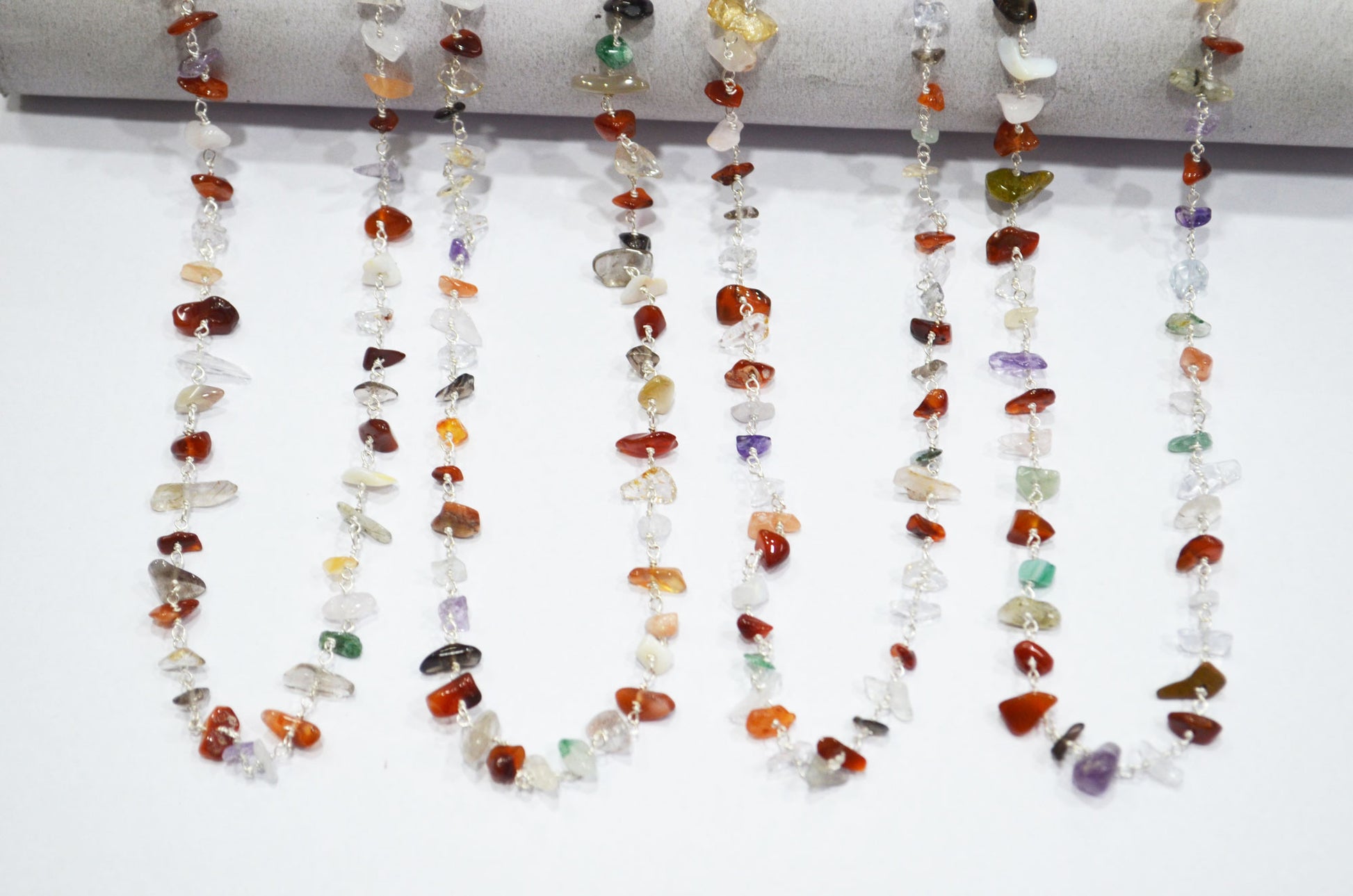Mix Semi Precious Organic Polished Irregular Flat Chips Rosary Beaded Chain , Mix Semi Precious Smooth Rough Nuggets Chips Wire Wrapped Chain , 3 - 5 mm , RB-5897