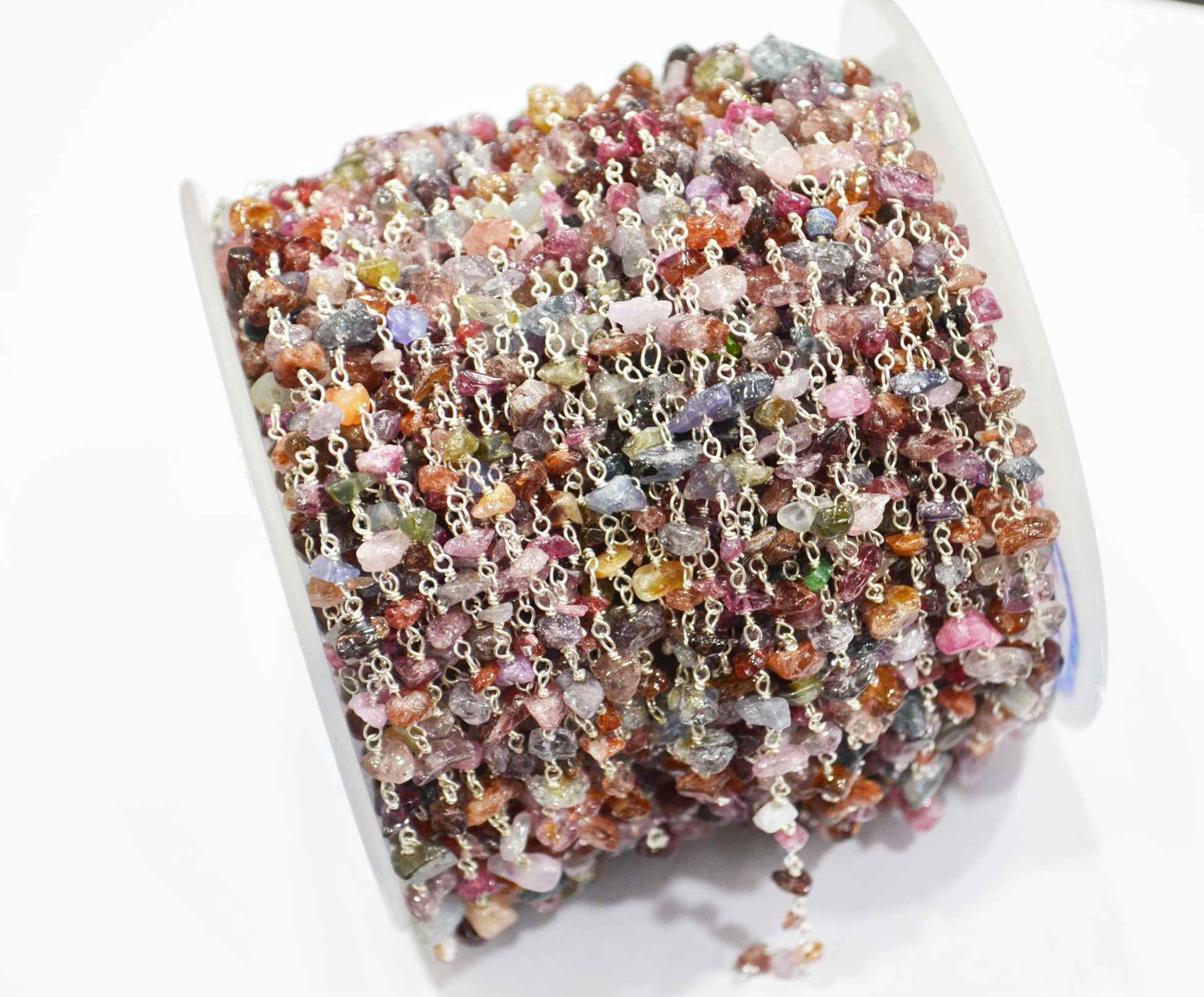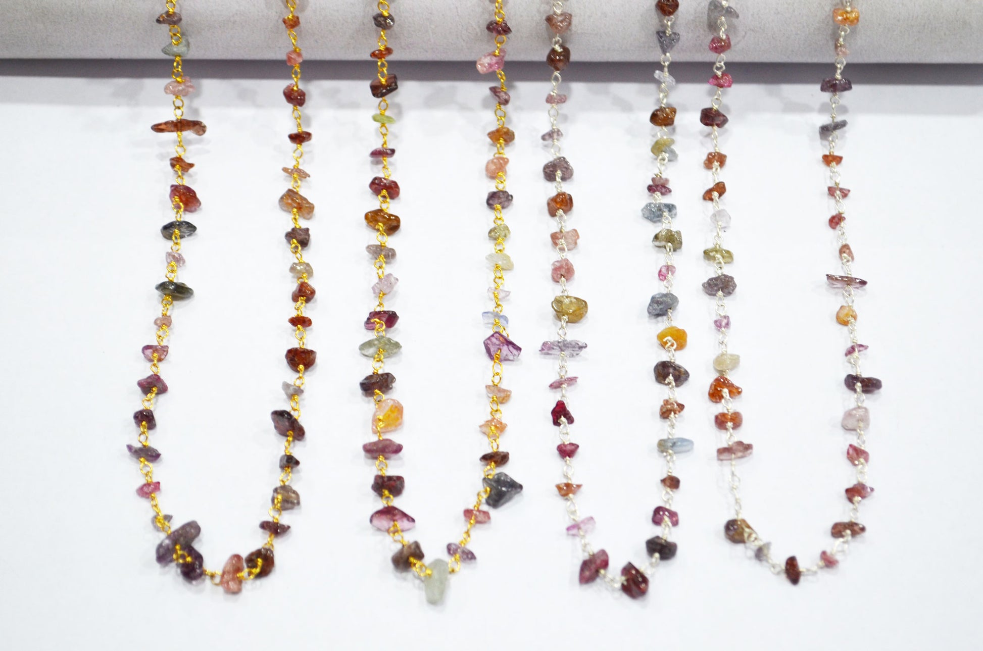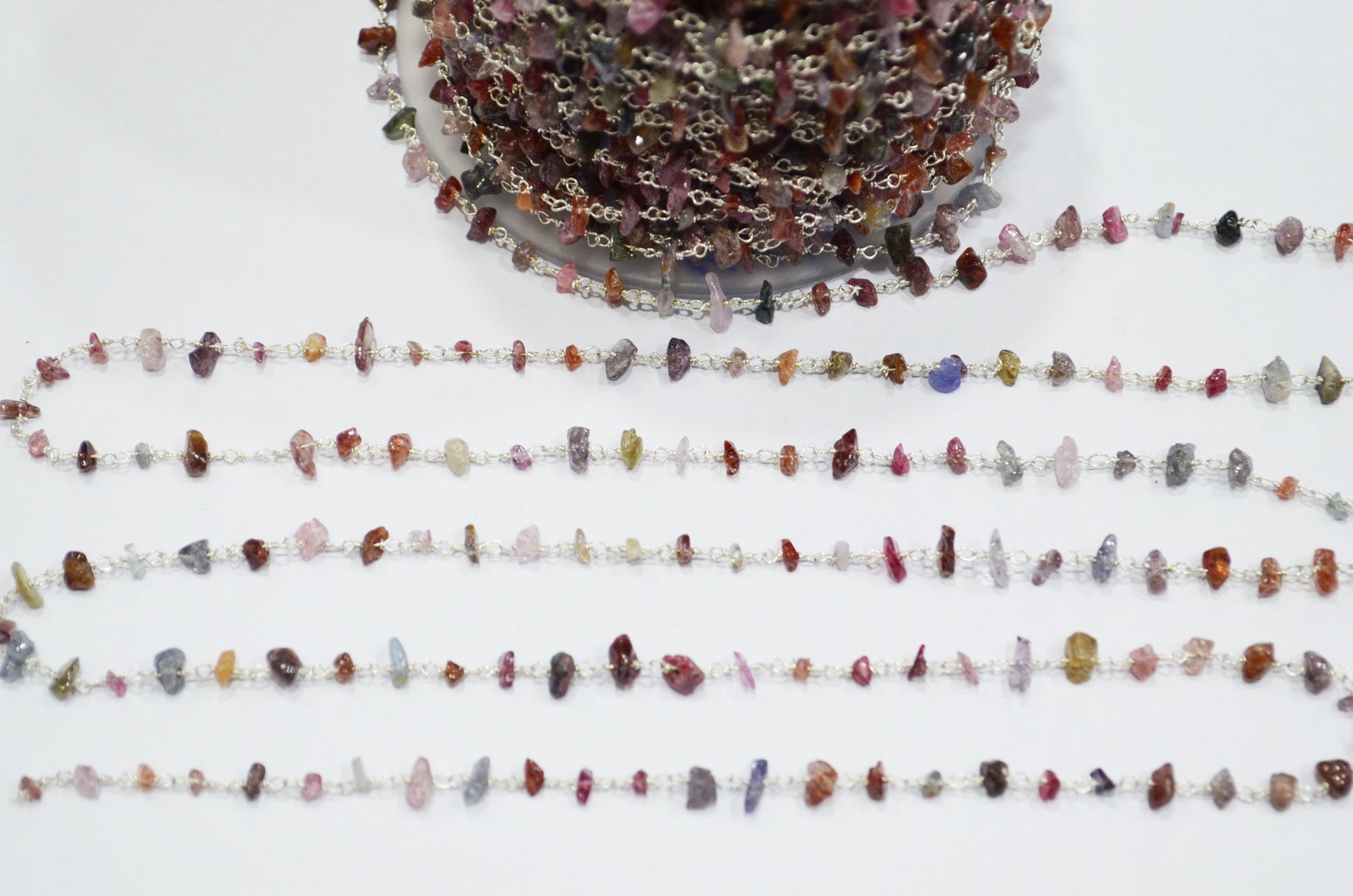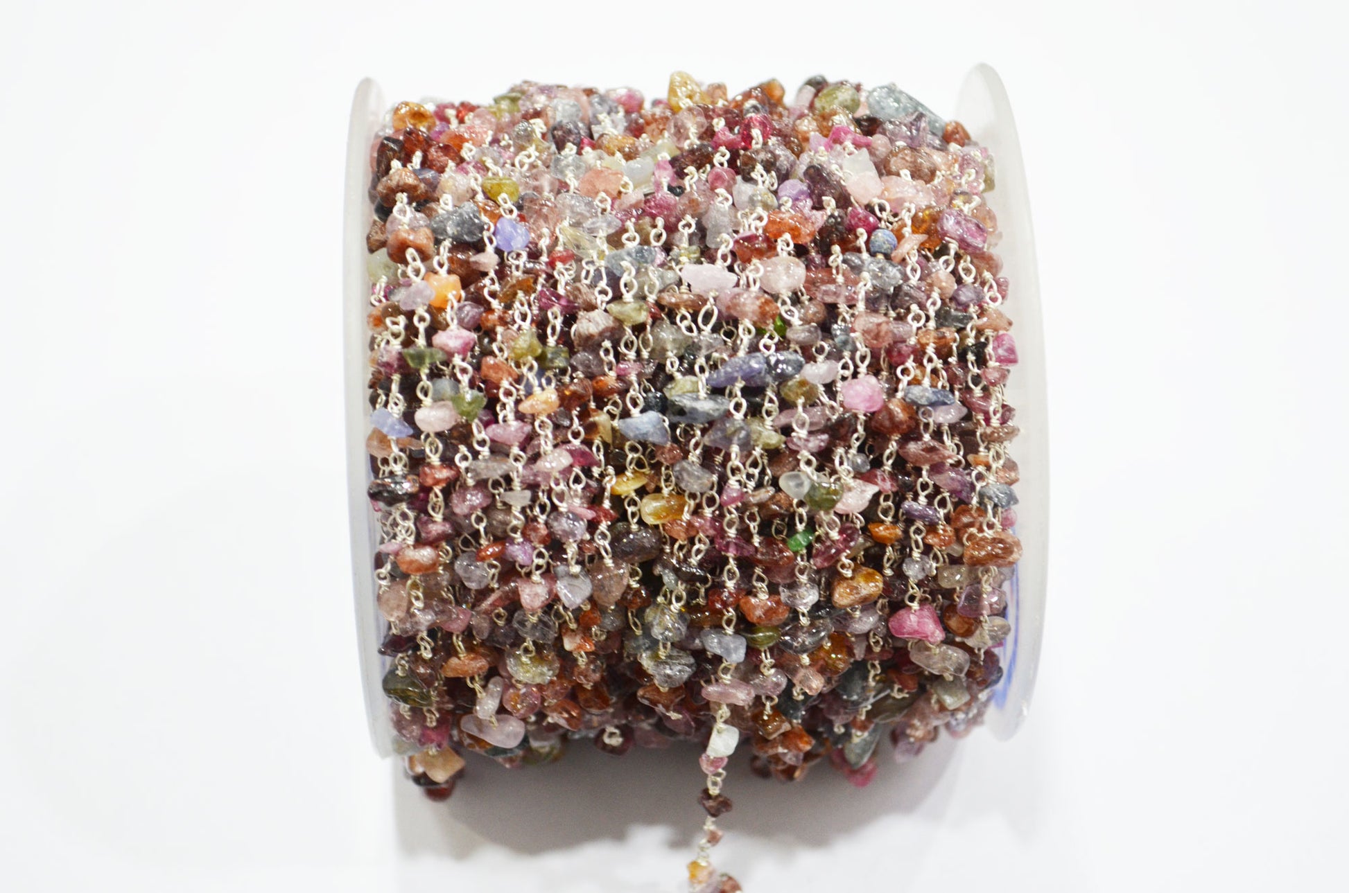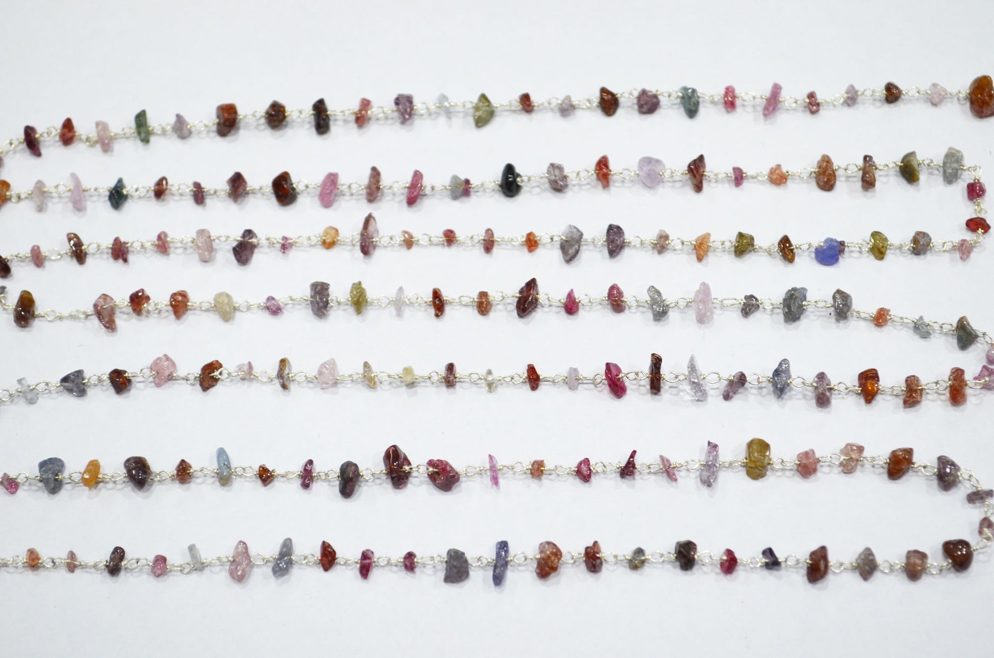Multi Sapphire Smooth Irregular Flat Chips Shape Rosary Beaded Chain , Multi Sapphire Rough Nuggets Wire Wrapped Chain , 2 - 4 mm , RB-6114