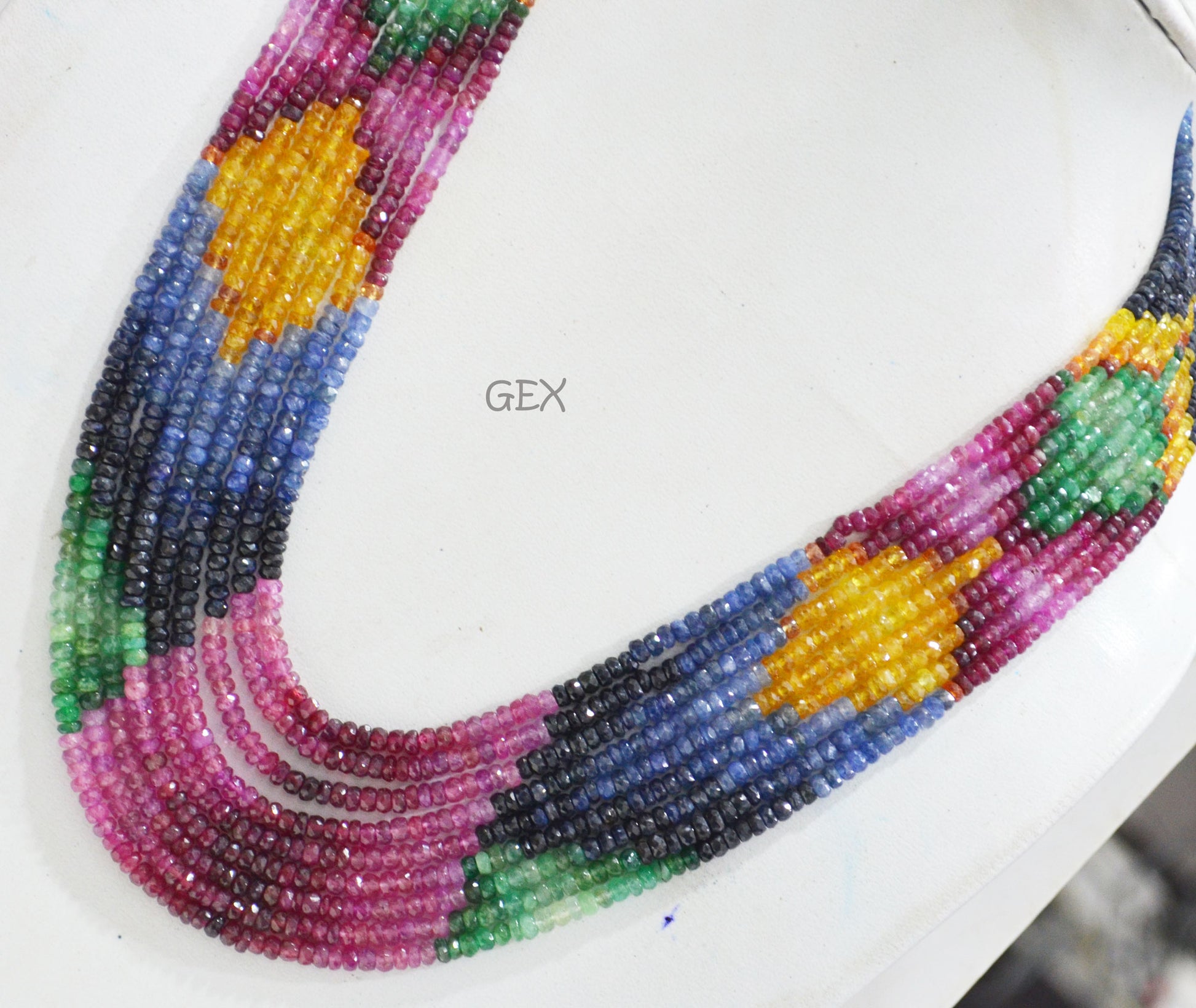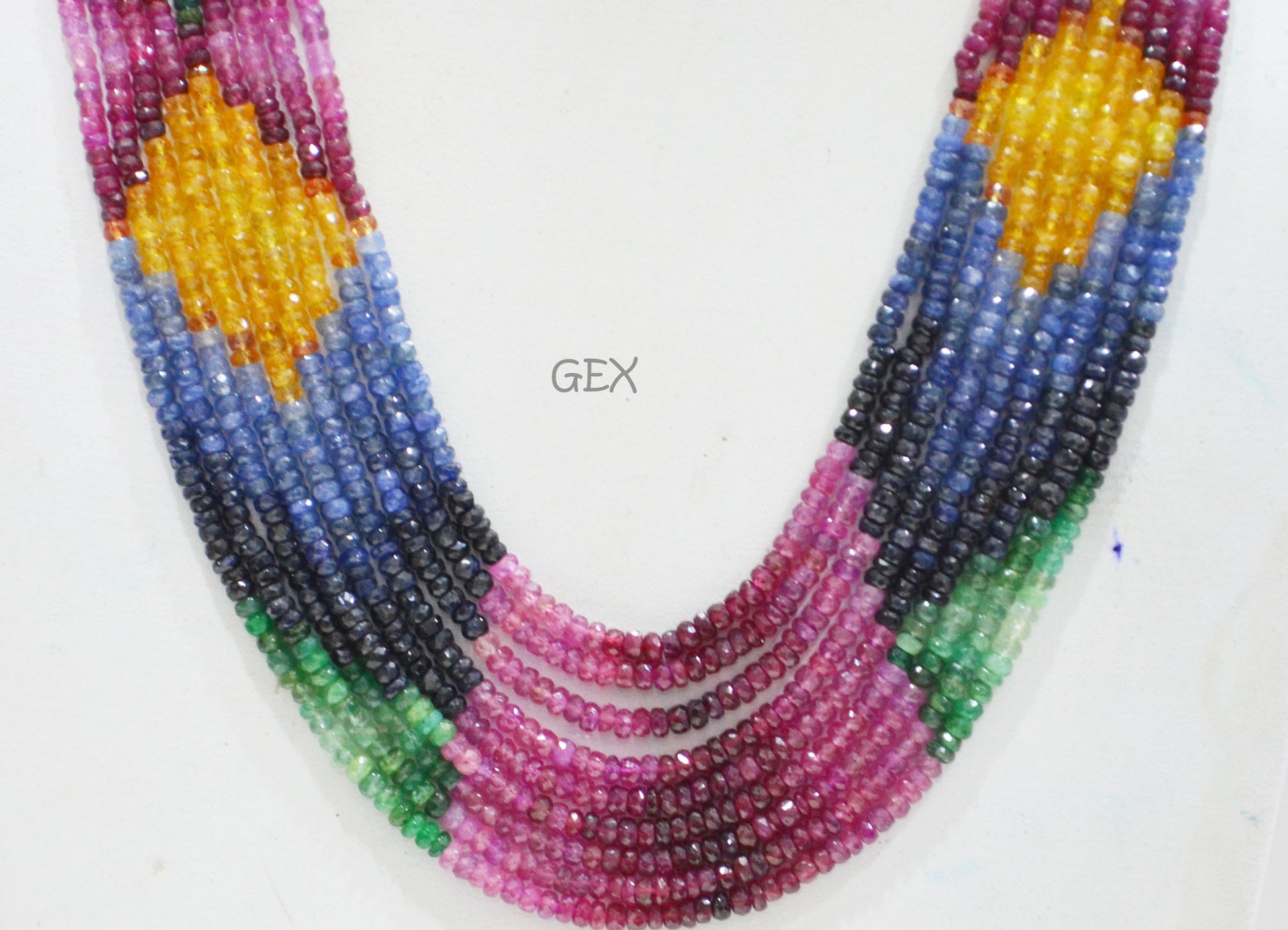 Multi Semi Precious Faceted Rondelle Shape Necklace , Multi Semi Precious Gemstone 9 Line Necklace 16 - 20 Inches Long With Adjustable Tussle , 3.75 - 4 mm , 32048