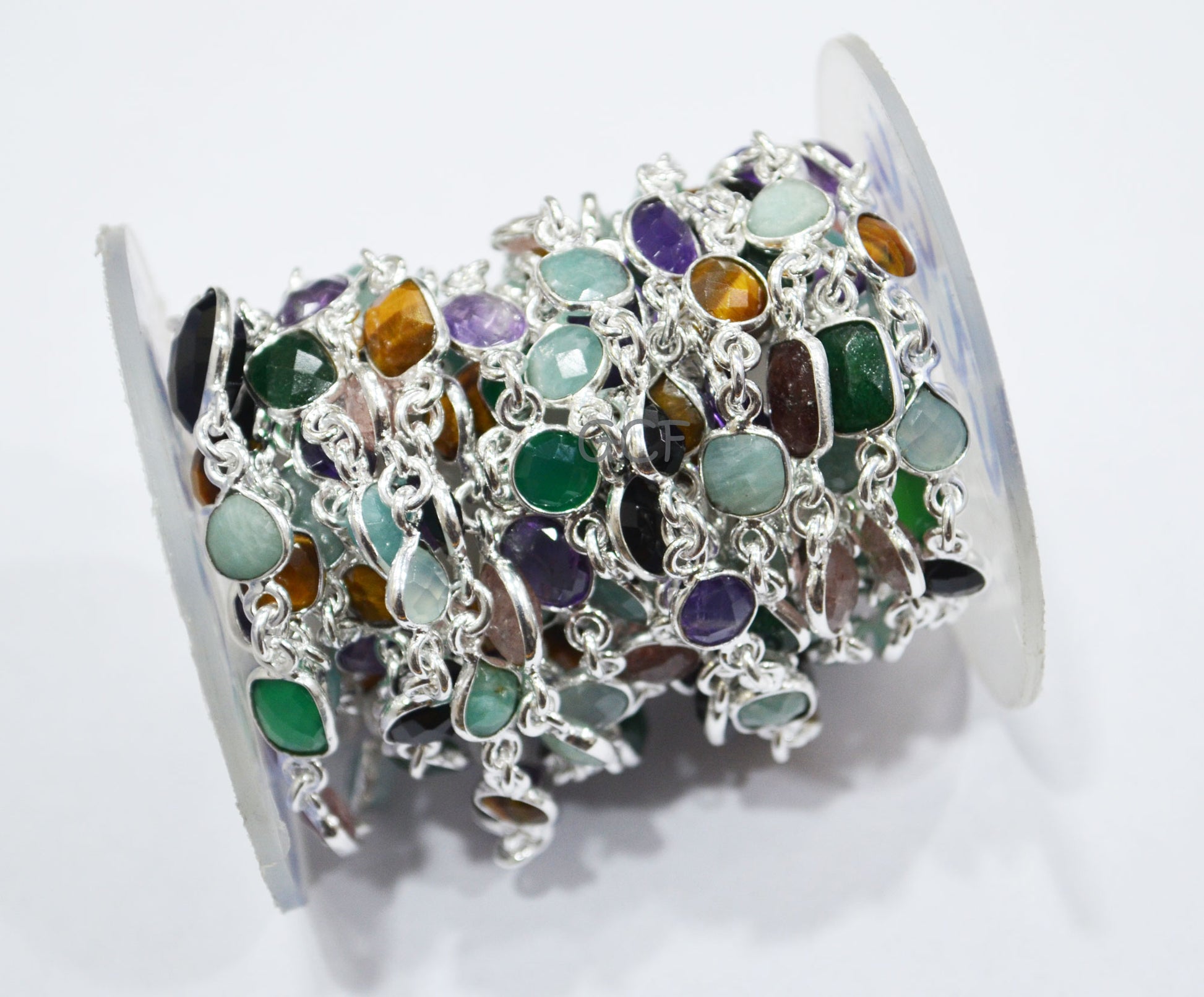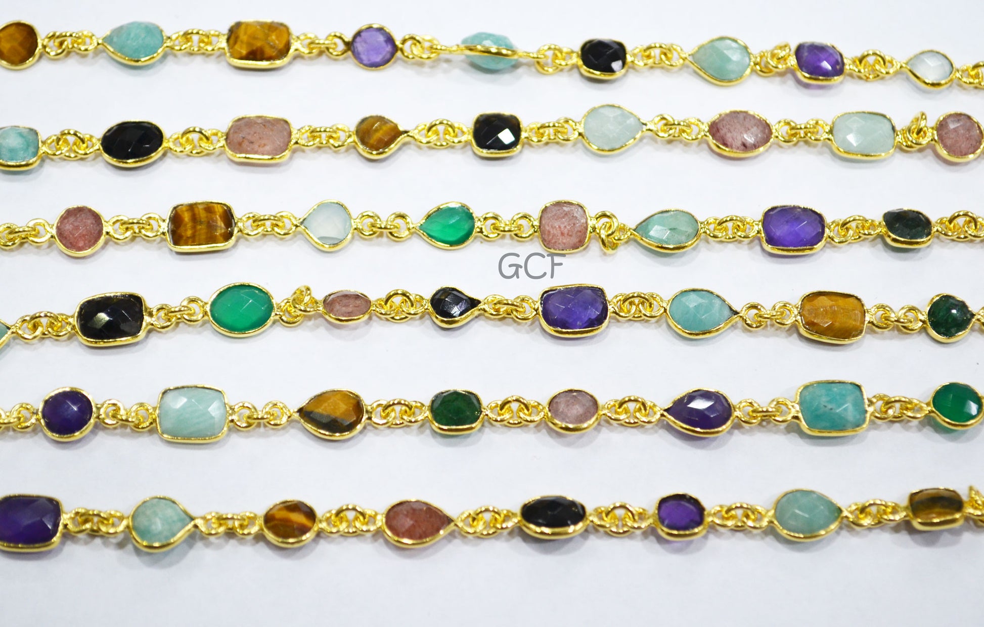 Multi Semi Precious Stone Mix Shape Faceted Connector Chain , Multi Semi Precious Gemstone Bezel Link Chain , 6 - 9 mm , 6867