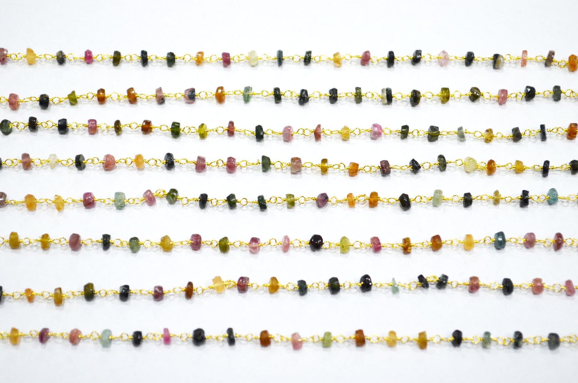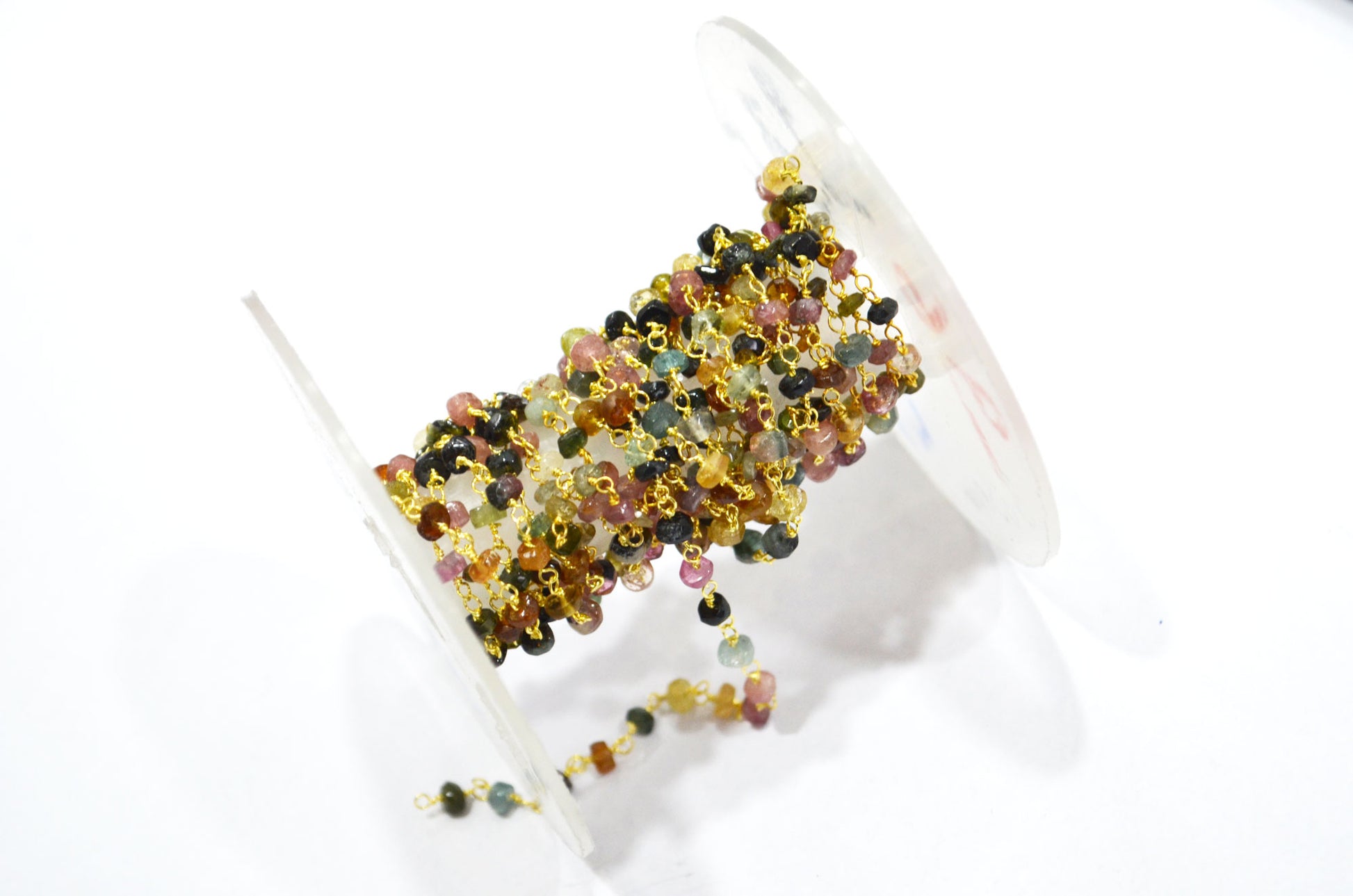 Multi Tourmaline Faceted Rondelle Shape Rosary Beaded Chain , Multi Tourmaline Wire Wrapped Chain , Sold By Foot , 4 - 4.50 mm , RB-5840