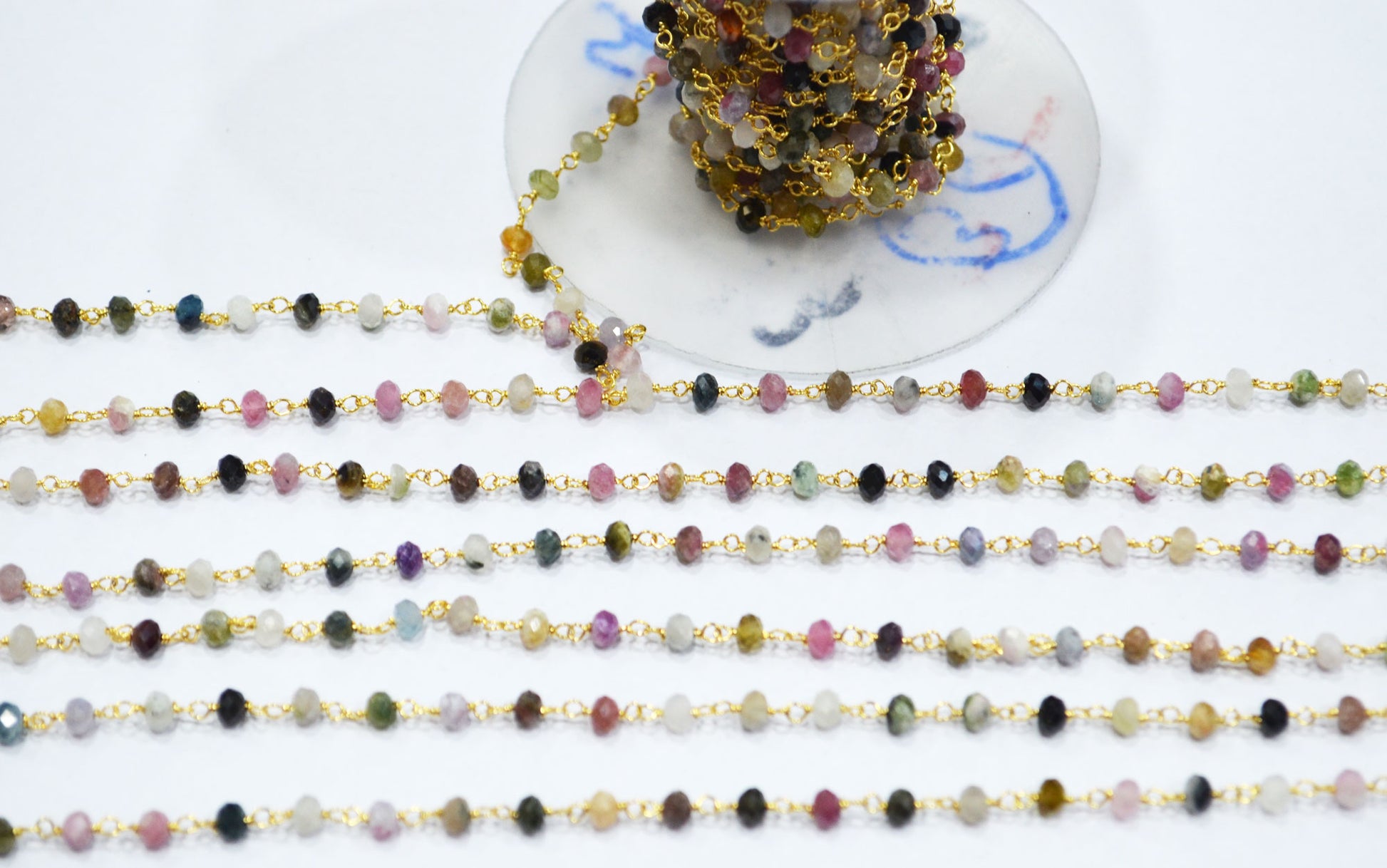 Multi Tourmaline Faceted Rondelle Shape Rosary Beaded Chain , Multi Tourmaline Wire Wrapped Chain , Sold By Foot , 3.50 mm , RB-6716