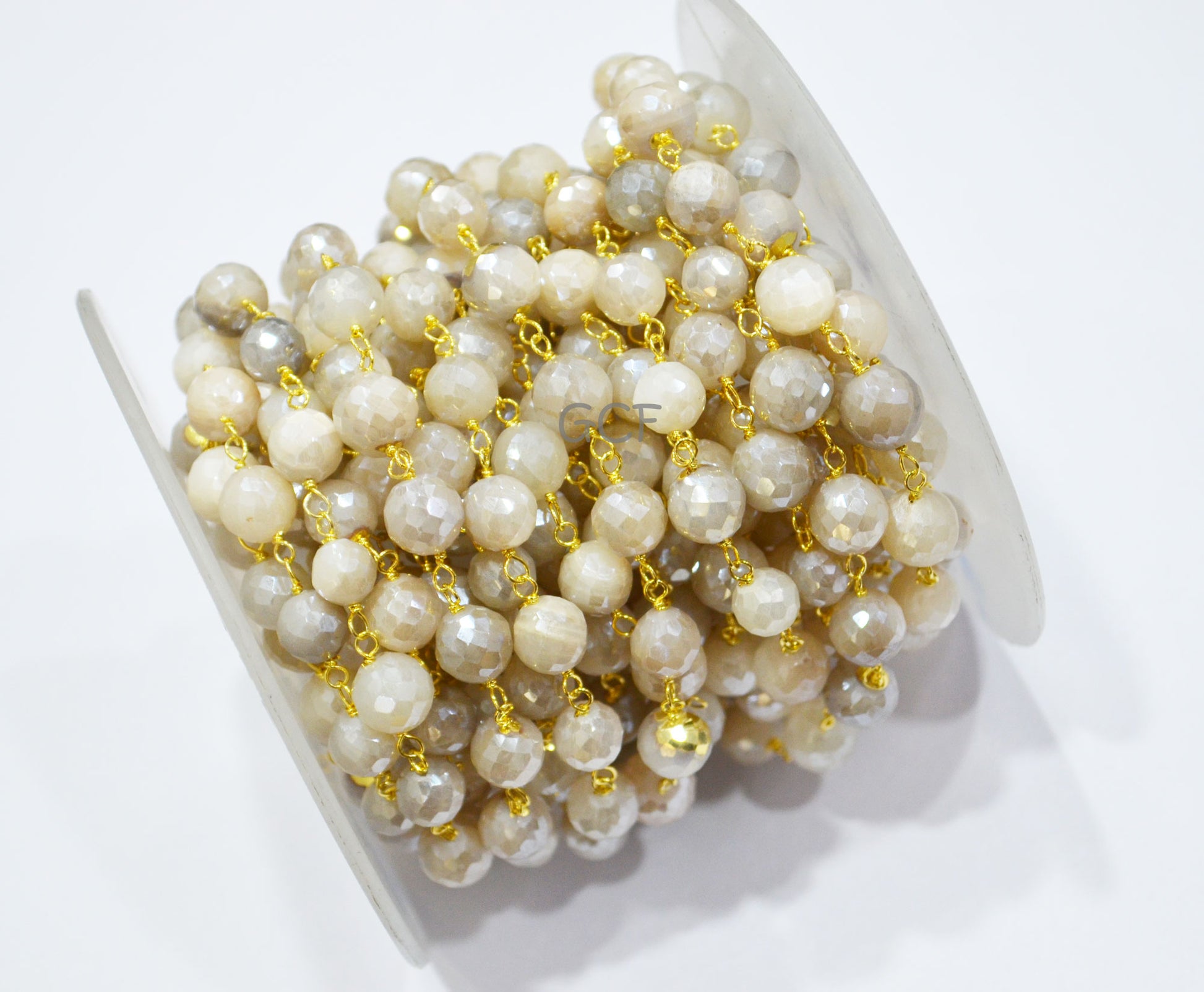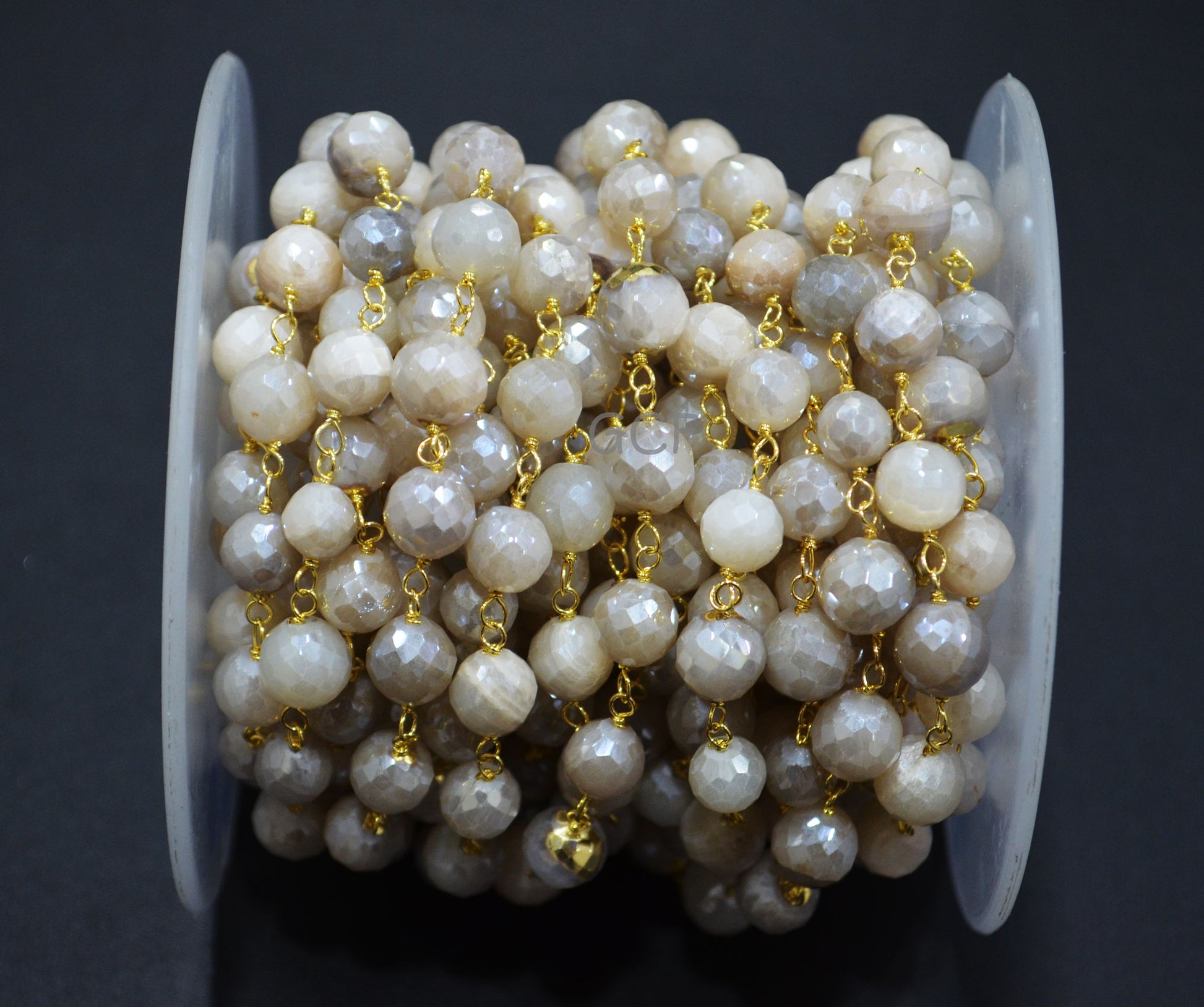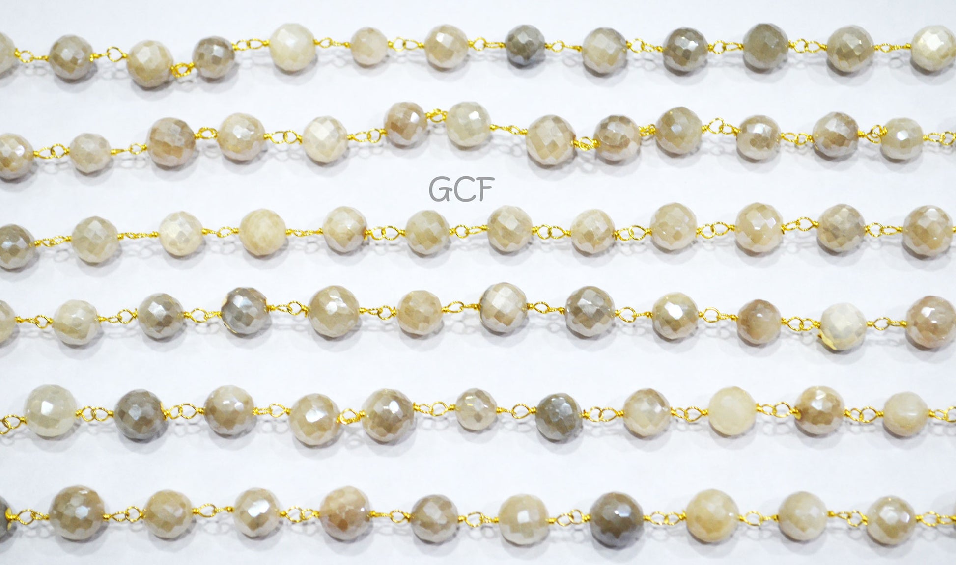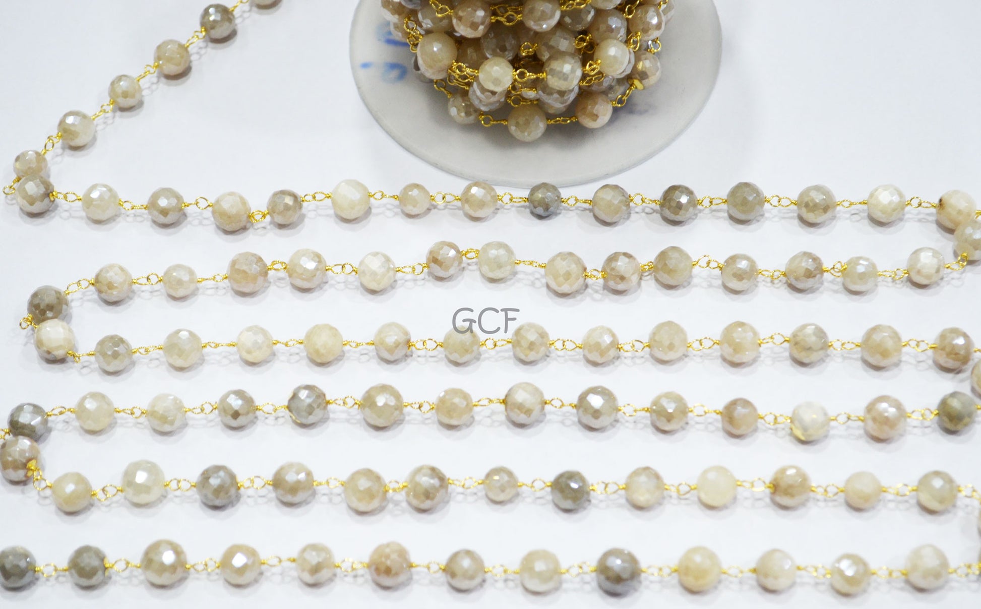Mystic Ceylon Moonstone Faceted Round Shape Rosary Beaded Chain , Mystic Ceylon Moonstone Wire Wrapped Chain , 7 - 9 mm , RB-7118