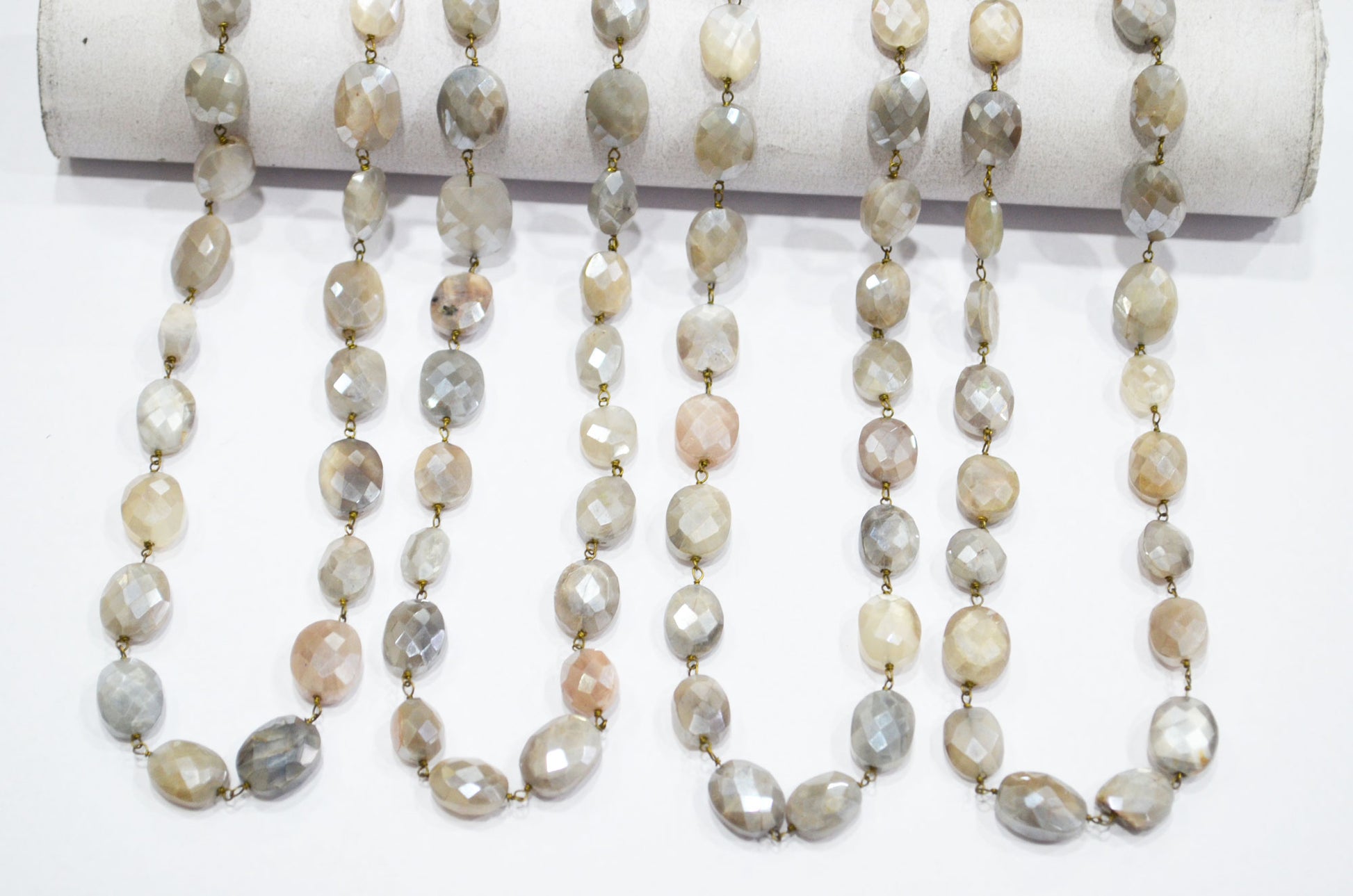 Mystic Gray Moonstone Faceted Oval Shape Rosary Beaded Chain , Mystic Gray Moonstone Wire Wrapped Chain , 10 - 12 mm , RB-5814