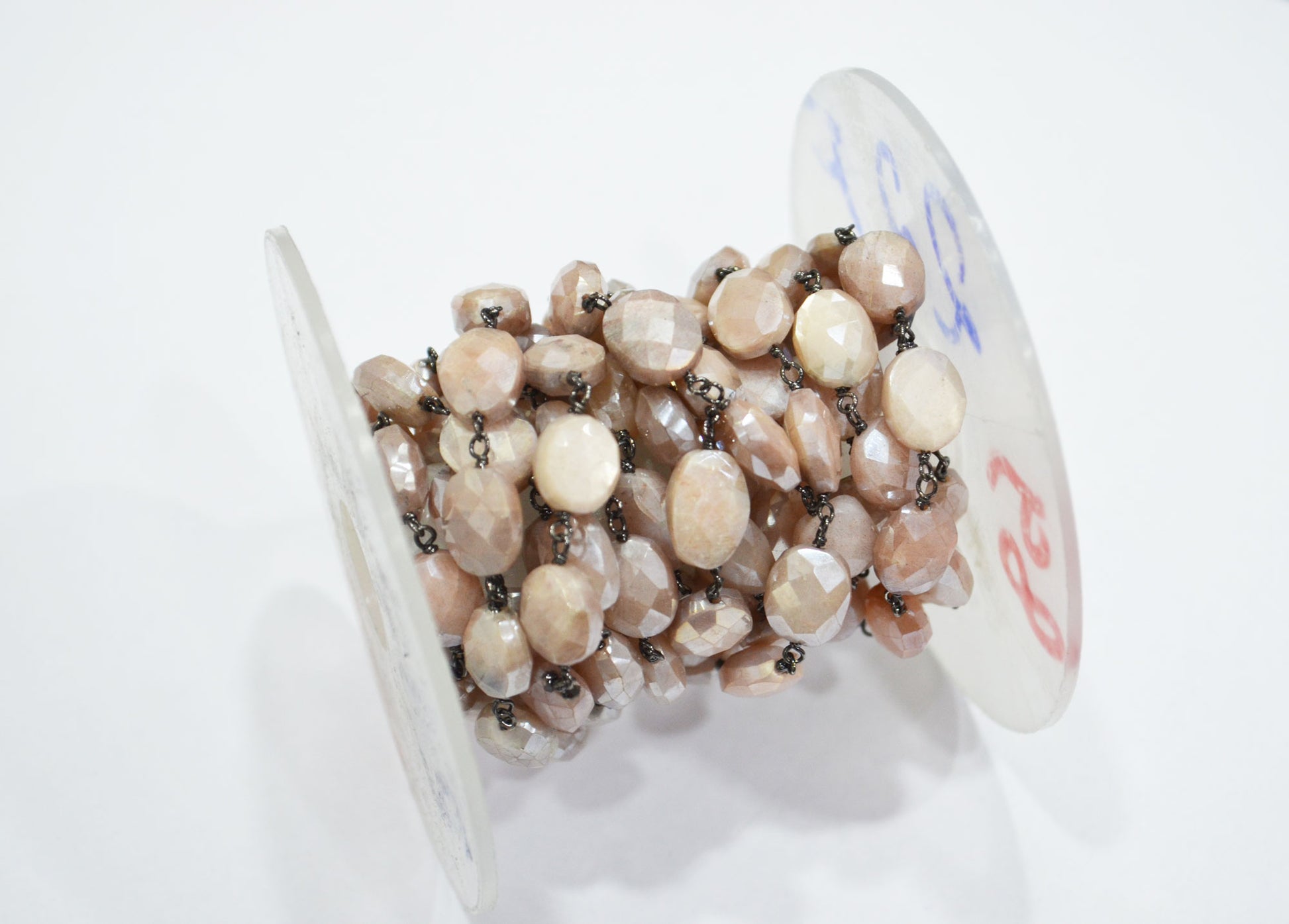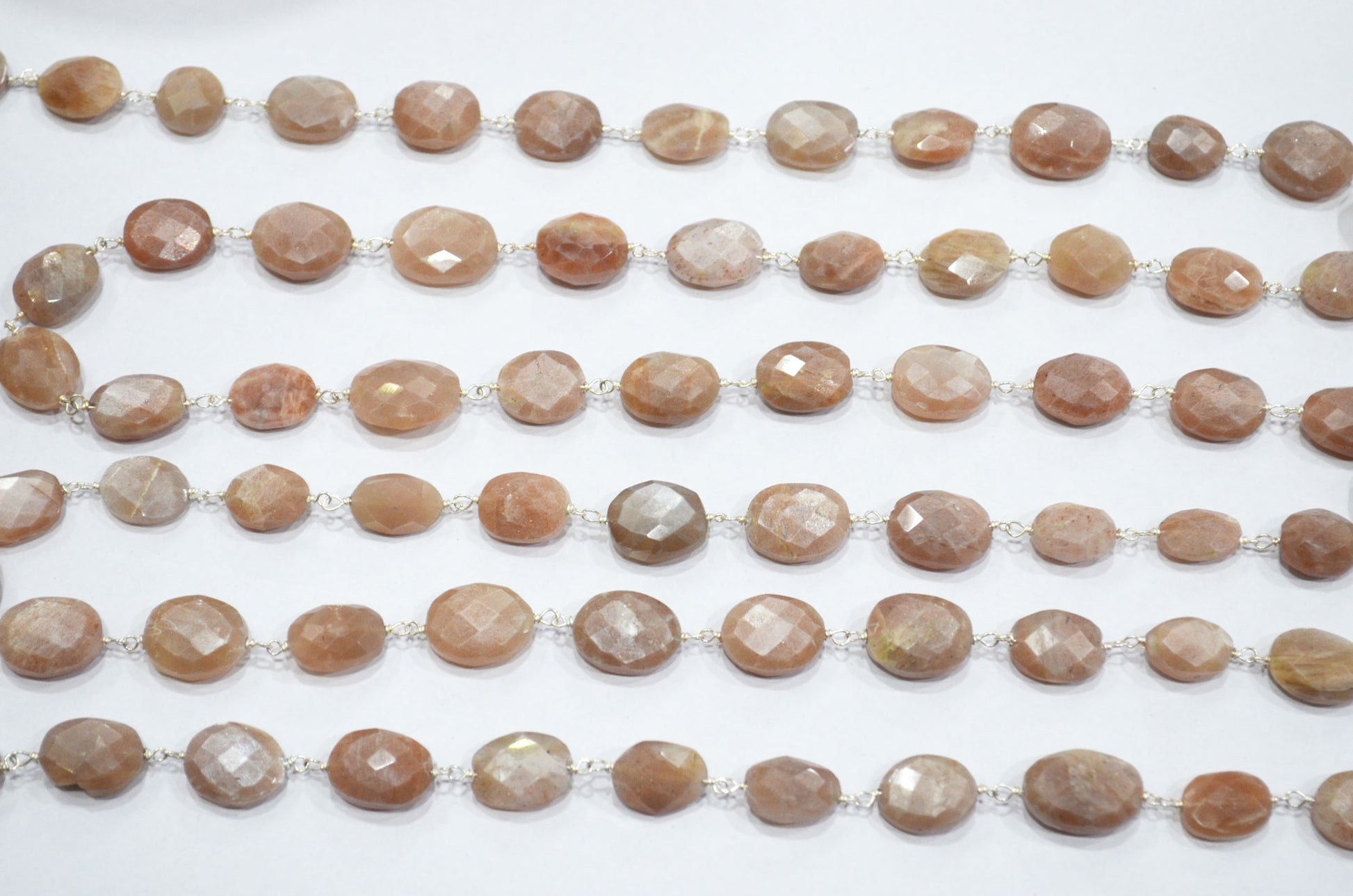 Mystic Peach Moonstone Faceted Oval Shape Rosary Beaded Chain , Mystic Peach Moonstone Wire Wrapped Chain , 9 - 11 mm , RB-5784
