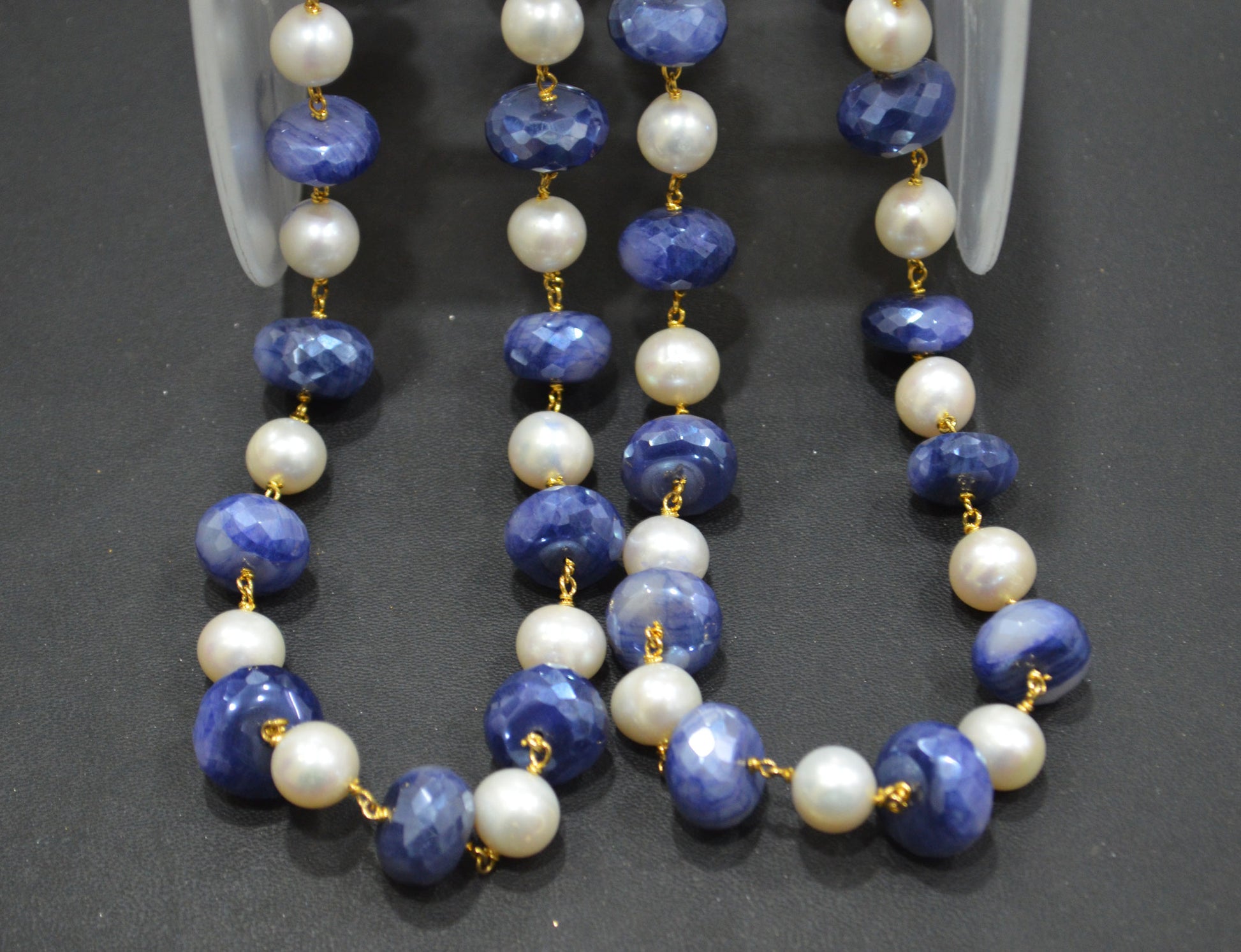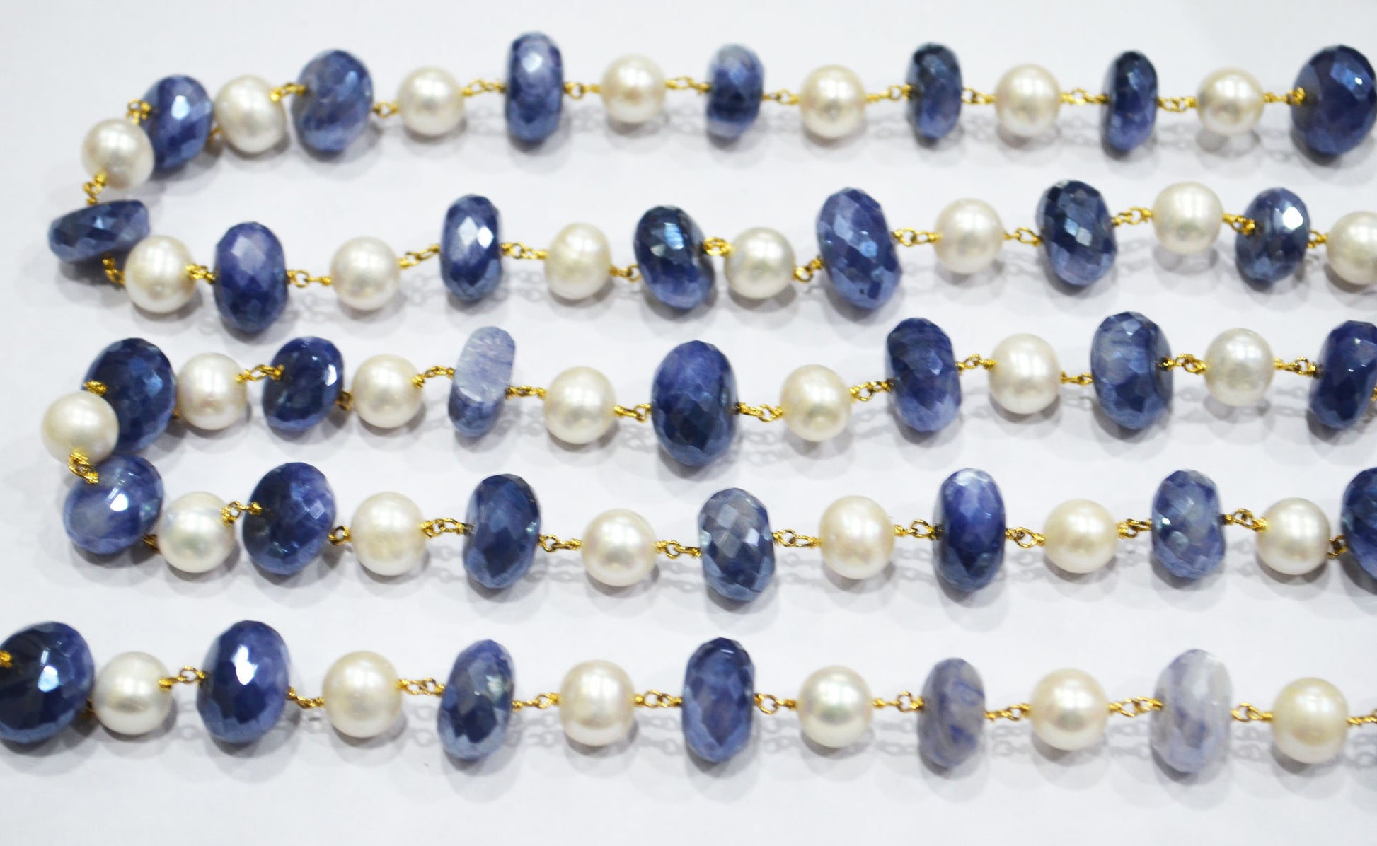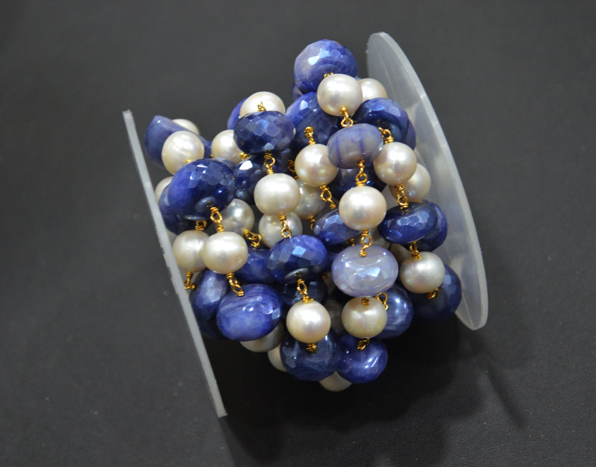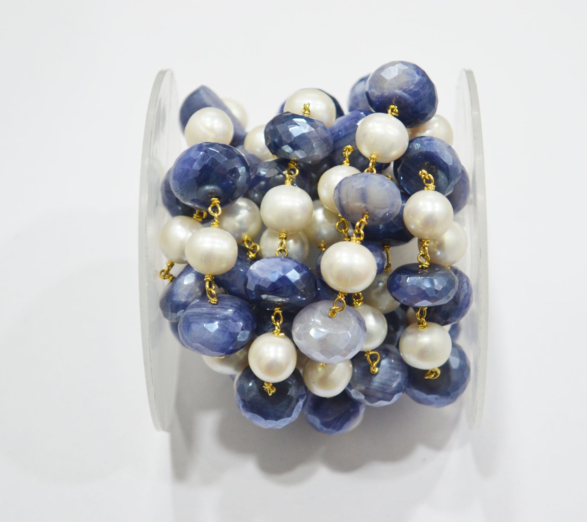 Mystic Sapphire Moonstone Faceted Rondelle Shape Rosary Beaded Chain , Pearl Smooth Round Shape Wire Wrapped Chain , 10 - 11 mm , RB-6406
