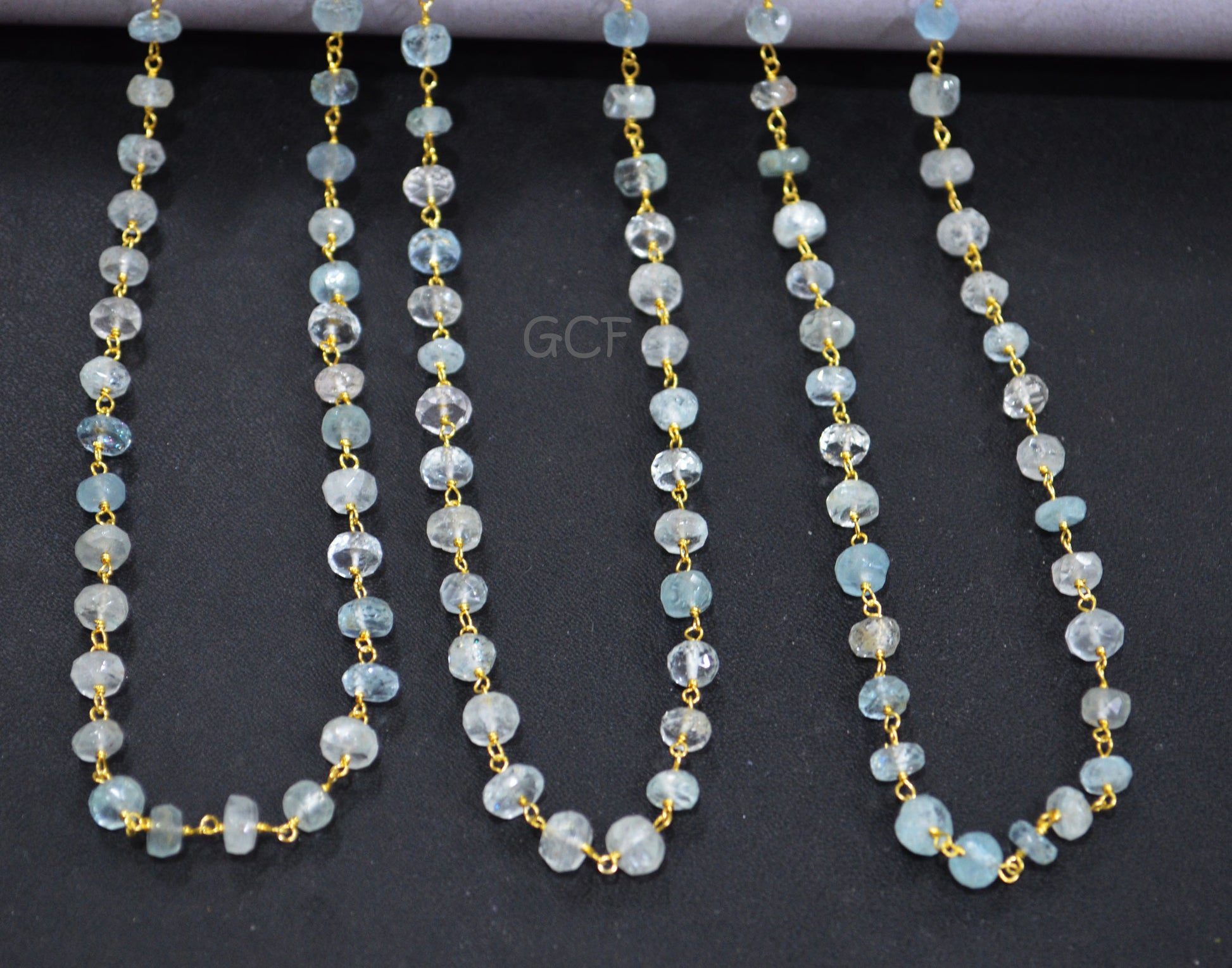 Natural Aquamarine Rondelle Rosary Beaded Chain , Aquamarine Faceted Rondelle Shape Wire Wrapped ChainΒ , 5 - 5.50 mm ,RB-7005