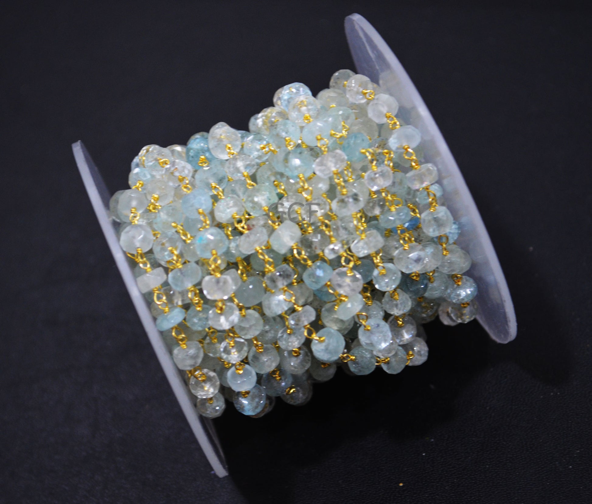 Natural Aquamarine Rondelle Rosary Beaded Chain , Aquamarine Faceted Rondelle Shape Wire Wrapped Chain , 5 - 5.50 mm ,RB-7005