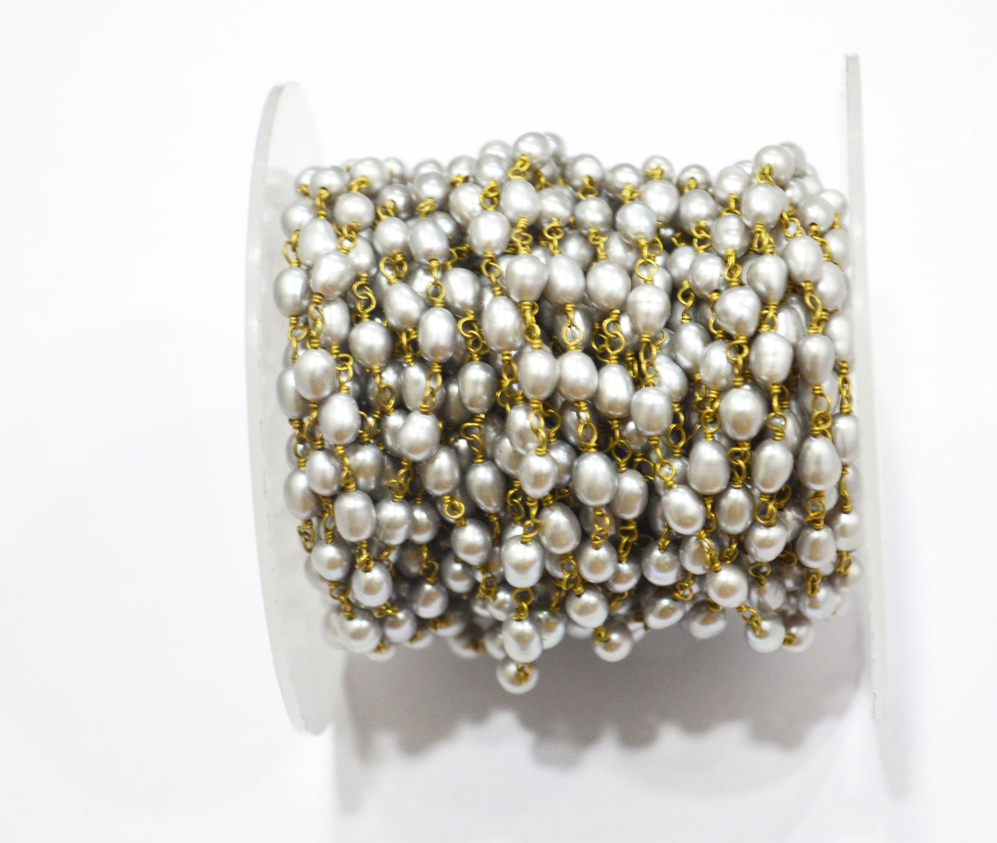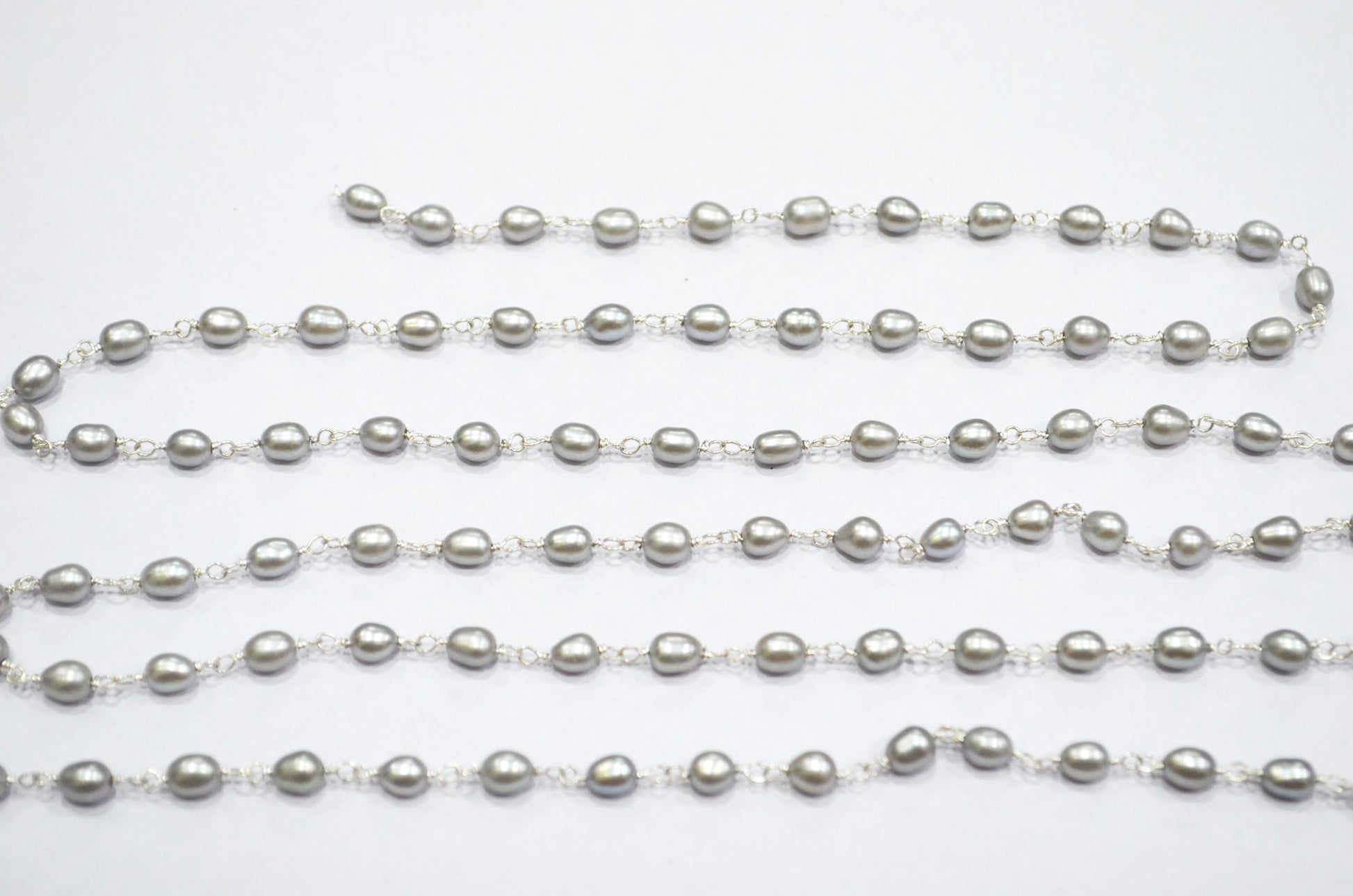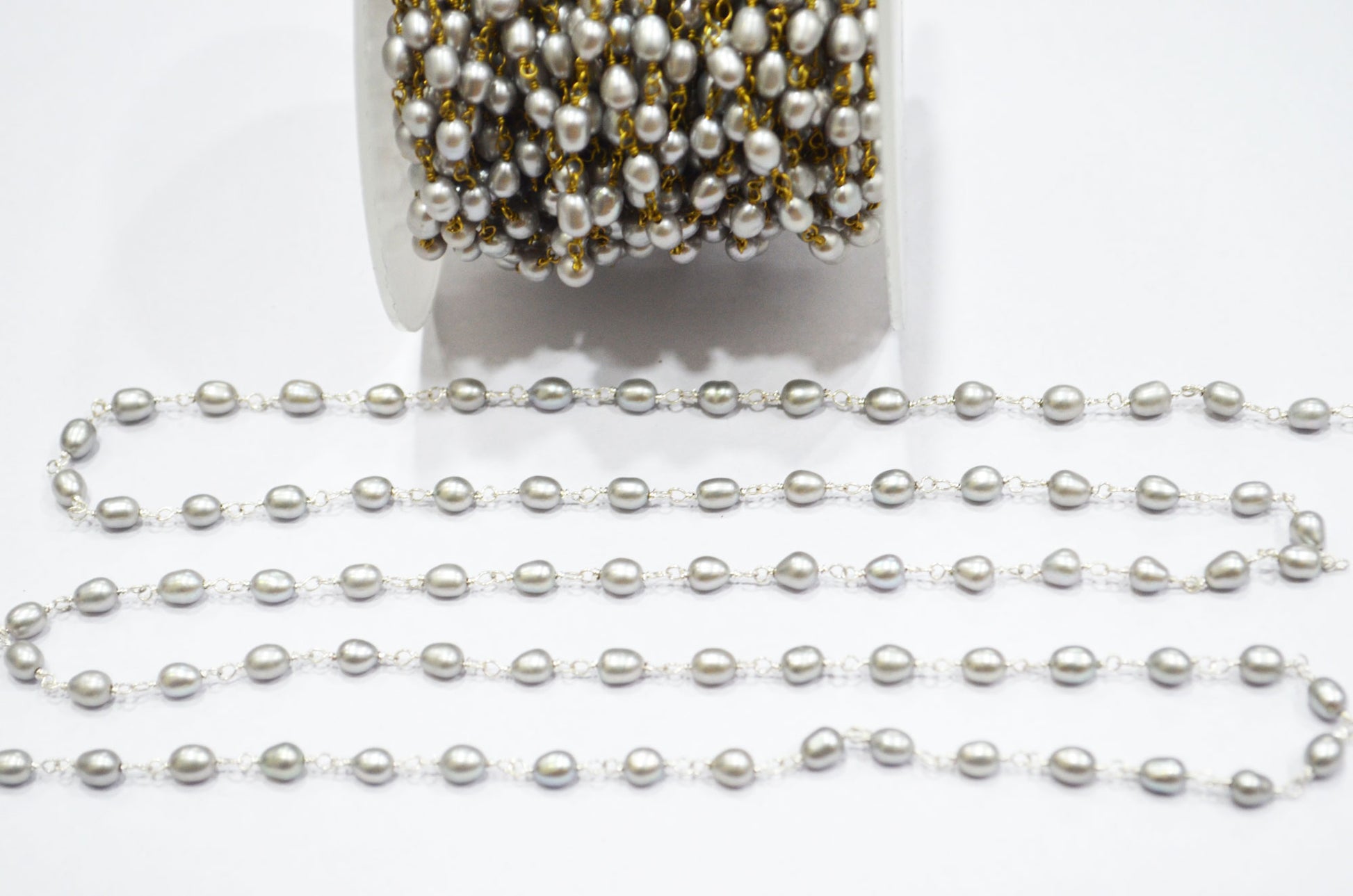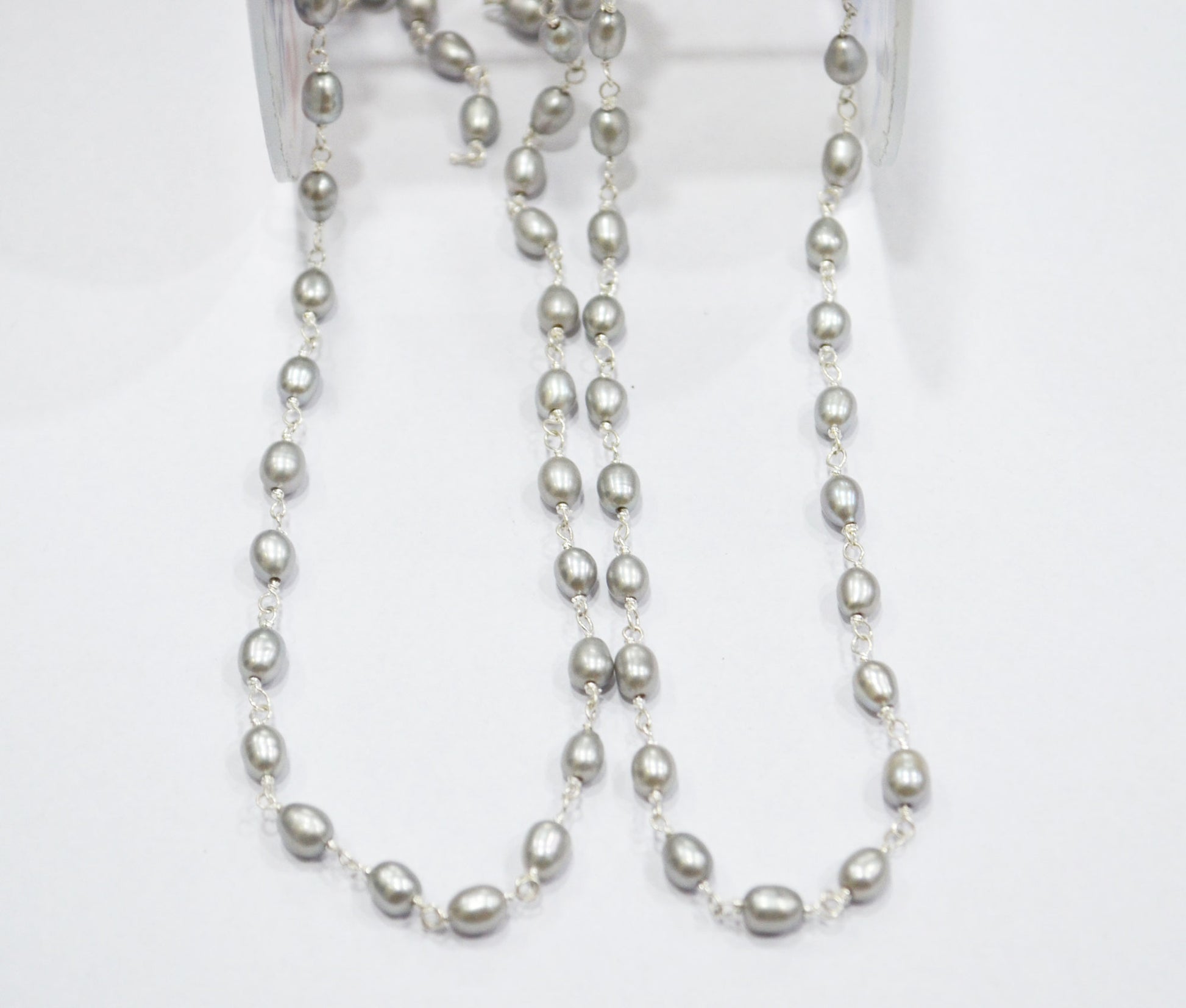 Natural Grey Rice Pearl Smooth Nuggets Shape Rosary Beaded Chain , Natural Grey Rice Pearl Wire Wrapped Chain , 4x5 mm , RB-6359