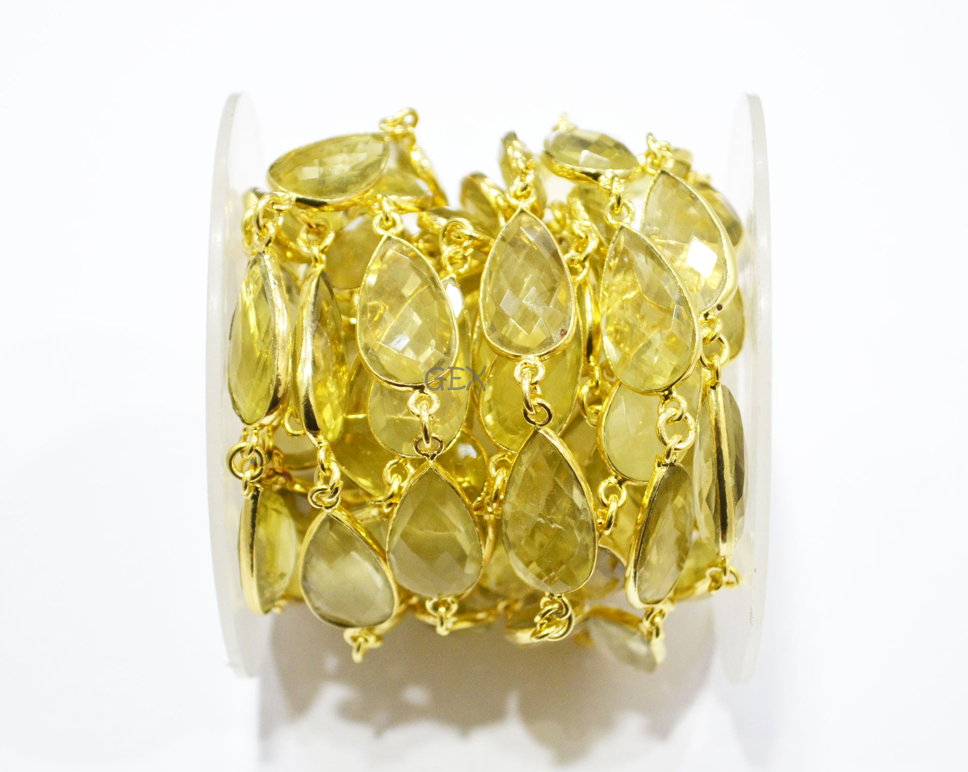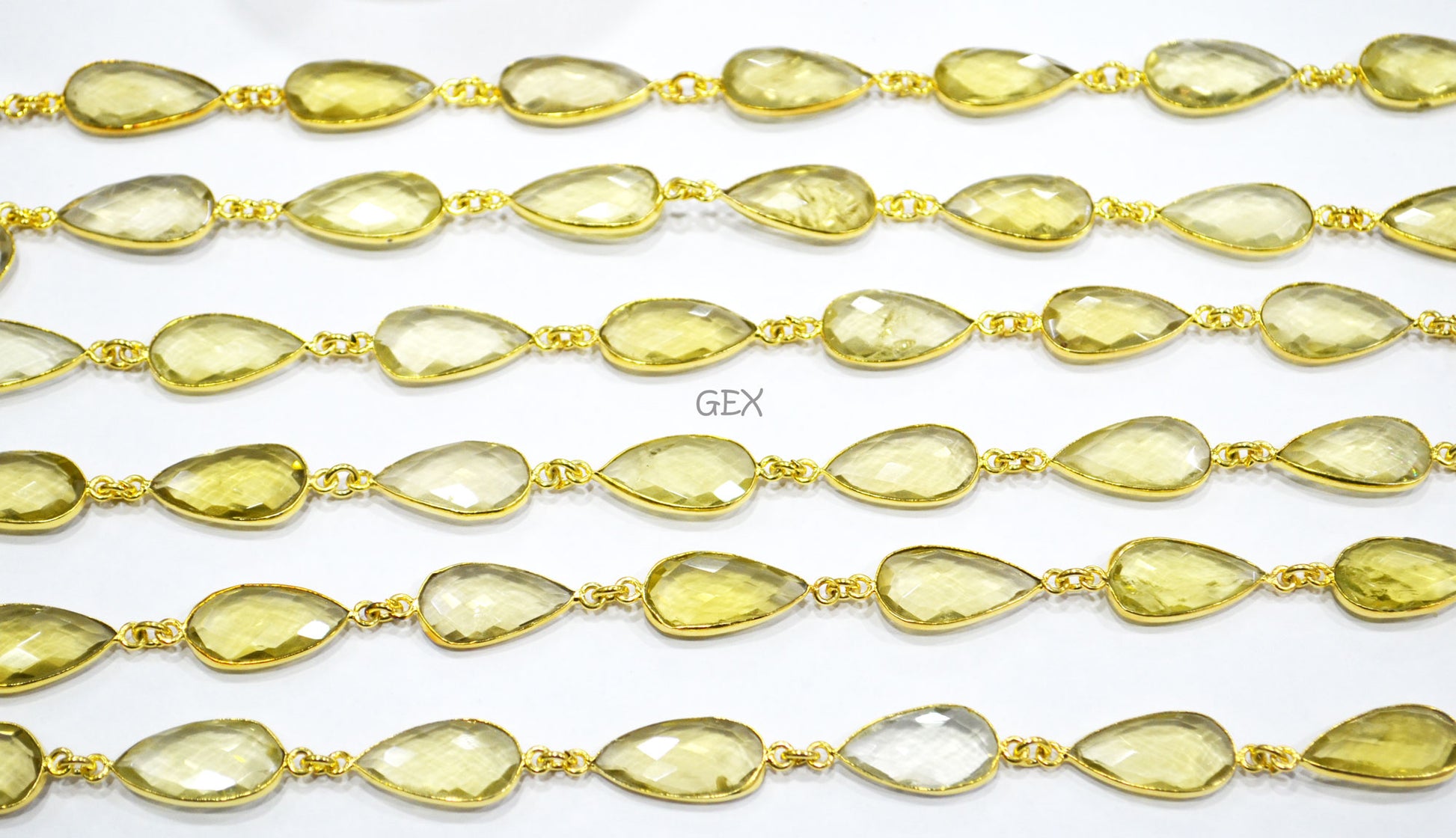 Natural Lemon Quartz Faceted Pear Shape Connector Chain , Natural Lemon Quartz Bezel Link Chain , 11x20 mm , RB-7245