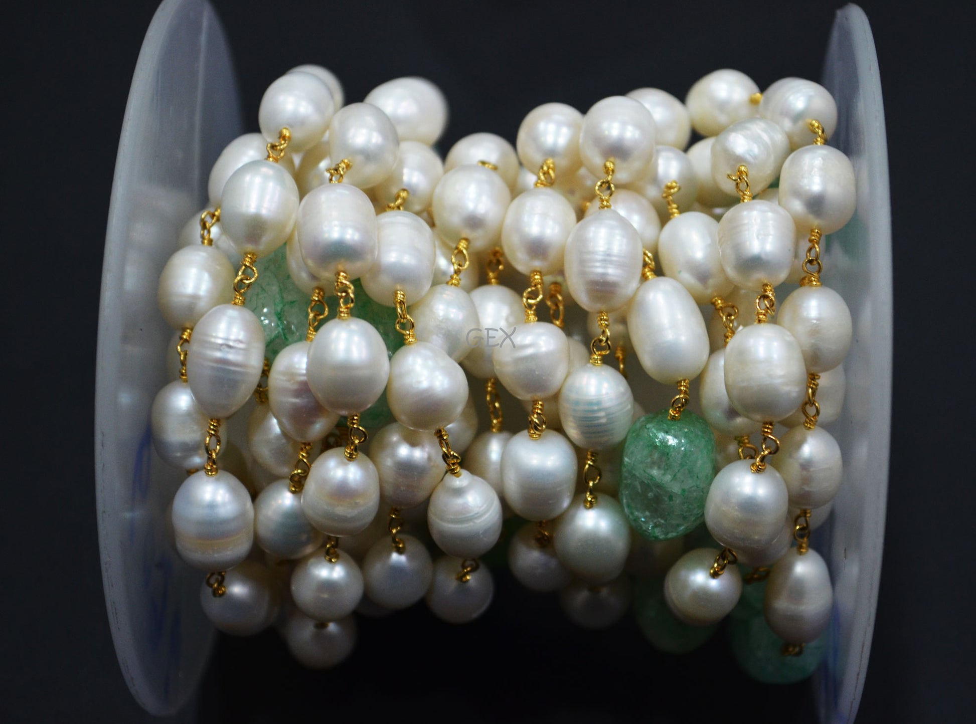 Natural Pearl Uneven Oval Smooth Rosary Beaded Chain , Dyed Emerald Nuggets Wire Wrapped Chain , 9x10 - 11x18 mm , 6735