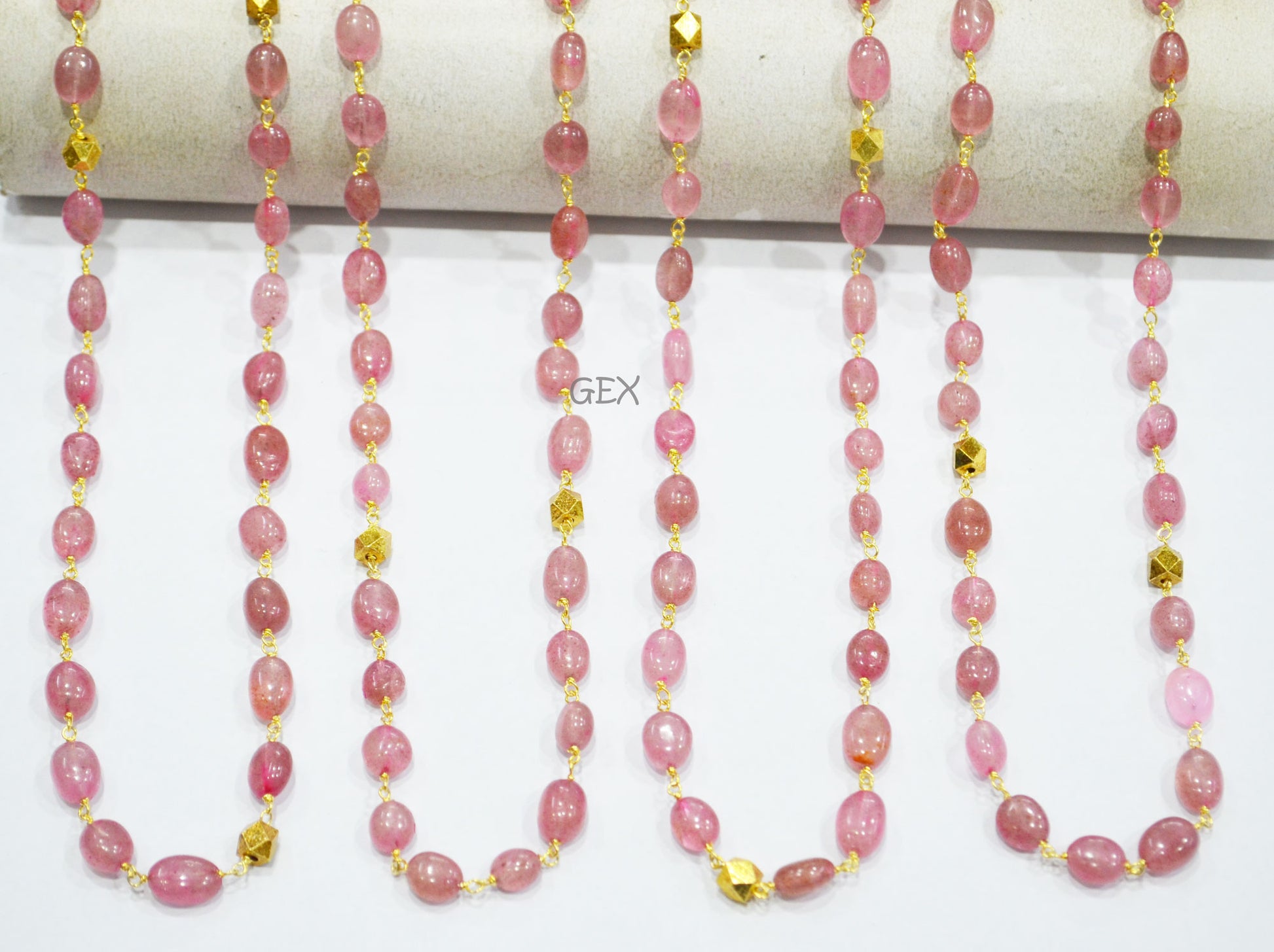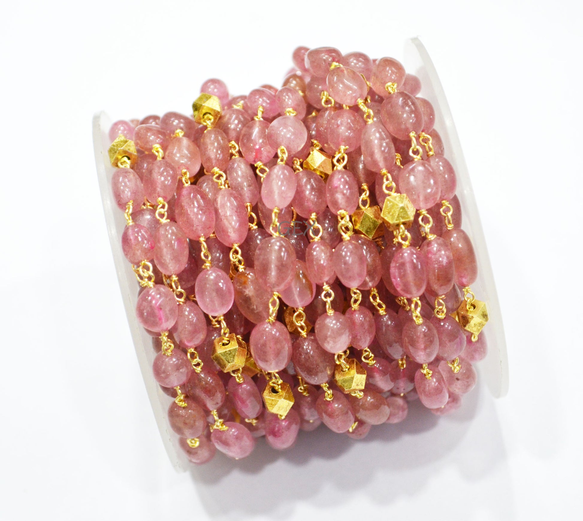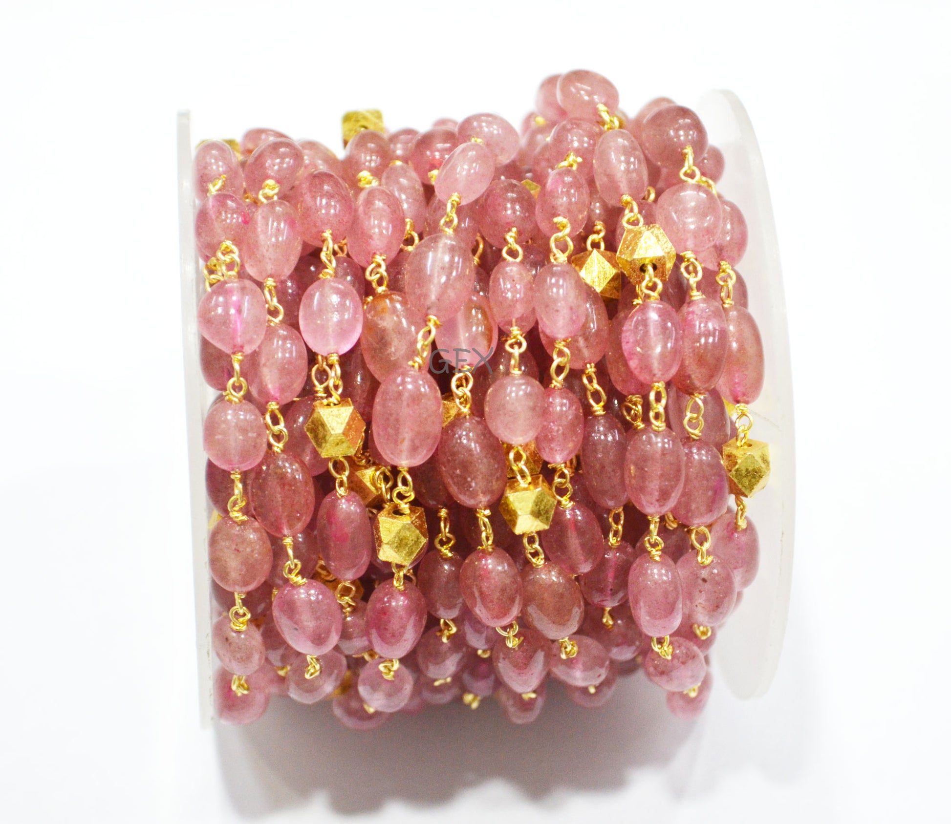 Natural Pink Strawberry Smooth Oval Nuggets Rosary Beaded Chain , Pink Strawberry With Brass Beads Wire Wrapped Chain , 6x8 - 7x10 mm , 7238