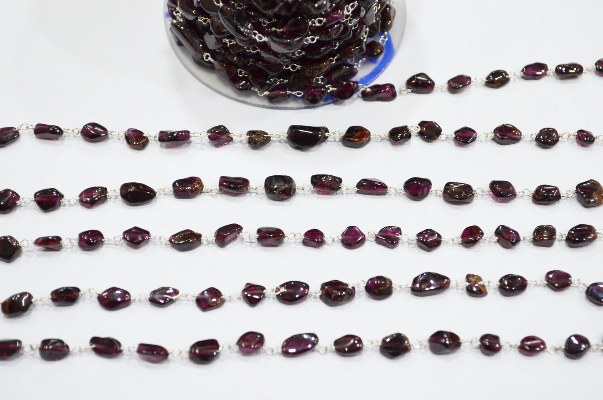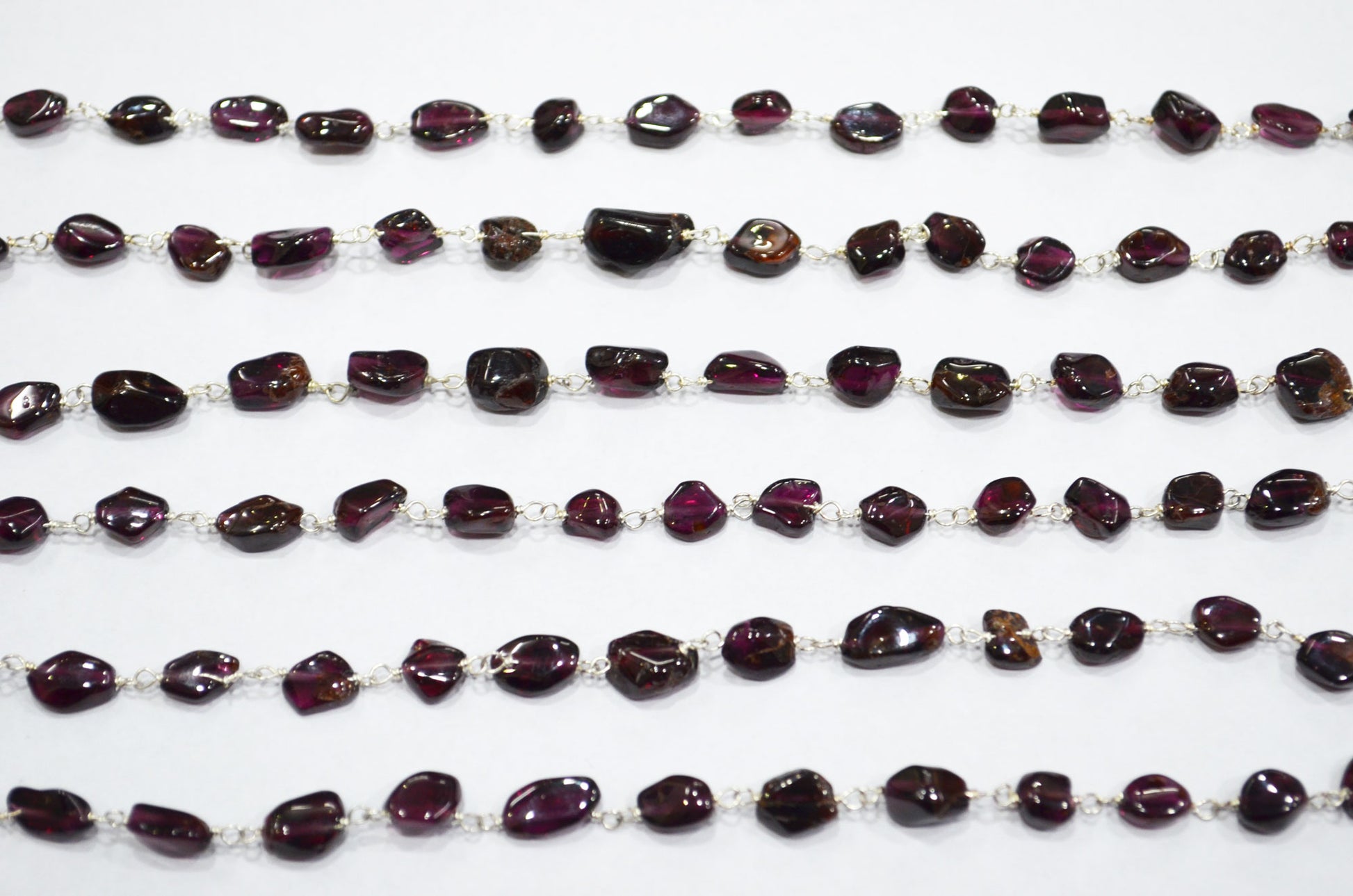 Natural Raw Organic Rhodolite Garnet Smooth Rosary Beaded Chain , Rhodolite Garnet Tumble Shape Wire Wrapped Chain , 4 - 7 mm , RB-6011