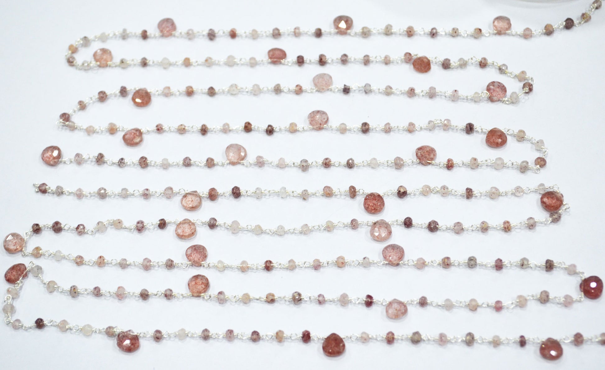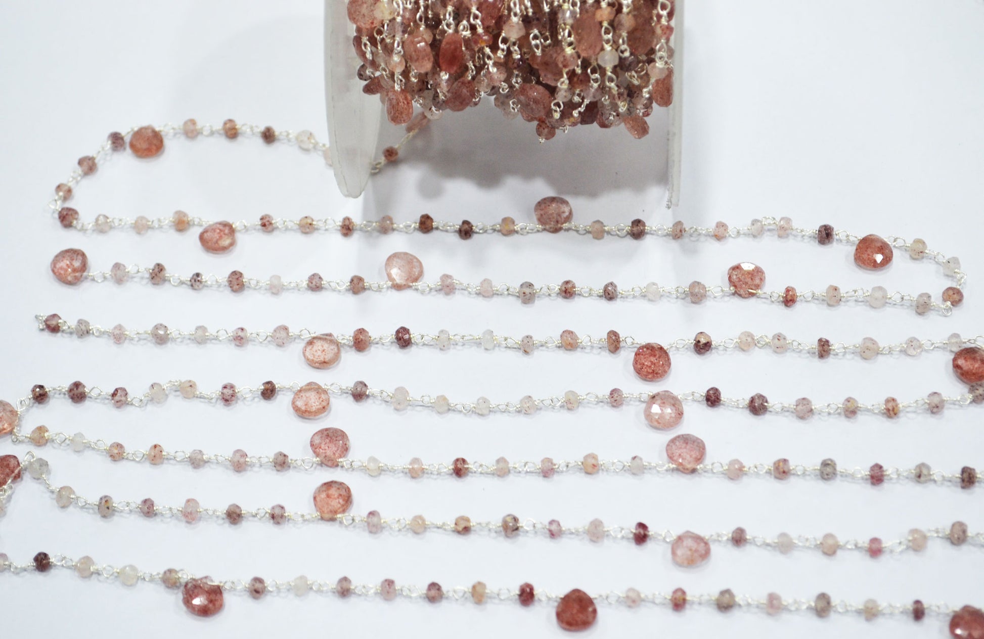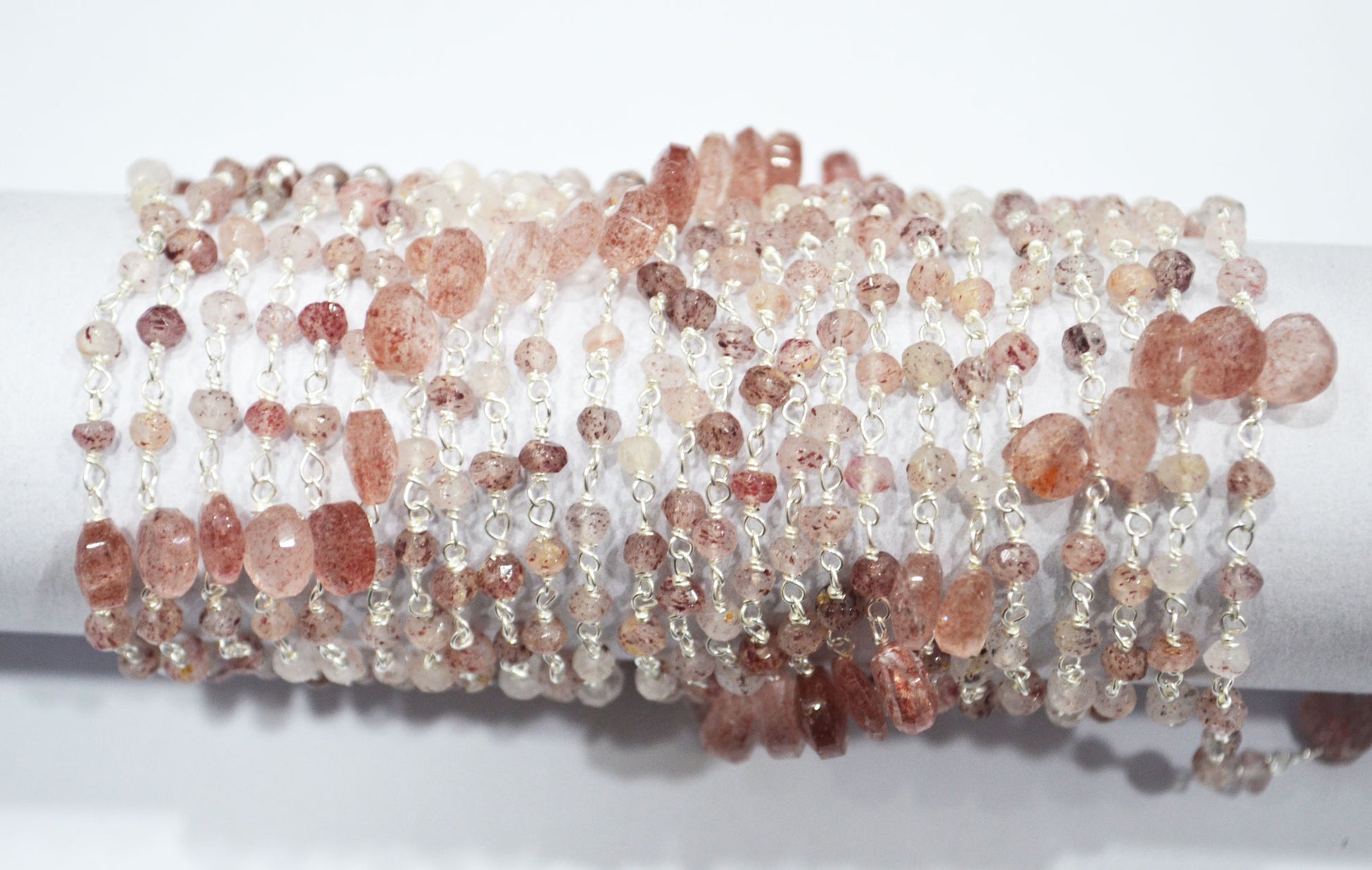 Natural Strawberry Quartz Faceted Heart Shape Rosary Beaded Chain , Strawberry Quartz Faceted Rondelle Shape Wire Wrapped Chain , Sold By Foot , 3 - 3.50 mm , RB-6502