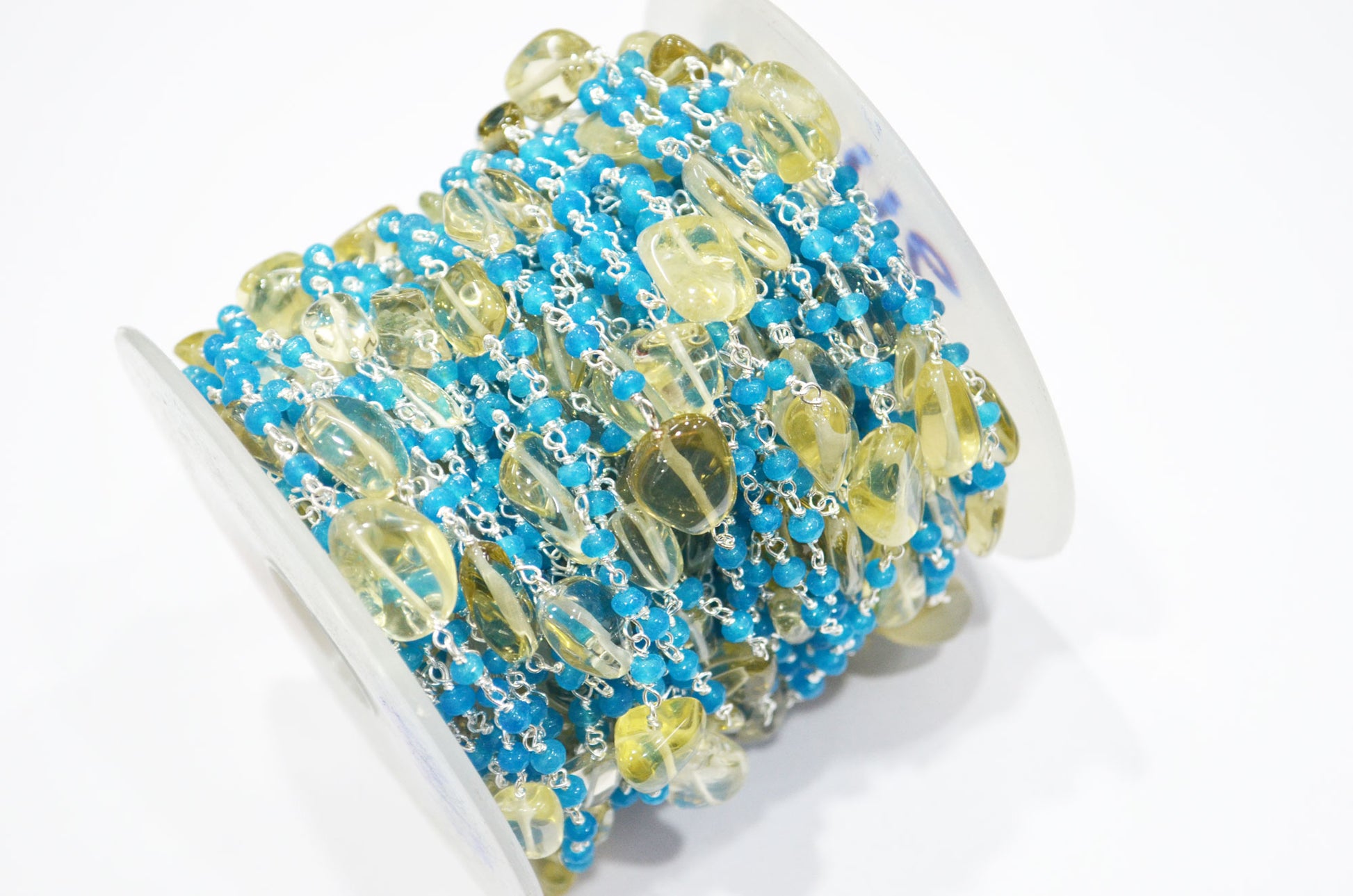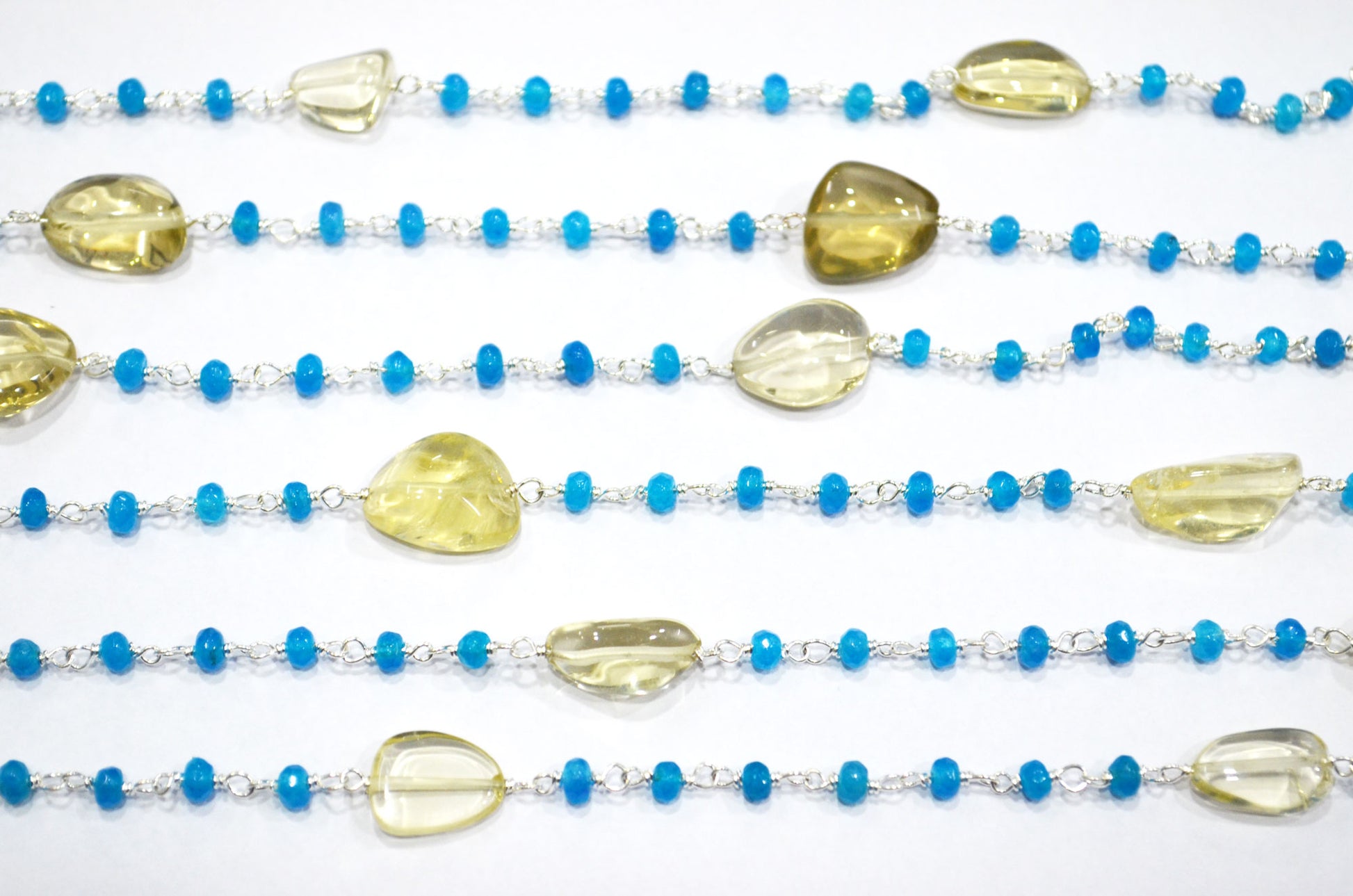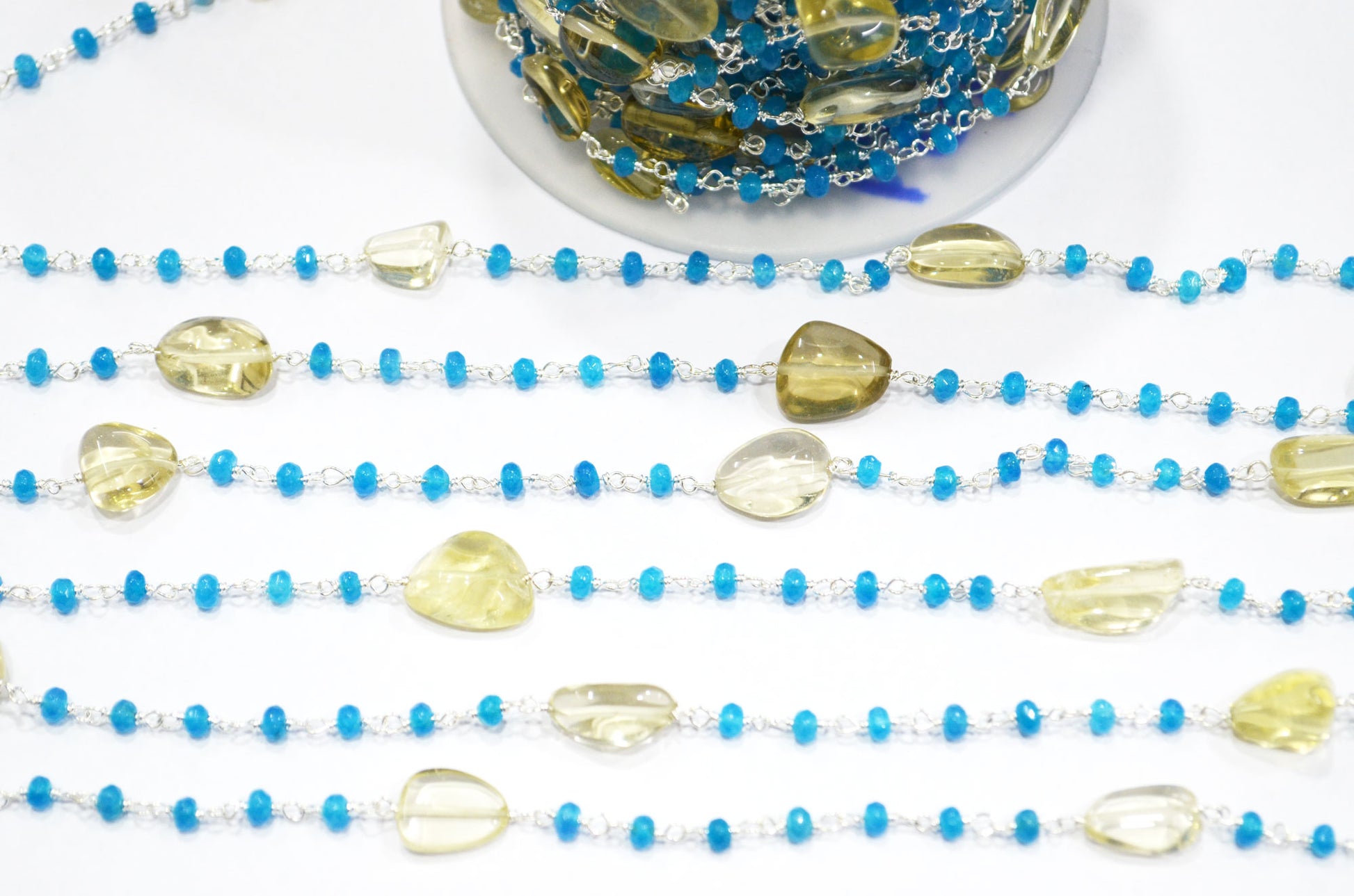 Neon Jade Faceted Rondelle Shape Rosary Beaded Chain , Lemon Quartz Smooth Nuggets Wire Wrapped Chain , 4 mm , RB-6017