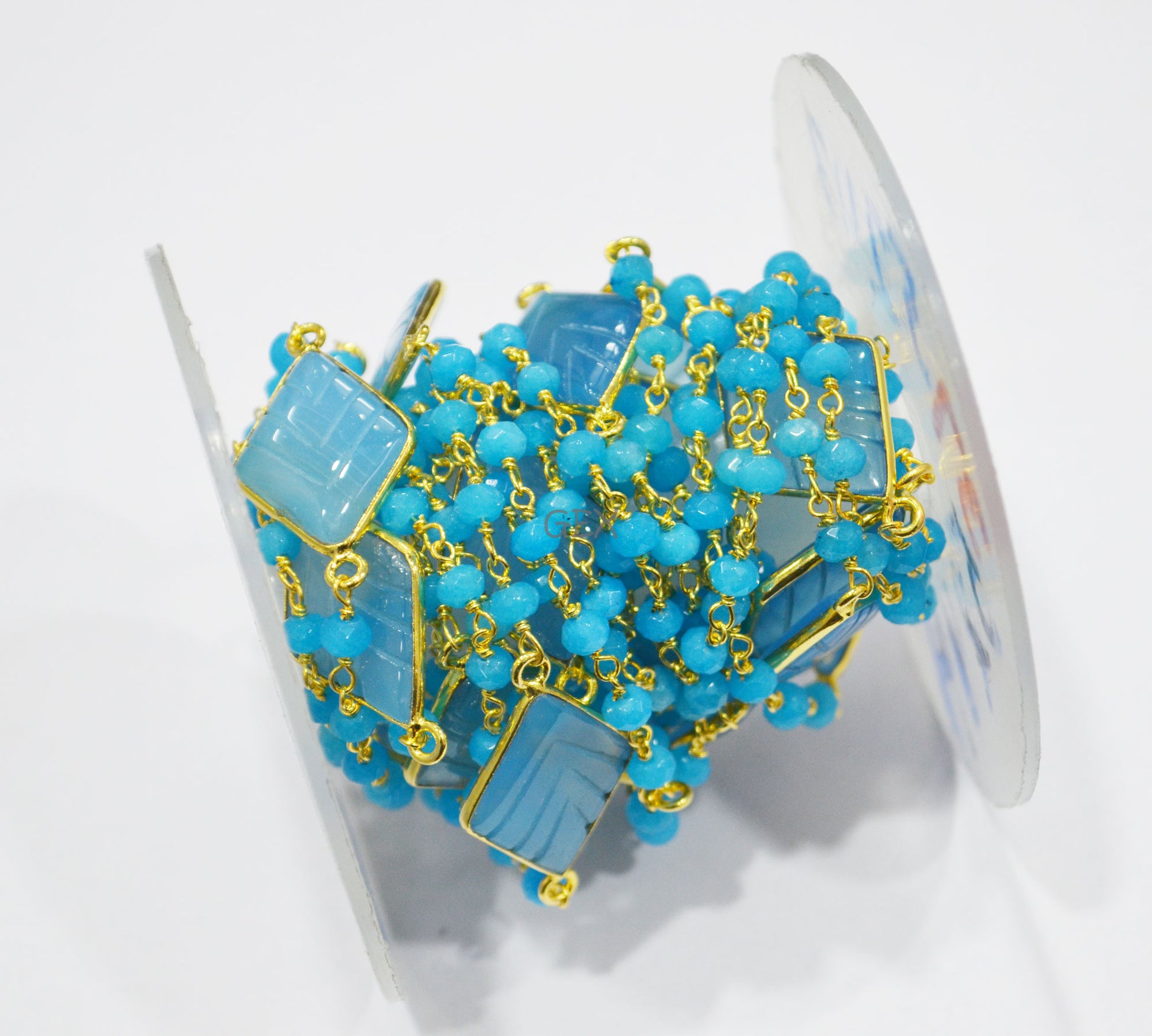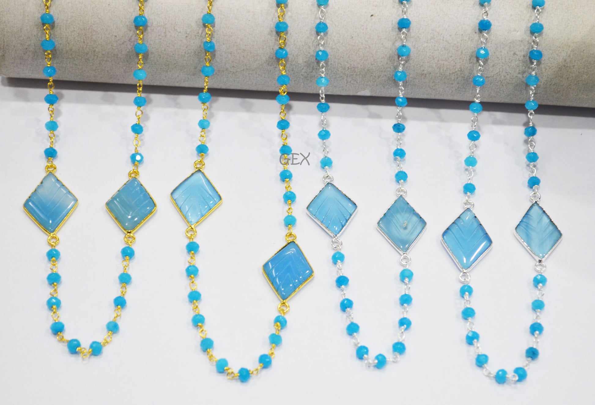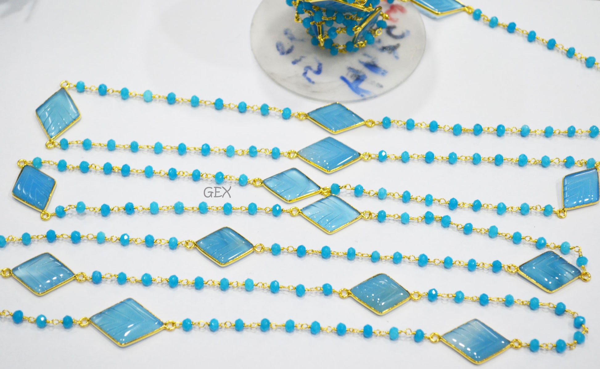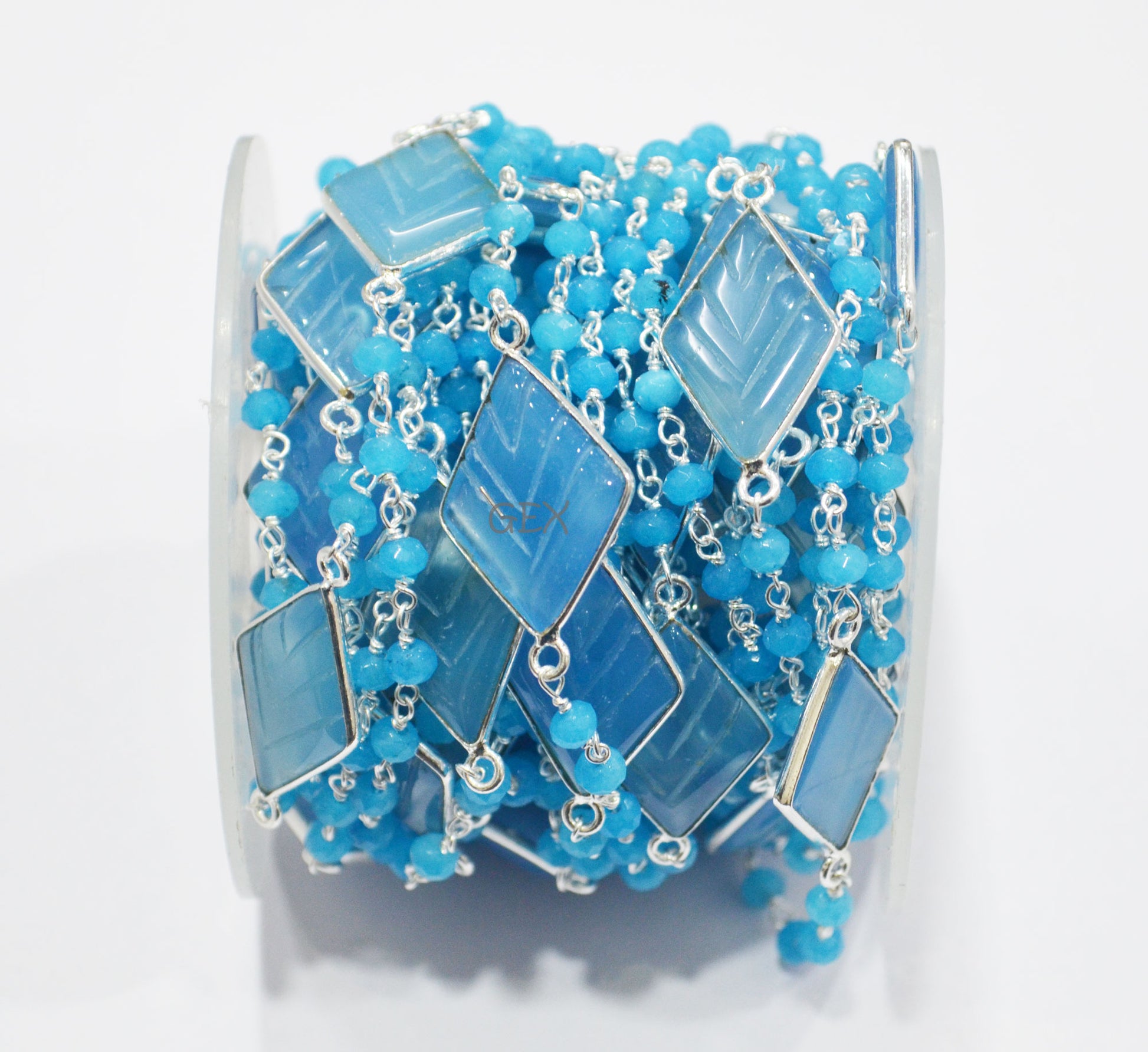 Neon Jade Faceted Rondelle Shape Rosary Beaded Chain , Neon Chalcedony Carved Diamond Shape Connector Wire Wrapped Chain , 4 mm , RB-7165