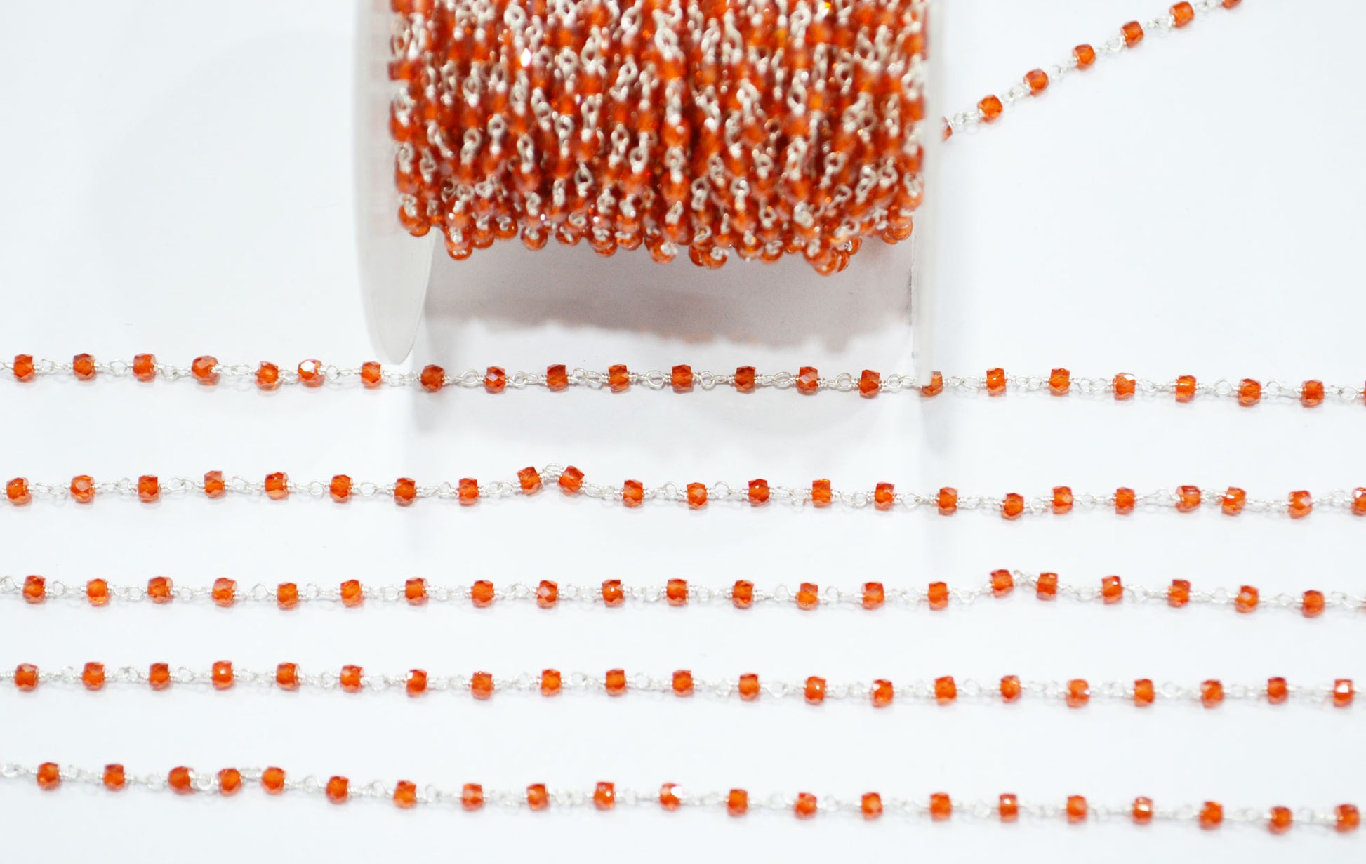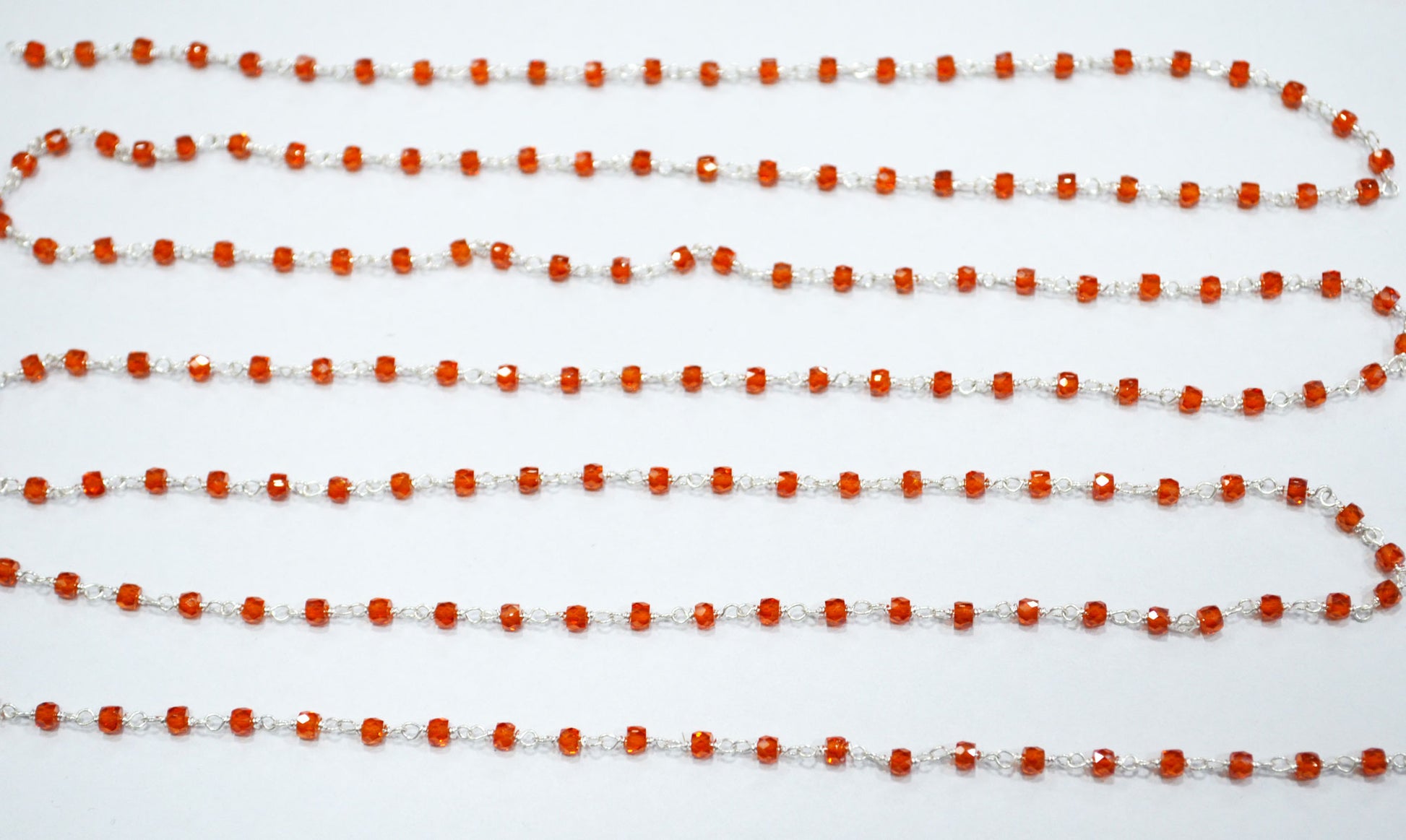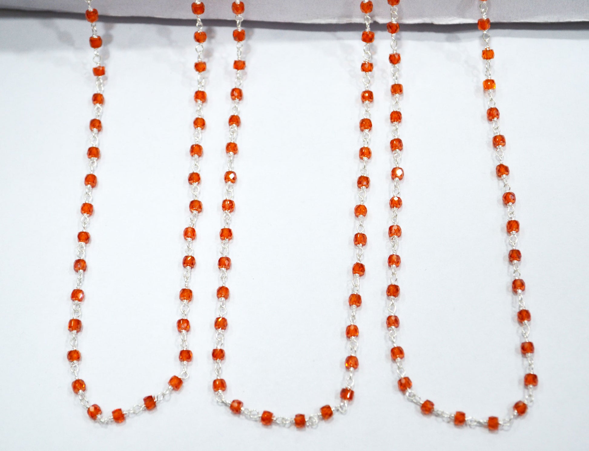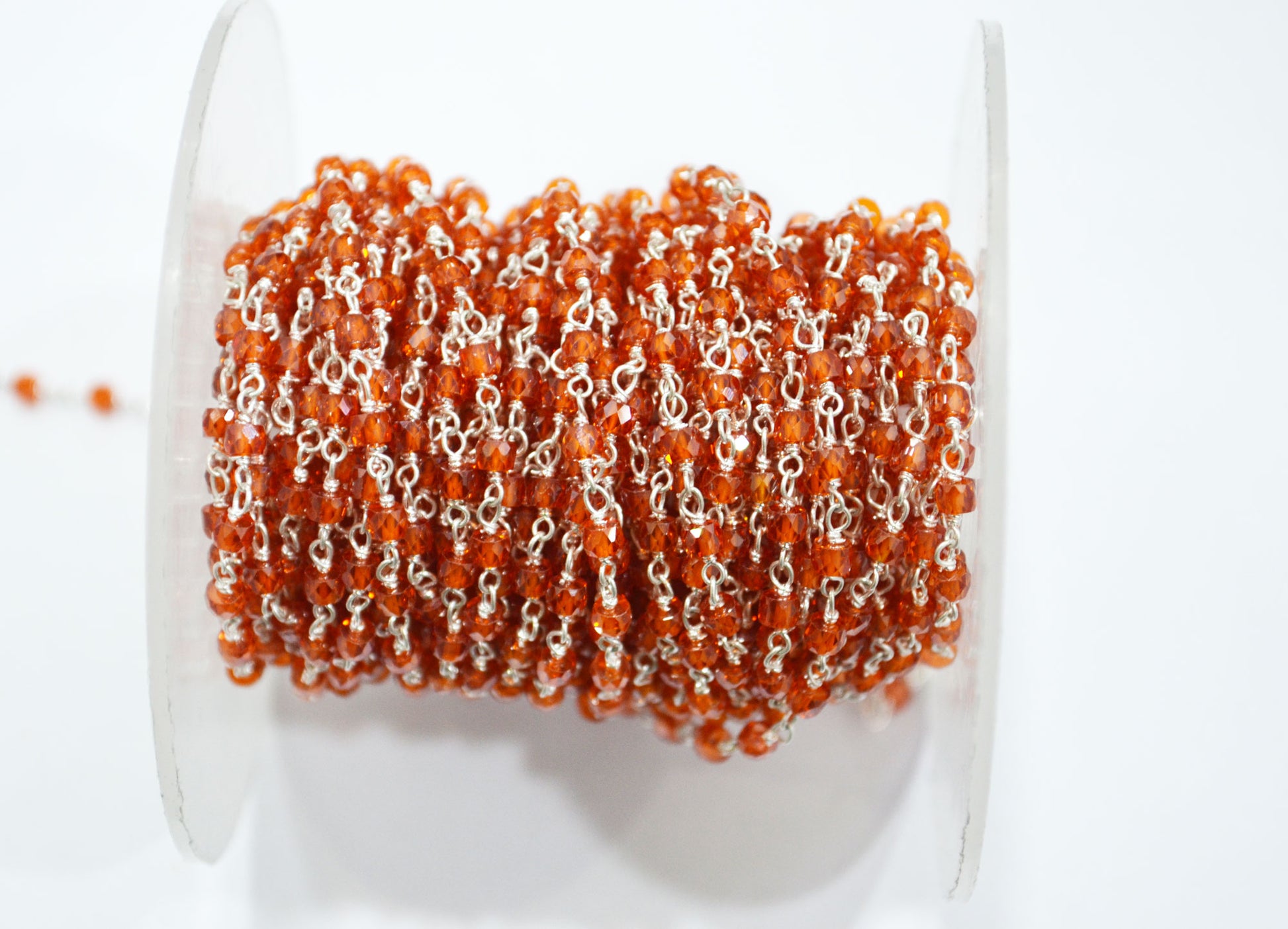 Orange Cubic Zircon Faceted Rondelle Shape Rosary Beaded Chain , Orange Cubic Zircon Wire Wrapped Chain , Sold By Foot , 3 mm , RB-6486