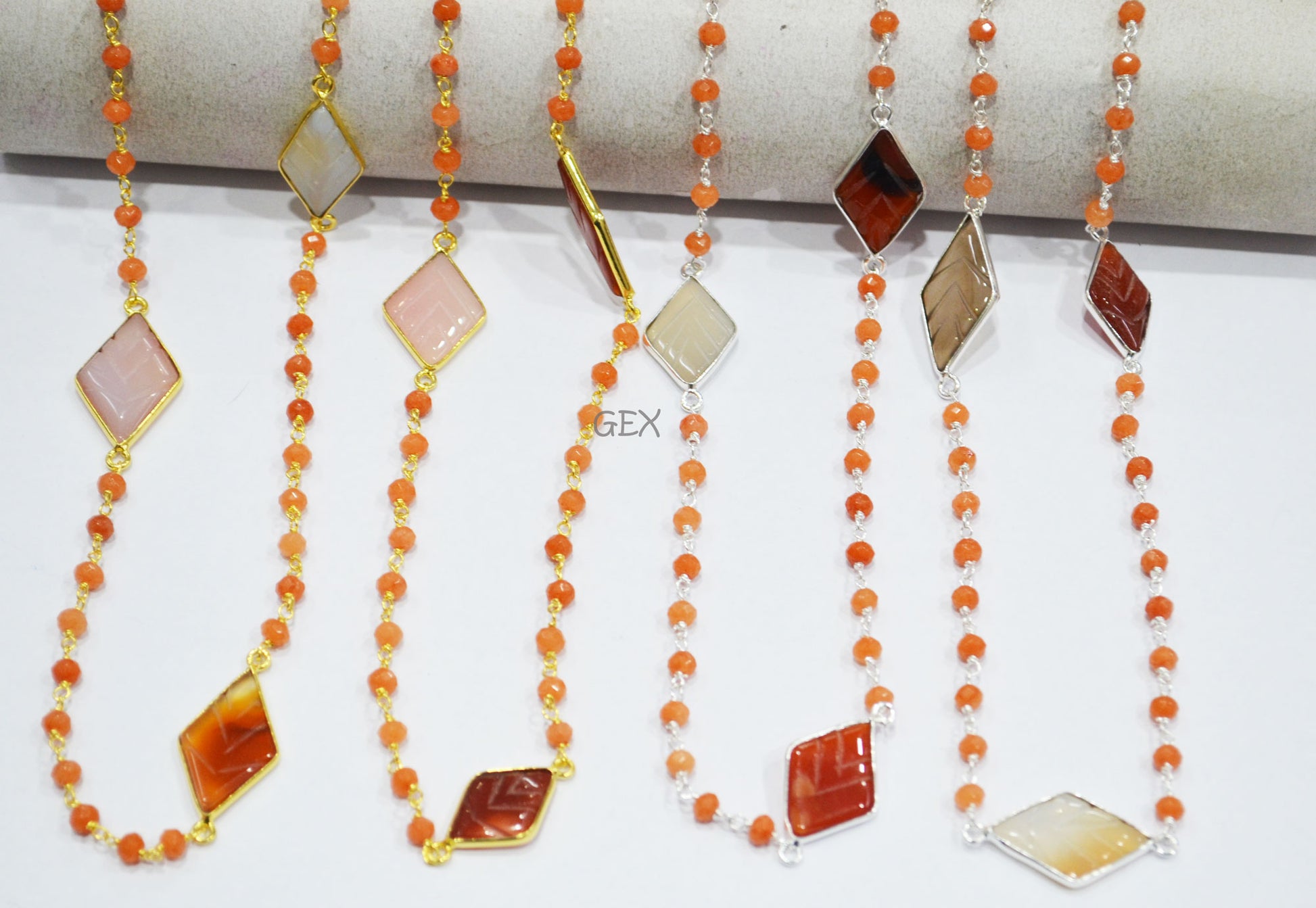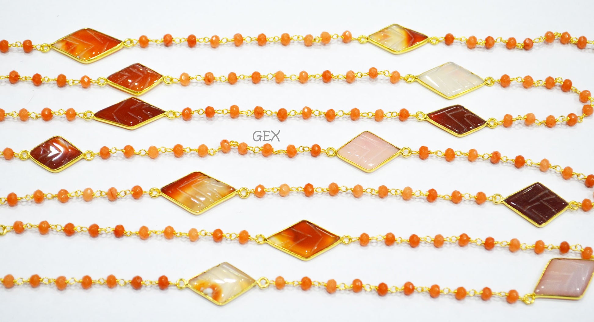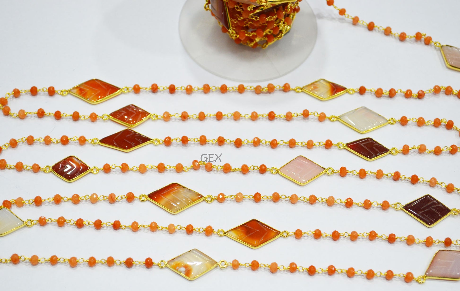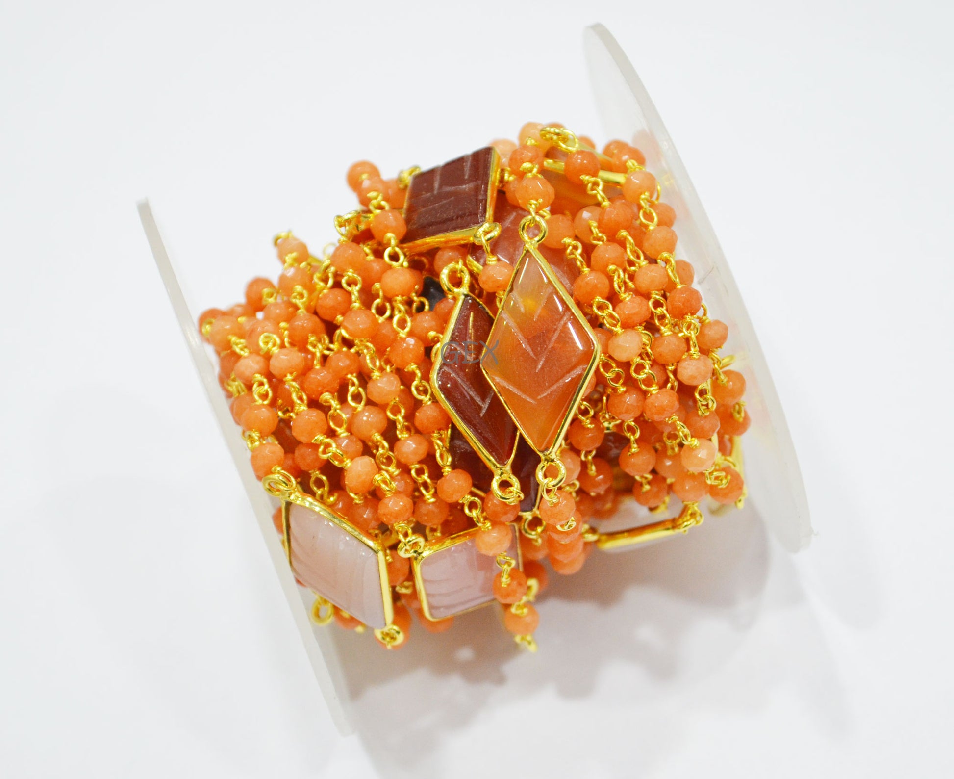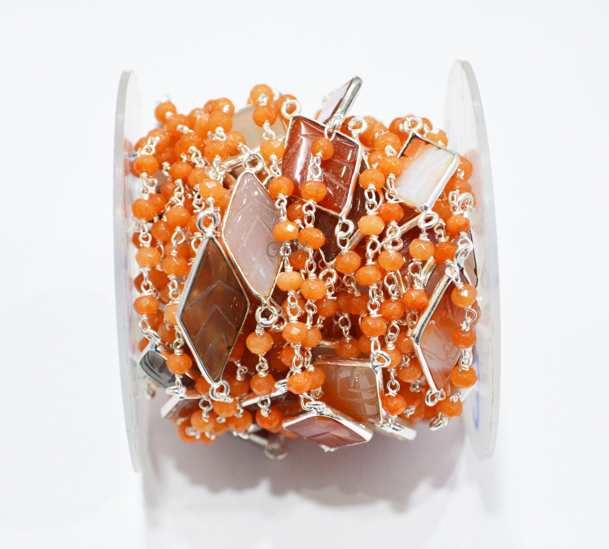 Orange Jade Faceted Rondelle Shape Rosary Beaded Chain , Orange Chalcedony Carved Diamond Shape Connector Wire Wrapped Chain , 4 mm , RB-7167