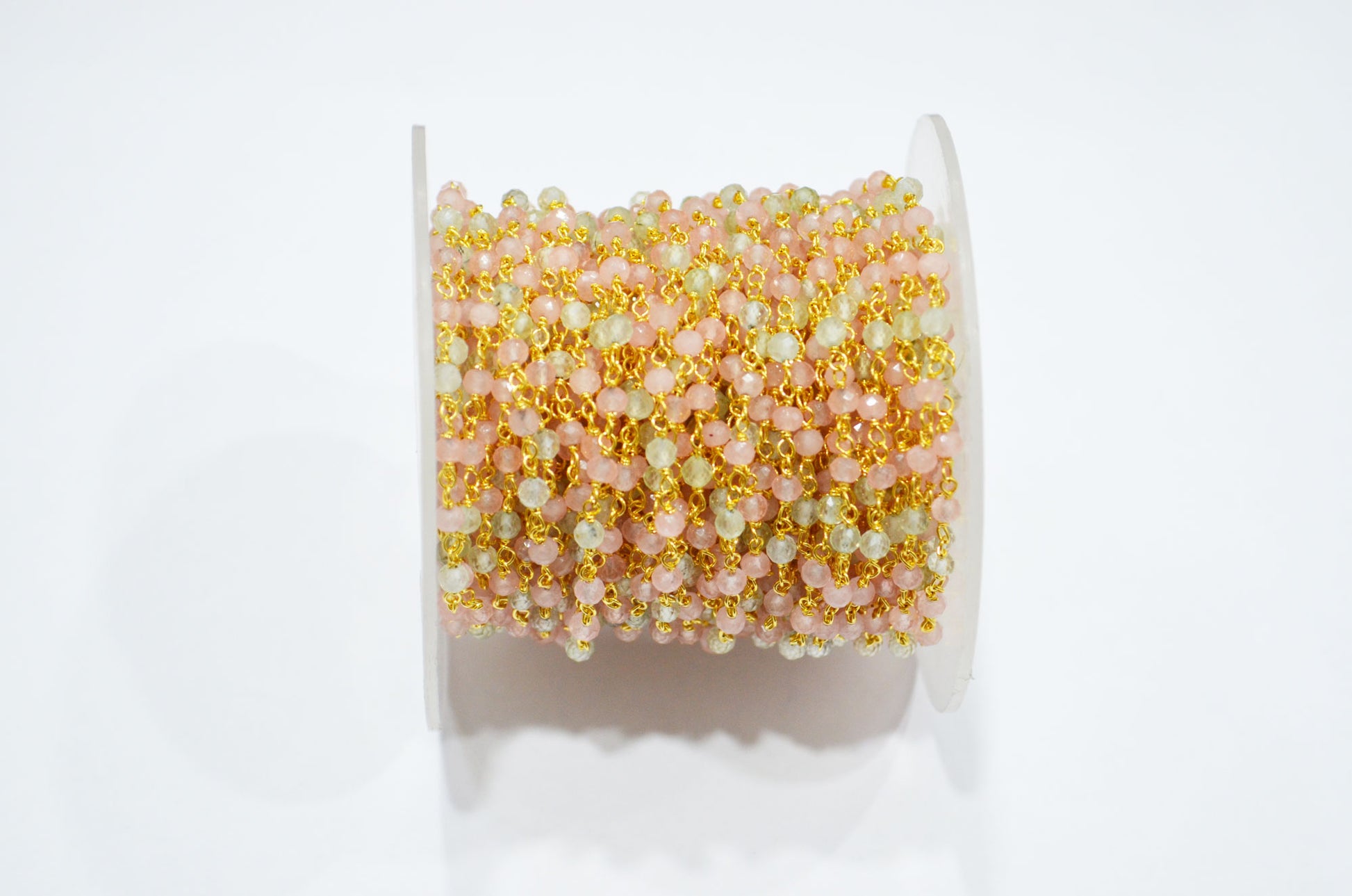 Pastel Rose Quartz And Prehnite Round Shape Rosary Beaded Chain , Pastel Rose Quartz And Prehnite Faceted Wire Wrapped Chain , 3 mm , RB-7376