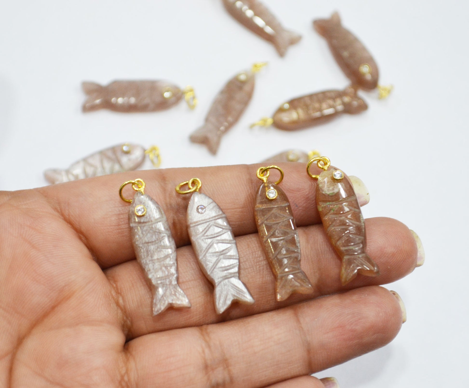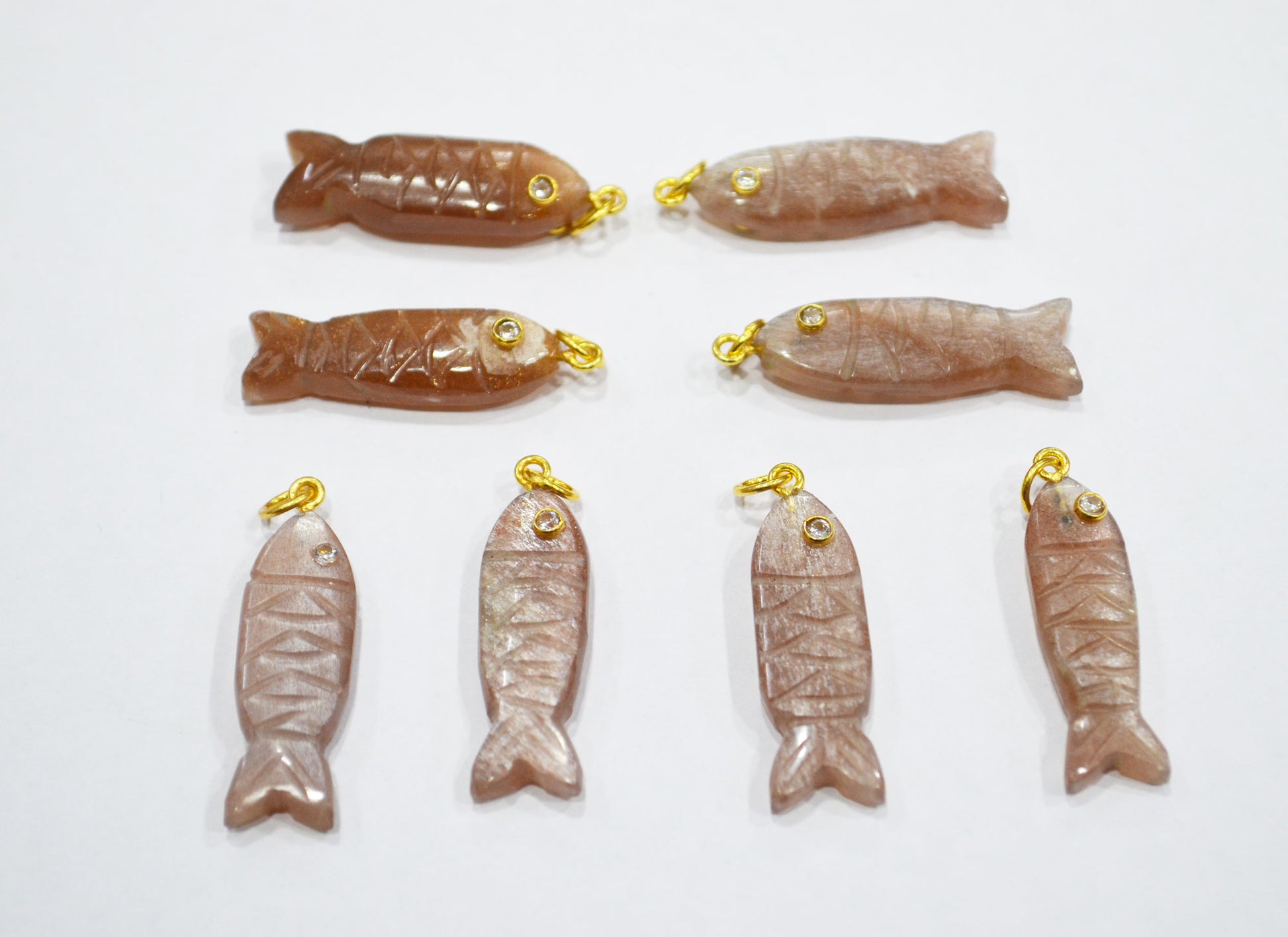 Peach Moonstone Carved Fish Shape Connector , Peach Moonstone With White Cubic Zirconia Single Bail Bezel Pendant , Sold By Piece , 9x31 mm , 32491