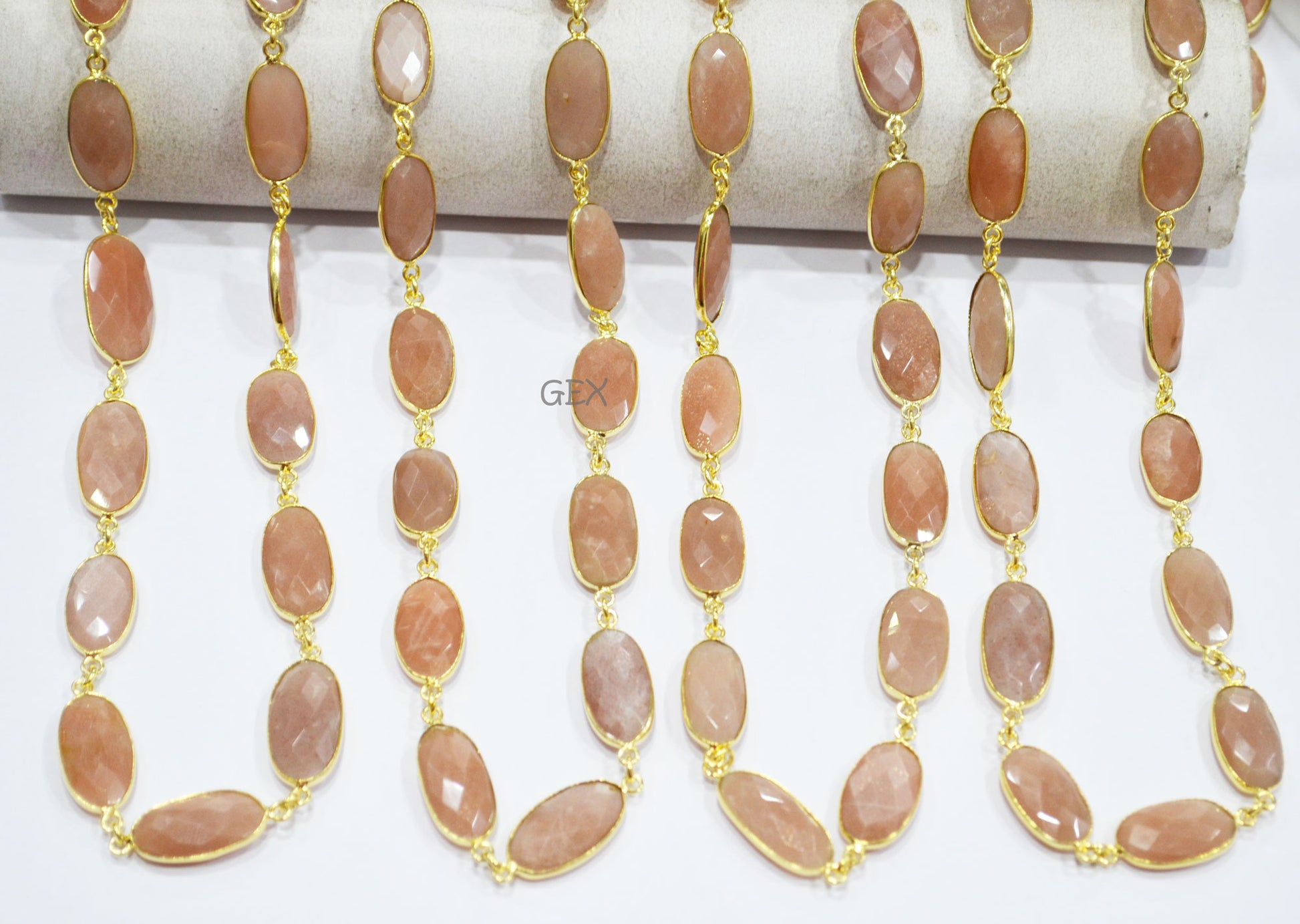 Peach Moonstone Faceted Oval Shape Connector Chain , Peach Moonstone Oval Shape Bezel Link Chain , 10x17 - 12x23 mm , RB-7200