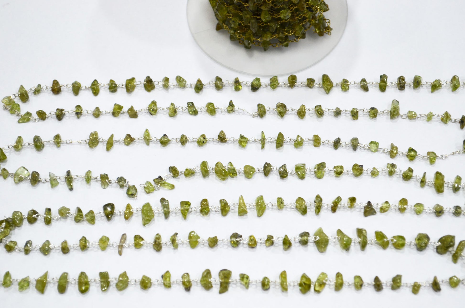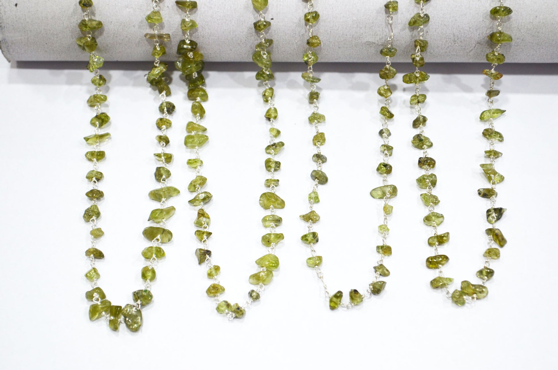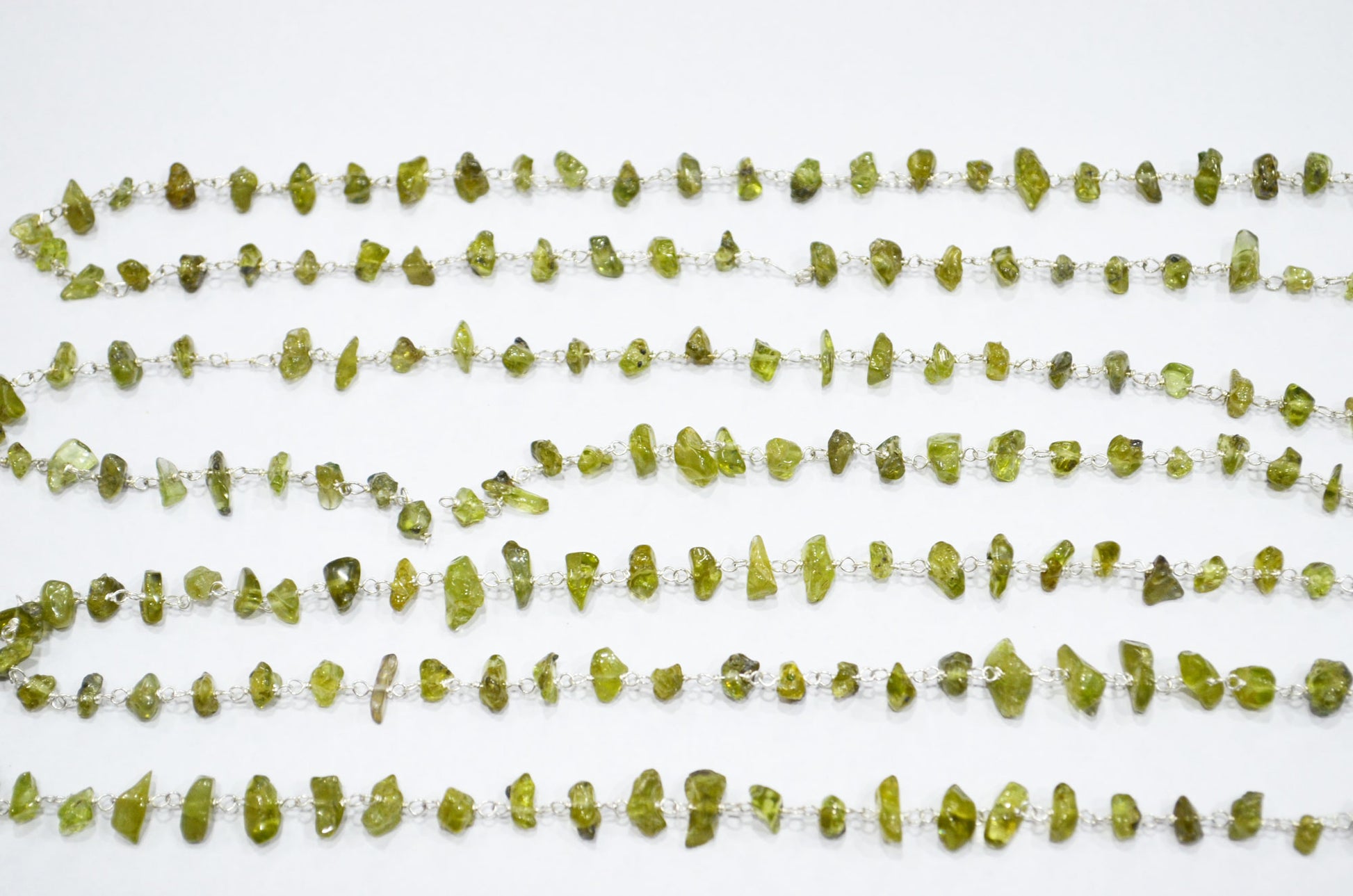 Peridot Organic Polished Irregular Flat Chips Rosary Beaded Chain , Peridot Rough Nuggets Chips Wire Wrapped Chain , 2 - 4 mm , RB-5896